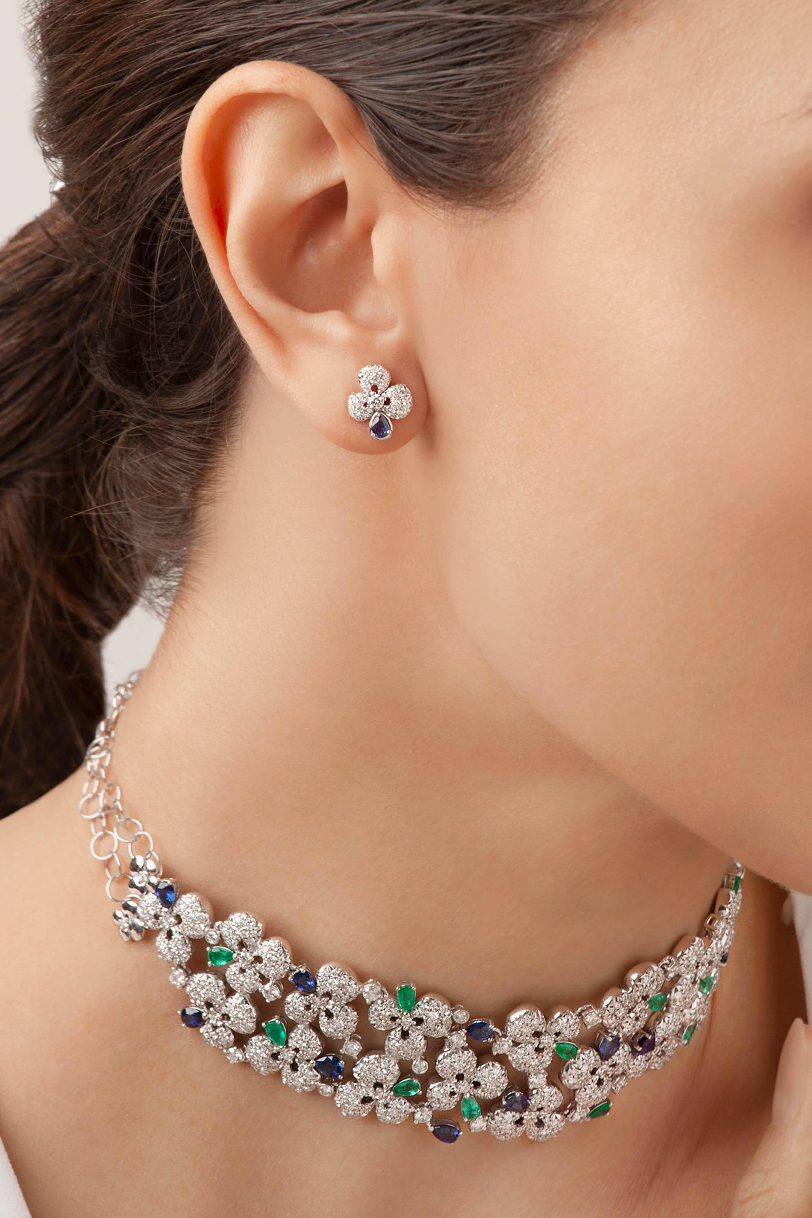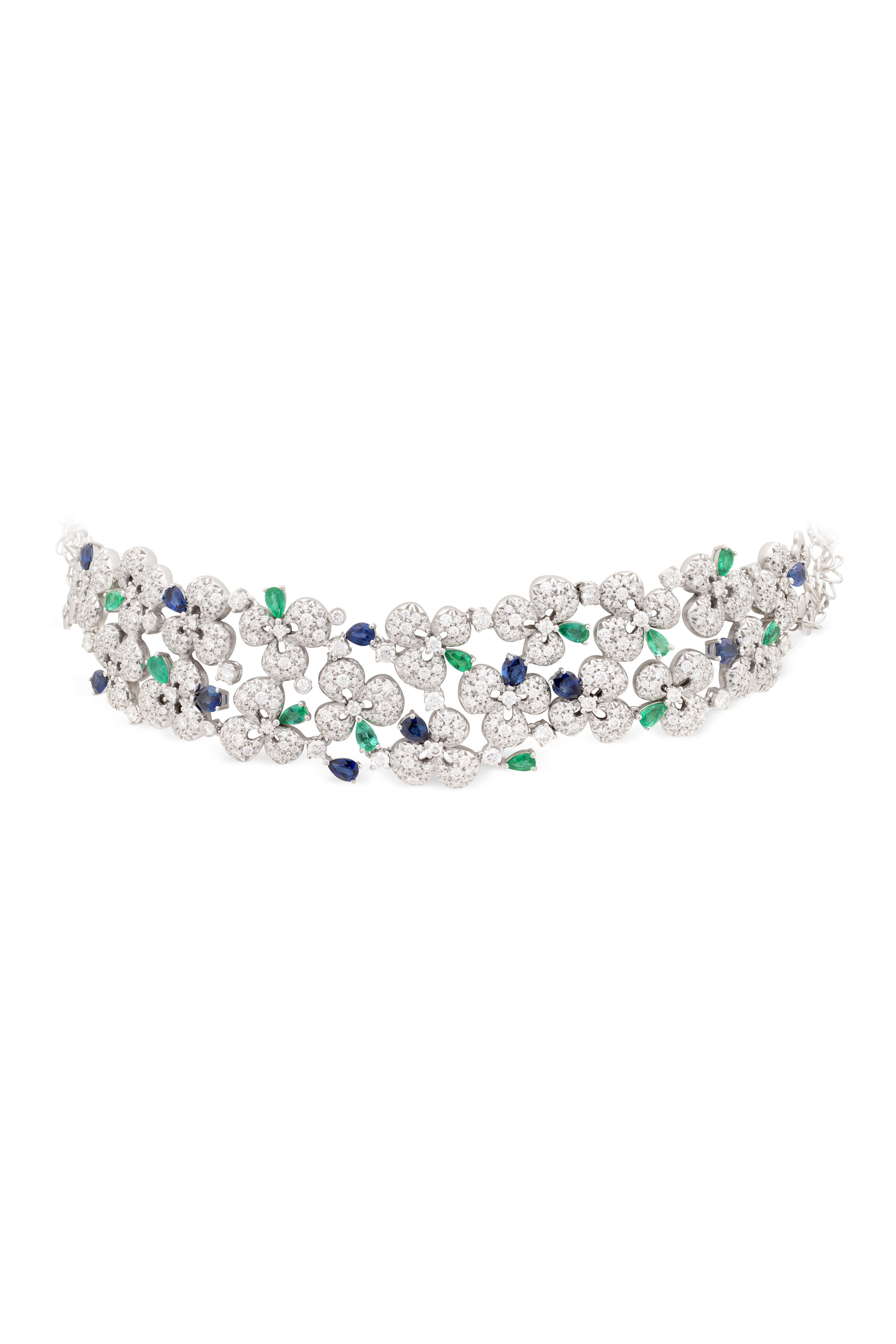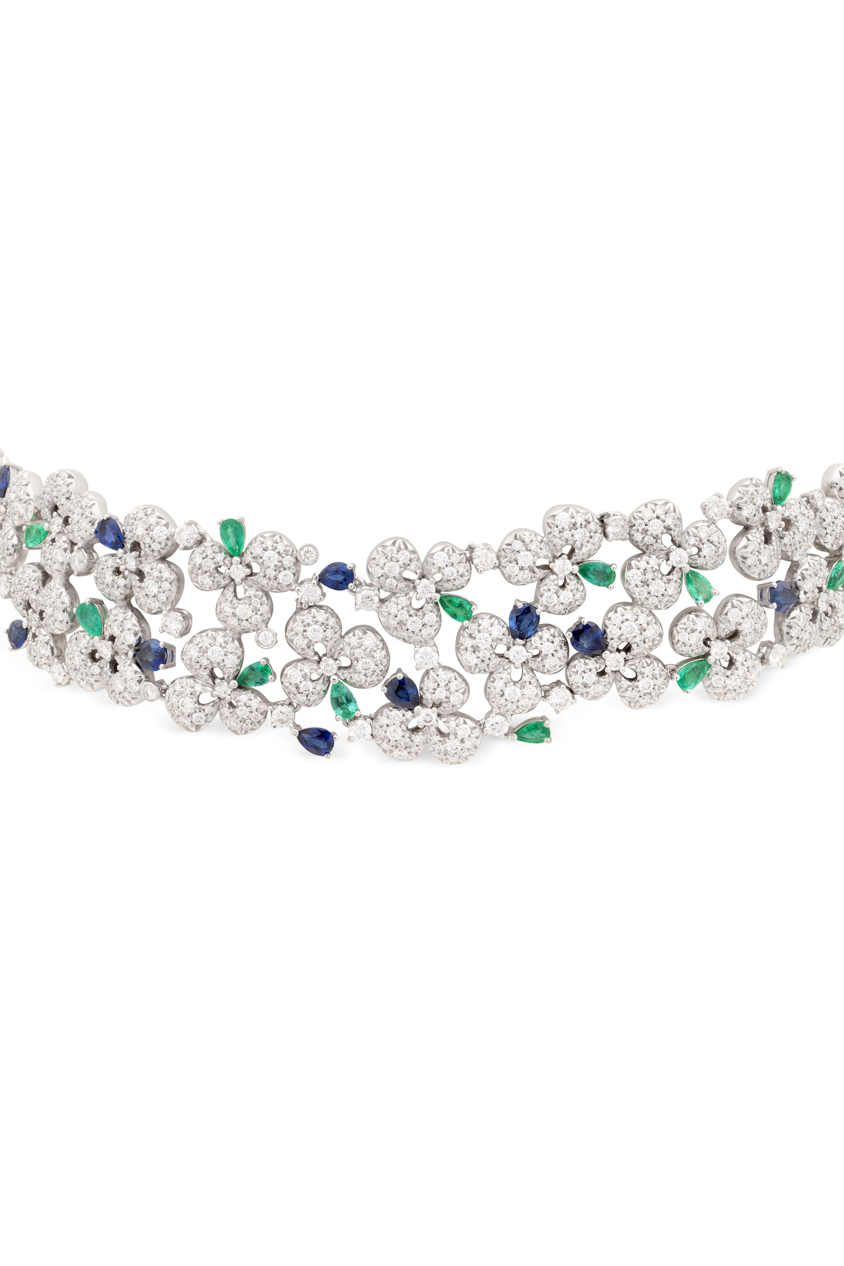 18k White Gold. 6.54 ct Sapphire. 15.27 ct Diamond. 5.43 ct Emerald.