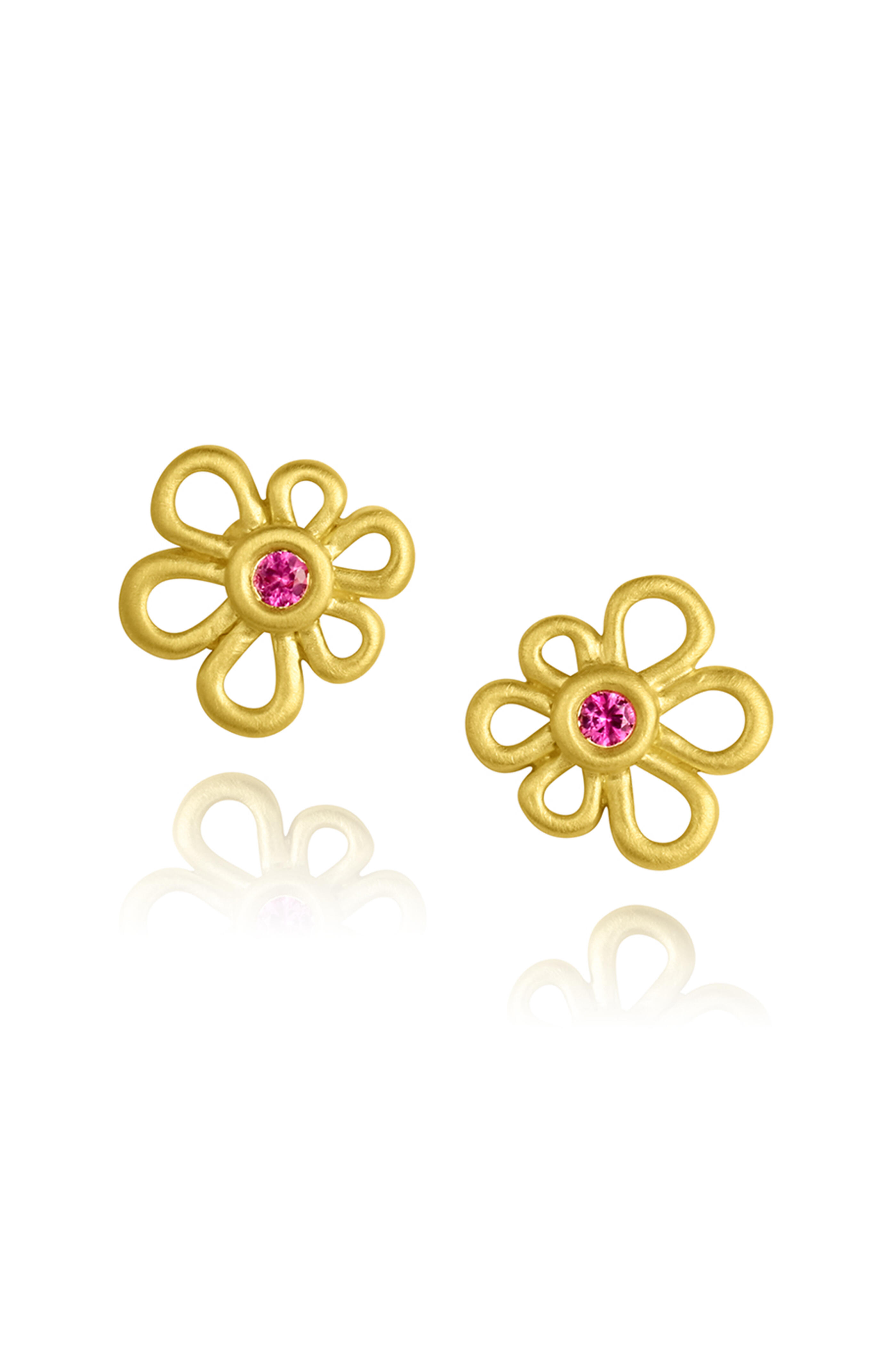 18k Yellow Gold. Satin Finish. 0.07 ct Heated Pink Sapphire.
