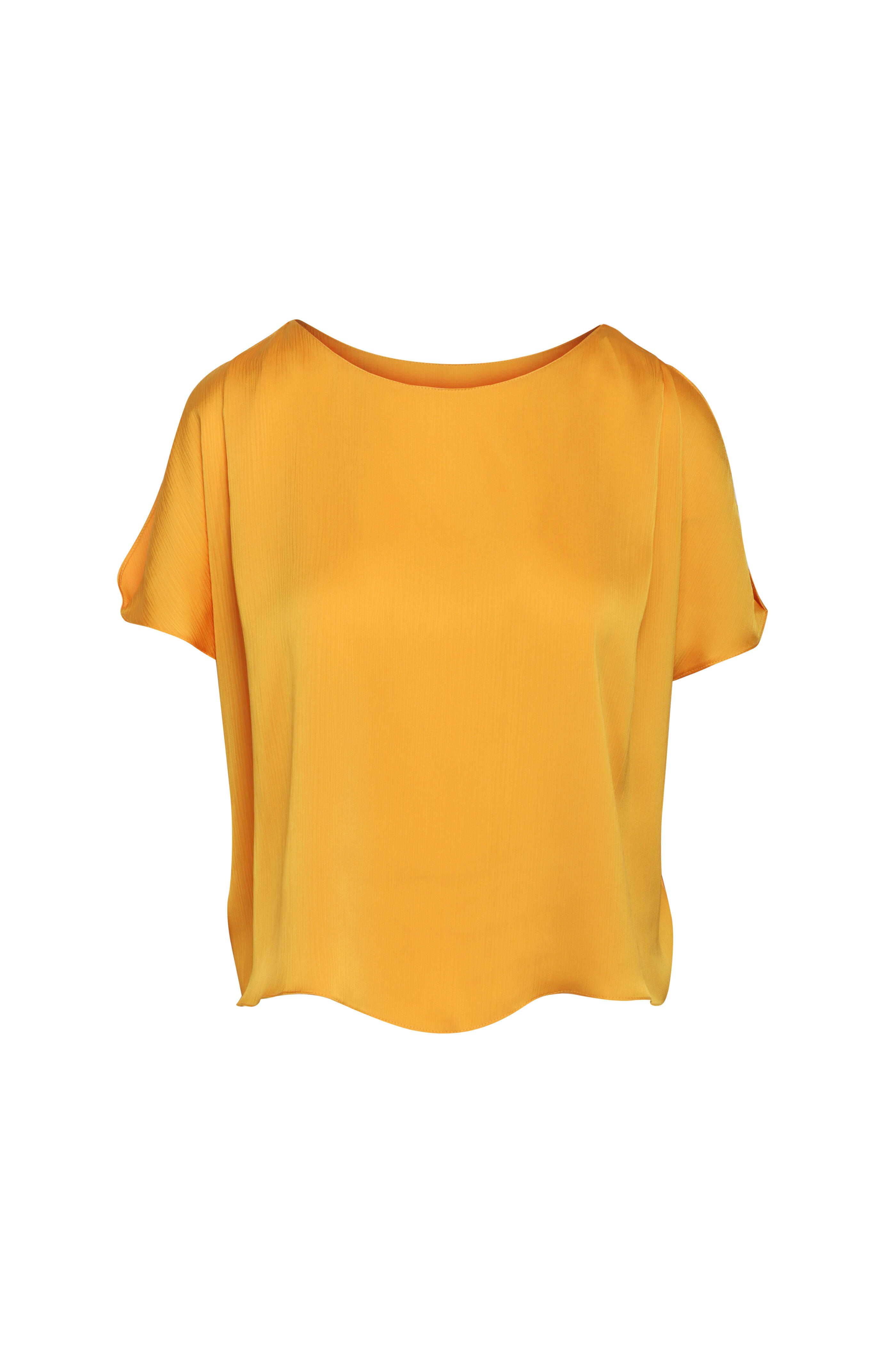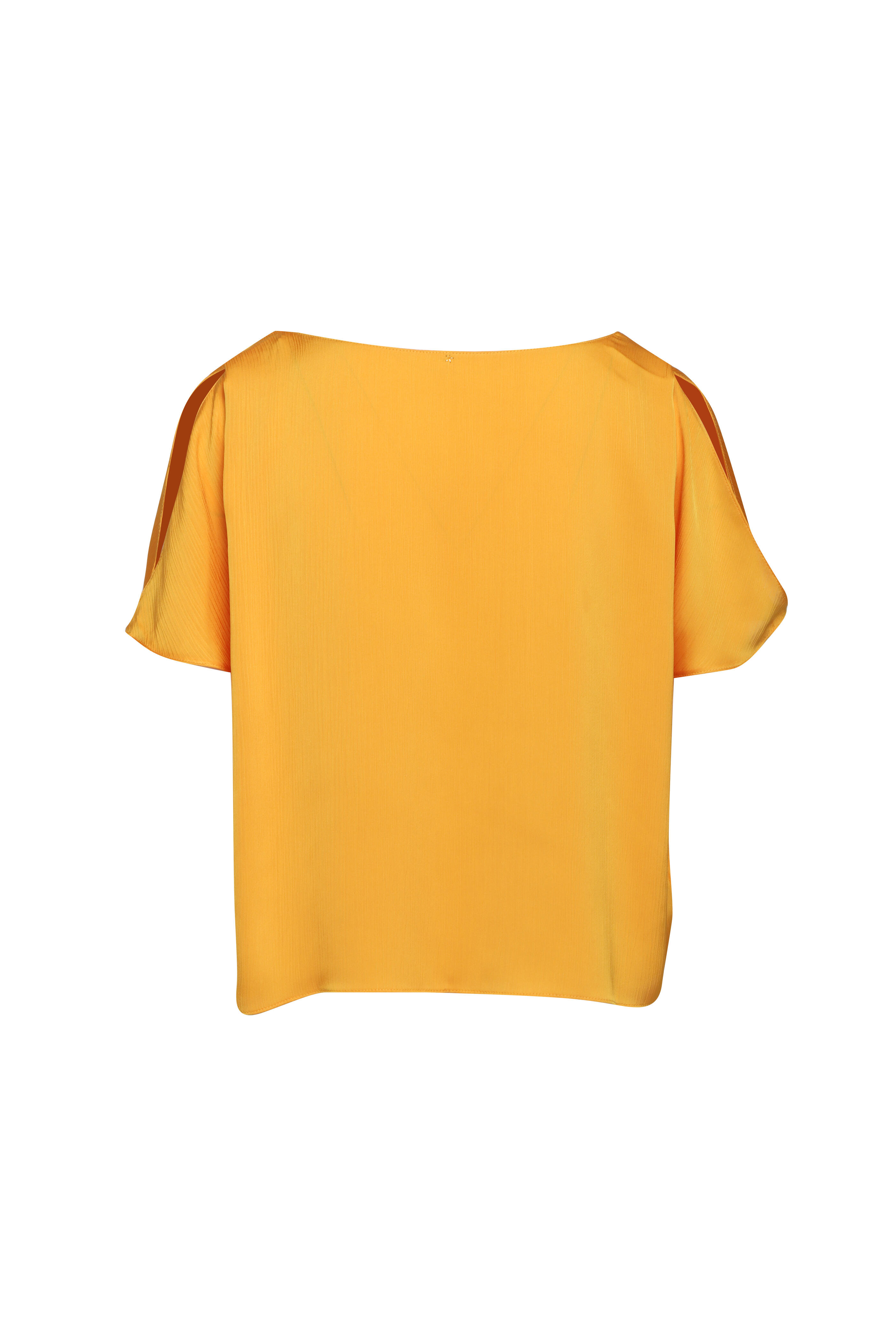 Round neck. Short dolman sleeves; split sleeve detail. Boxy fit. Made in USA. Cropped length. 100% polyester. Dry clean.