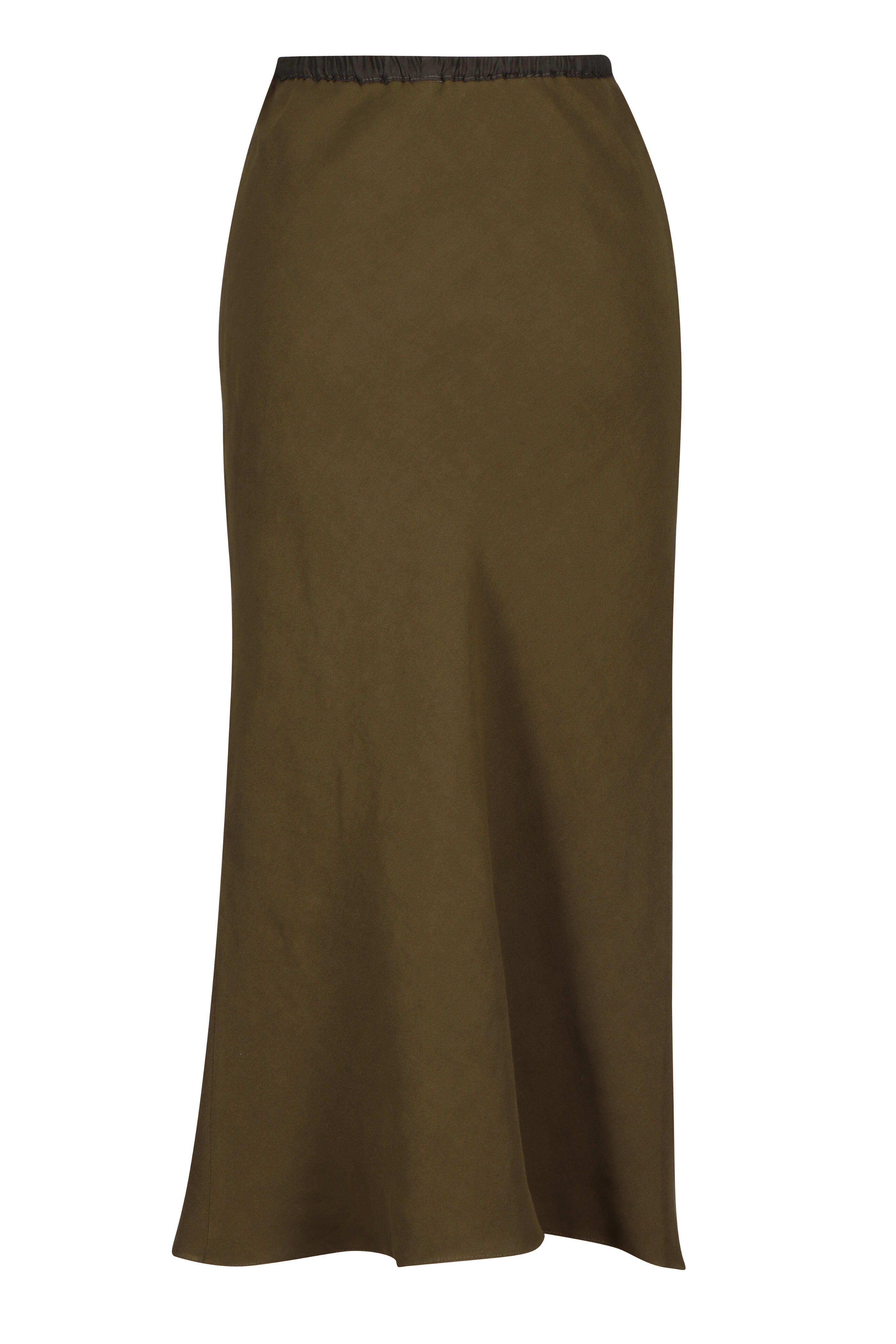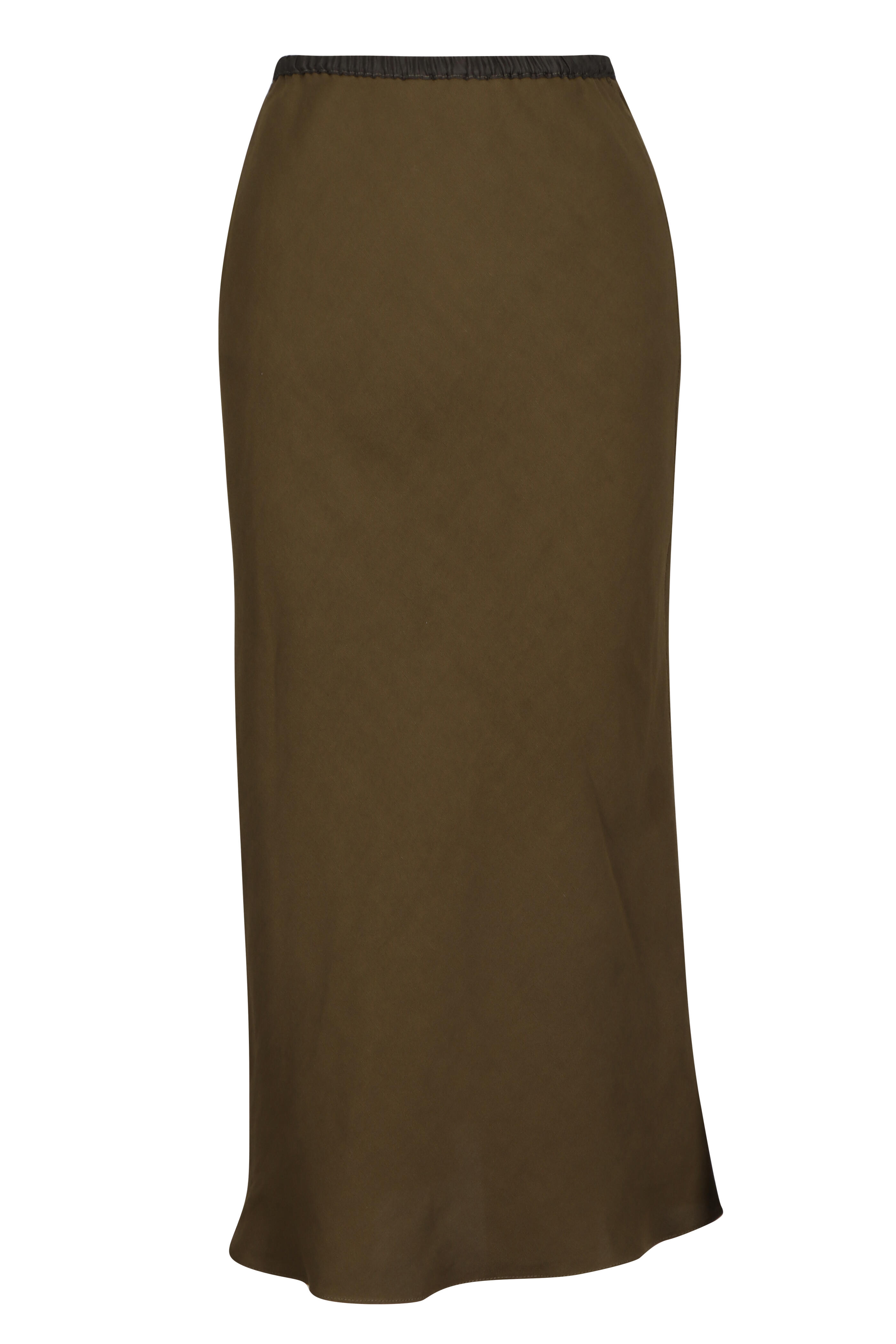 Elasticized waist. Made in USA. Midi length. 100% silk. Dry clean.