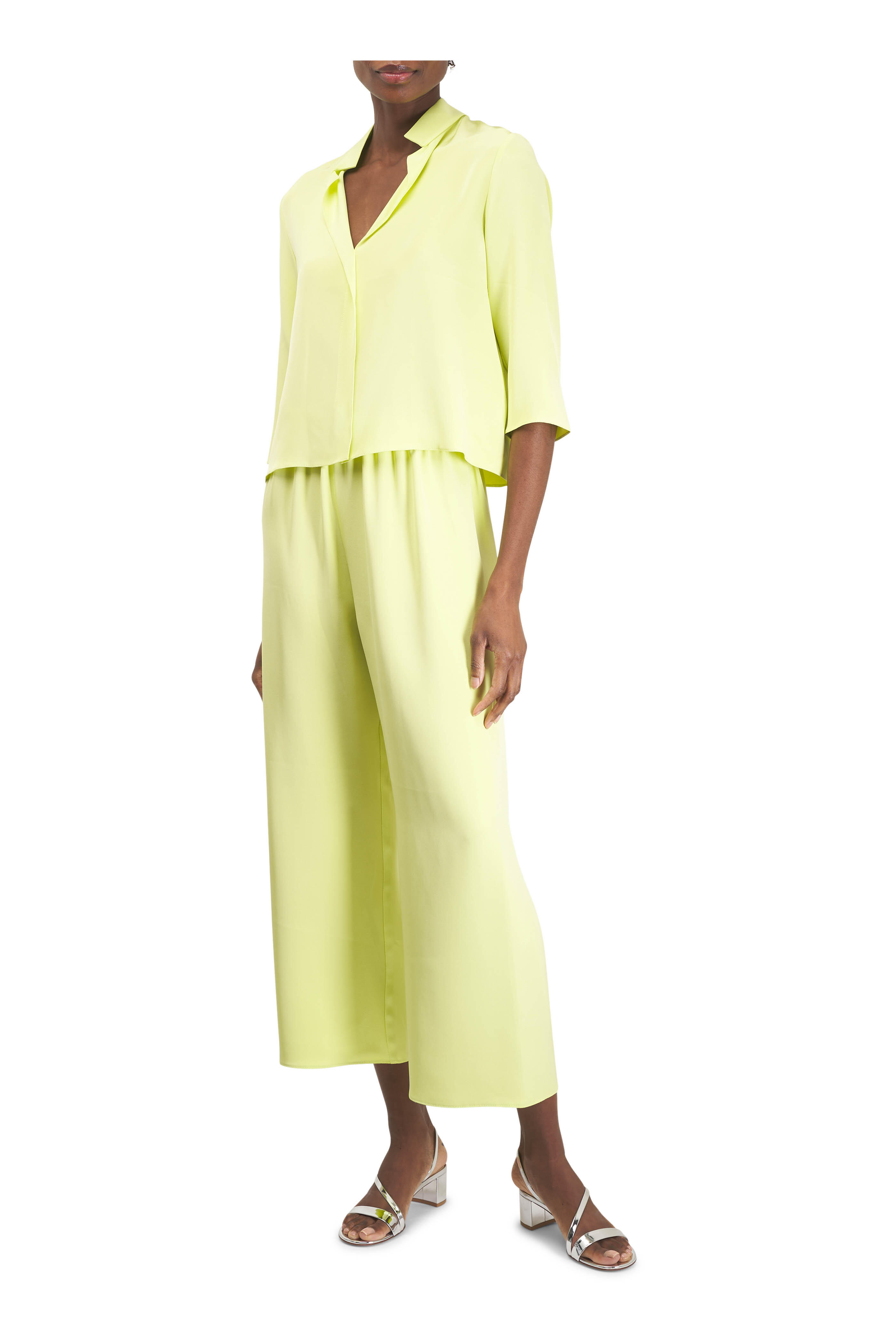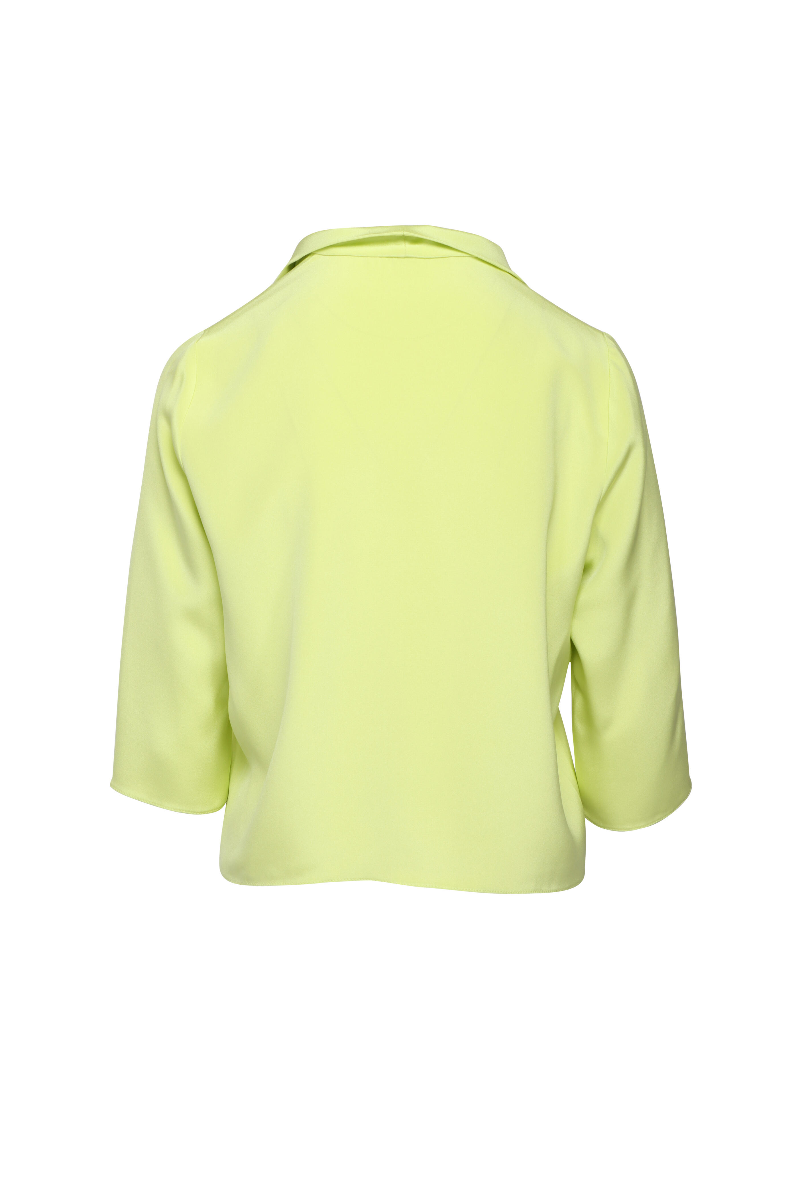 Notch collar. V Neck. ¾ length sleeves. Center front foldover detail. Relaxed fit. Straight hem. Made in USA. 100% silk. Dry clean.