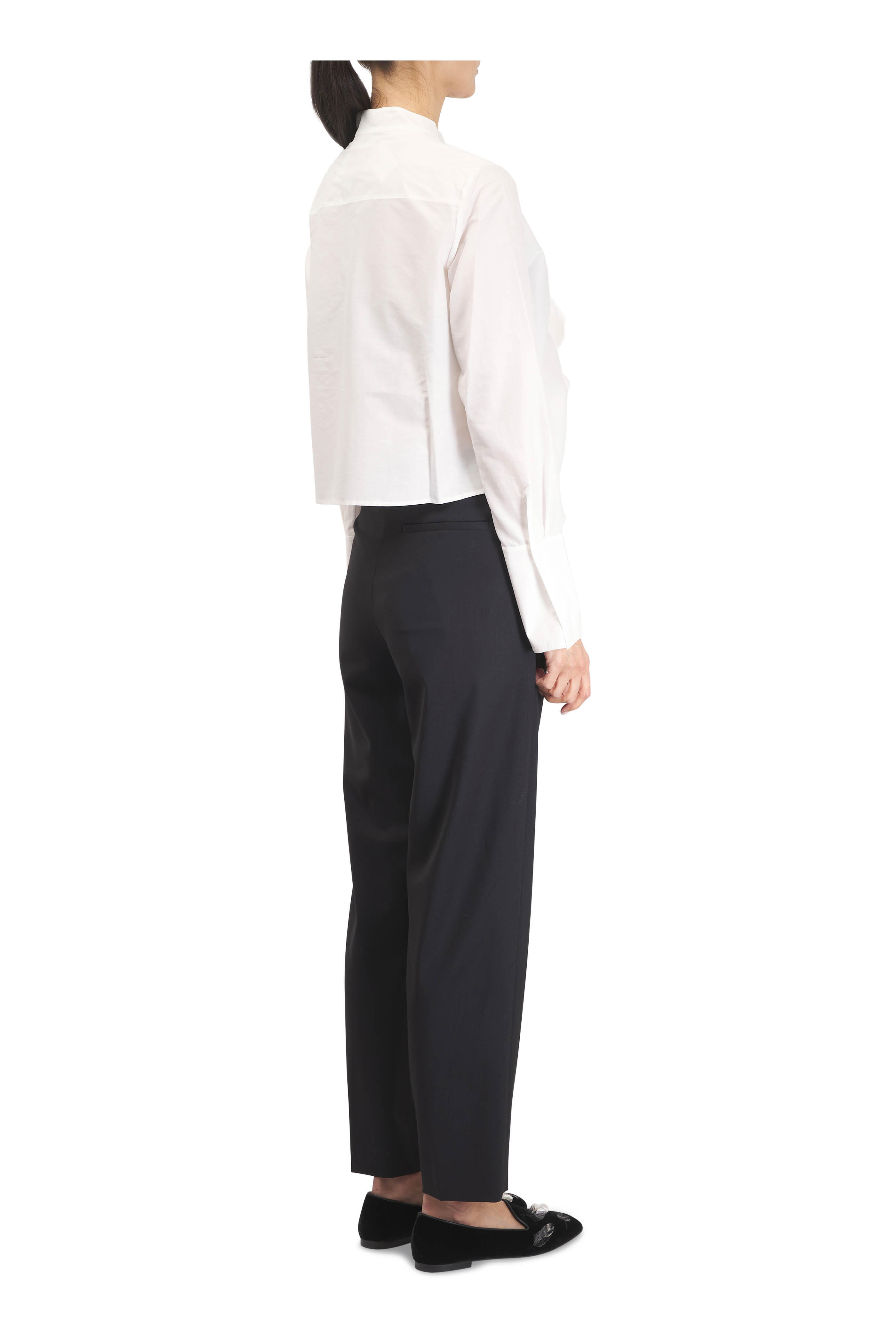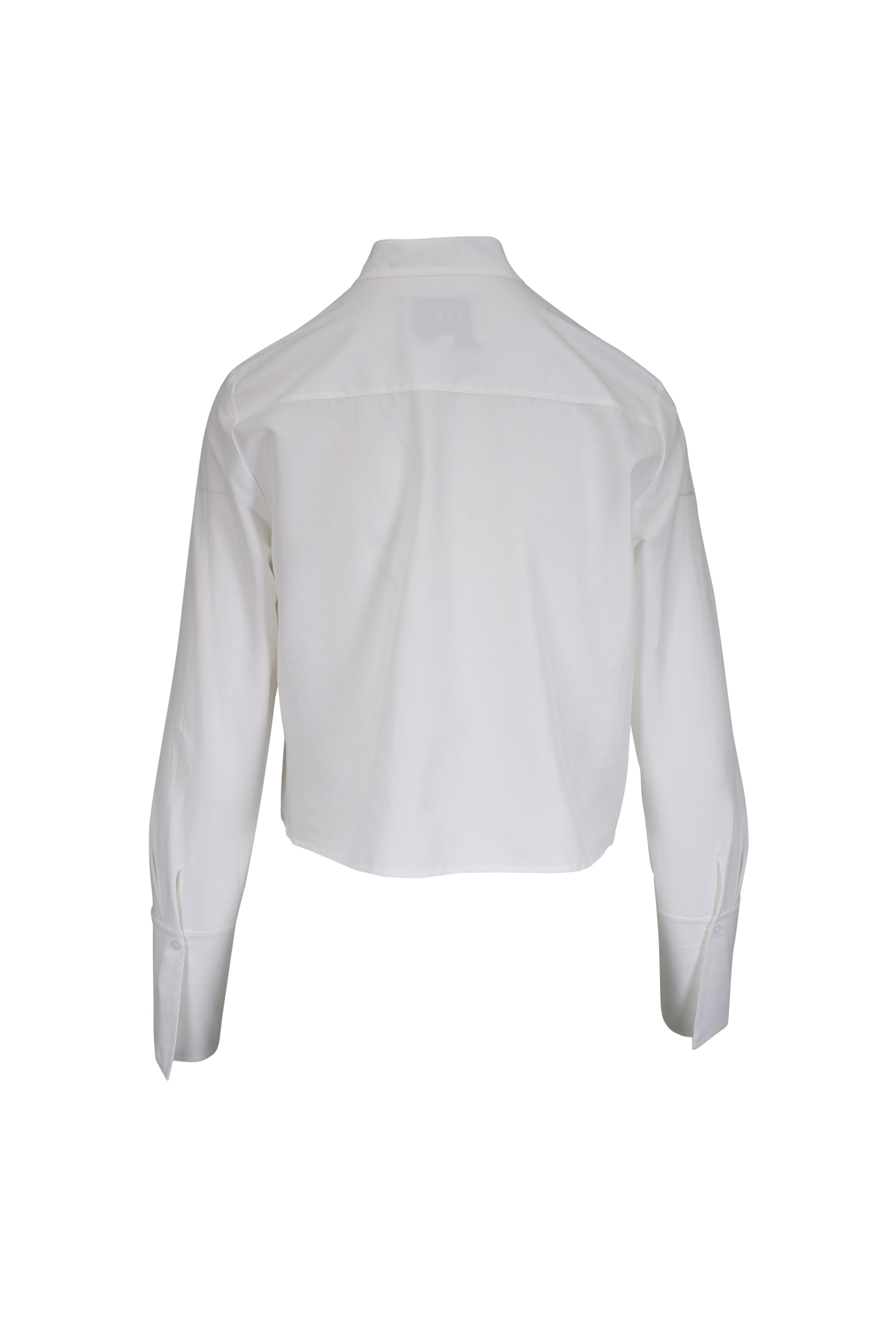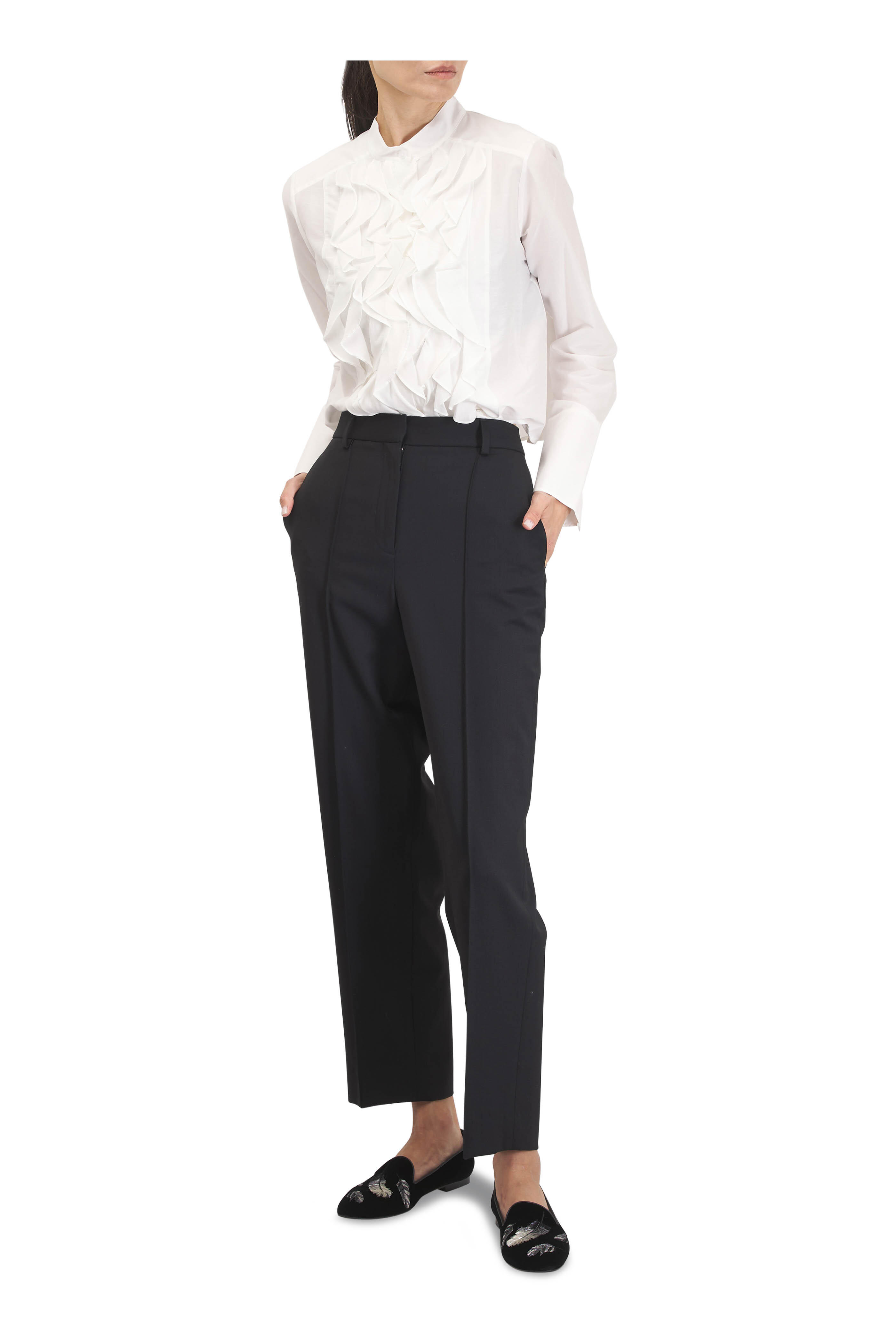 Stand collar. Concealed front placket; ruffled bib. Single button cuffs. Straight hem. Imported. Shoulder to hem 20" (size xs). 79% cotton, 21% silk. Dry clean.