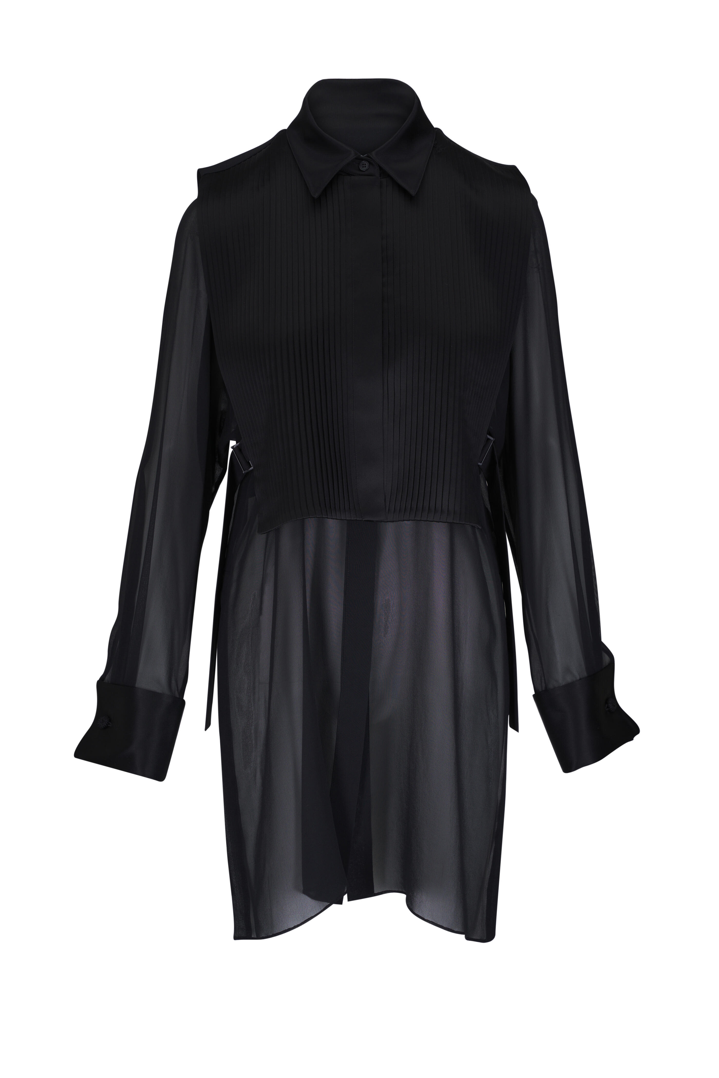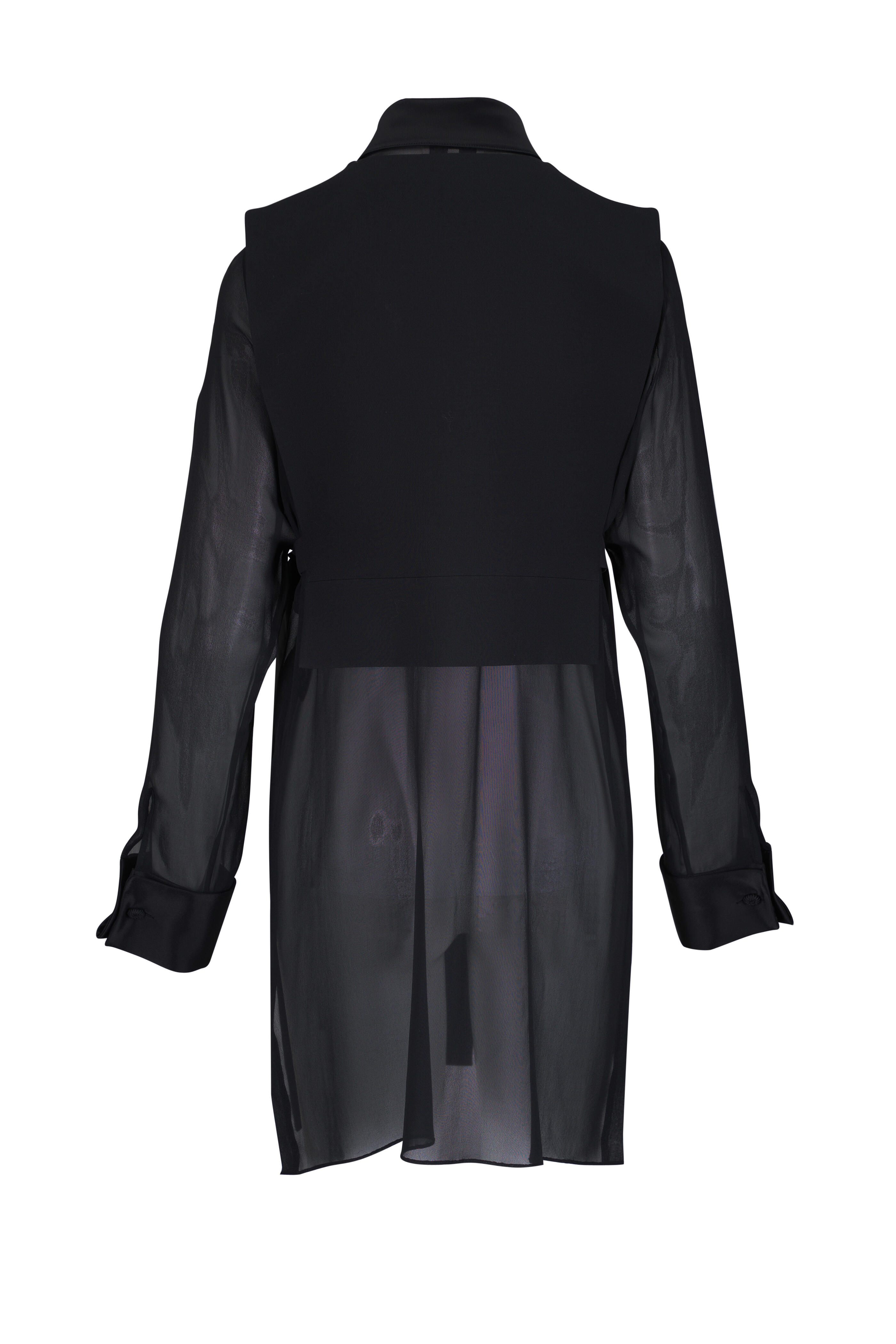 Spread collar. Concealed front button placket. Single button French cuffs. Vented hem. Detachable Vest: Round neckline. Concealed front button placket. Adjustable D-ring ties fasten at sides. Pintuck front. Lined. Imported. Approximately 35" shoulder to hem (measurements taken from size M). Blouse: 100% silk. Dry clean. 80% triacetate, 20% polyester; contrasting fabric 2: 97% polyester, 3% elastane.