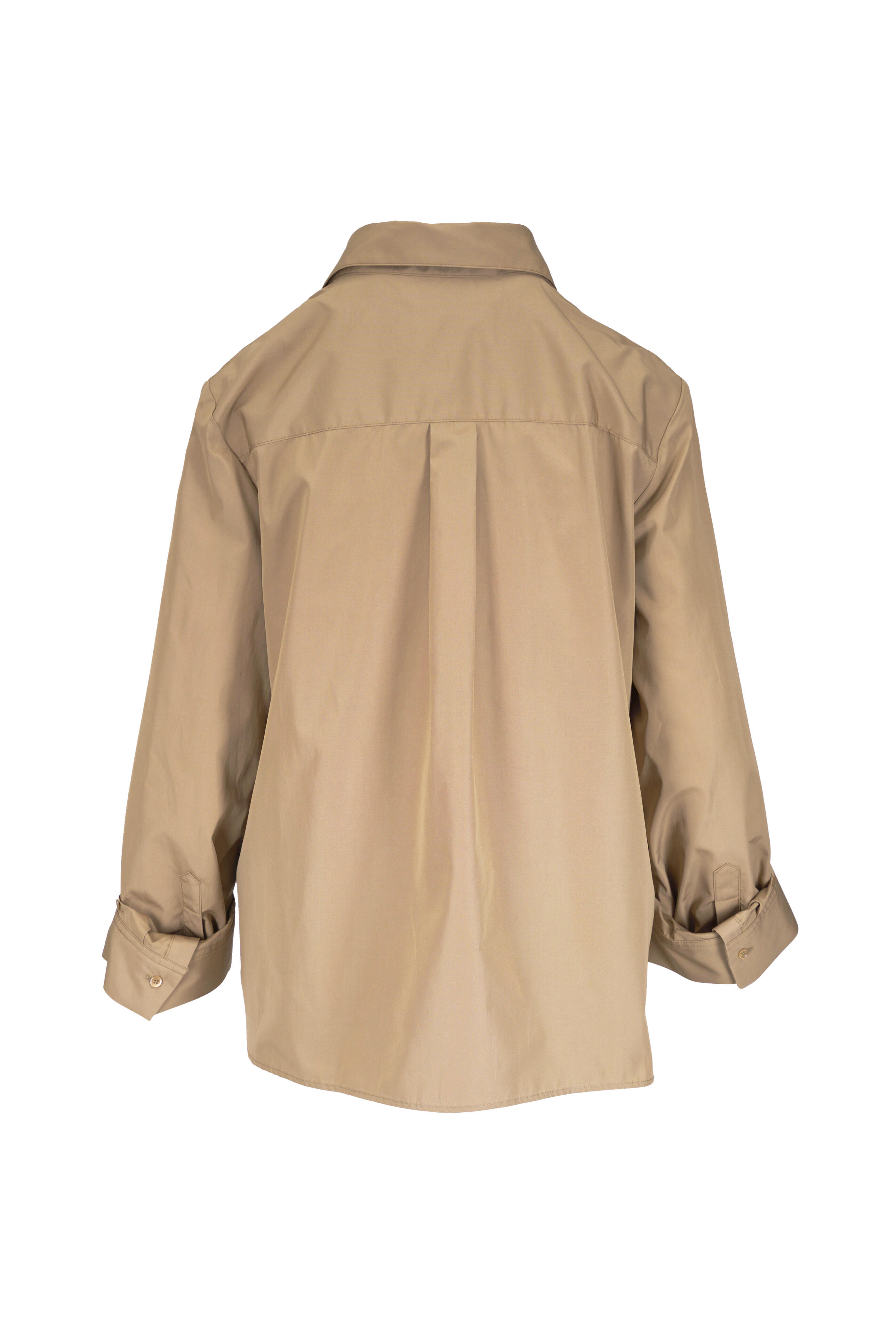 Spread collar. Front button placket. Chest patch pocket. Single roll button cuffs. Center box pleat at the back. Rounded hem. Made in the USA. Approximately 25" shoulder to hem (measurements taken from size XS/S). 100% cotton. Machine wash.