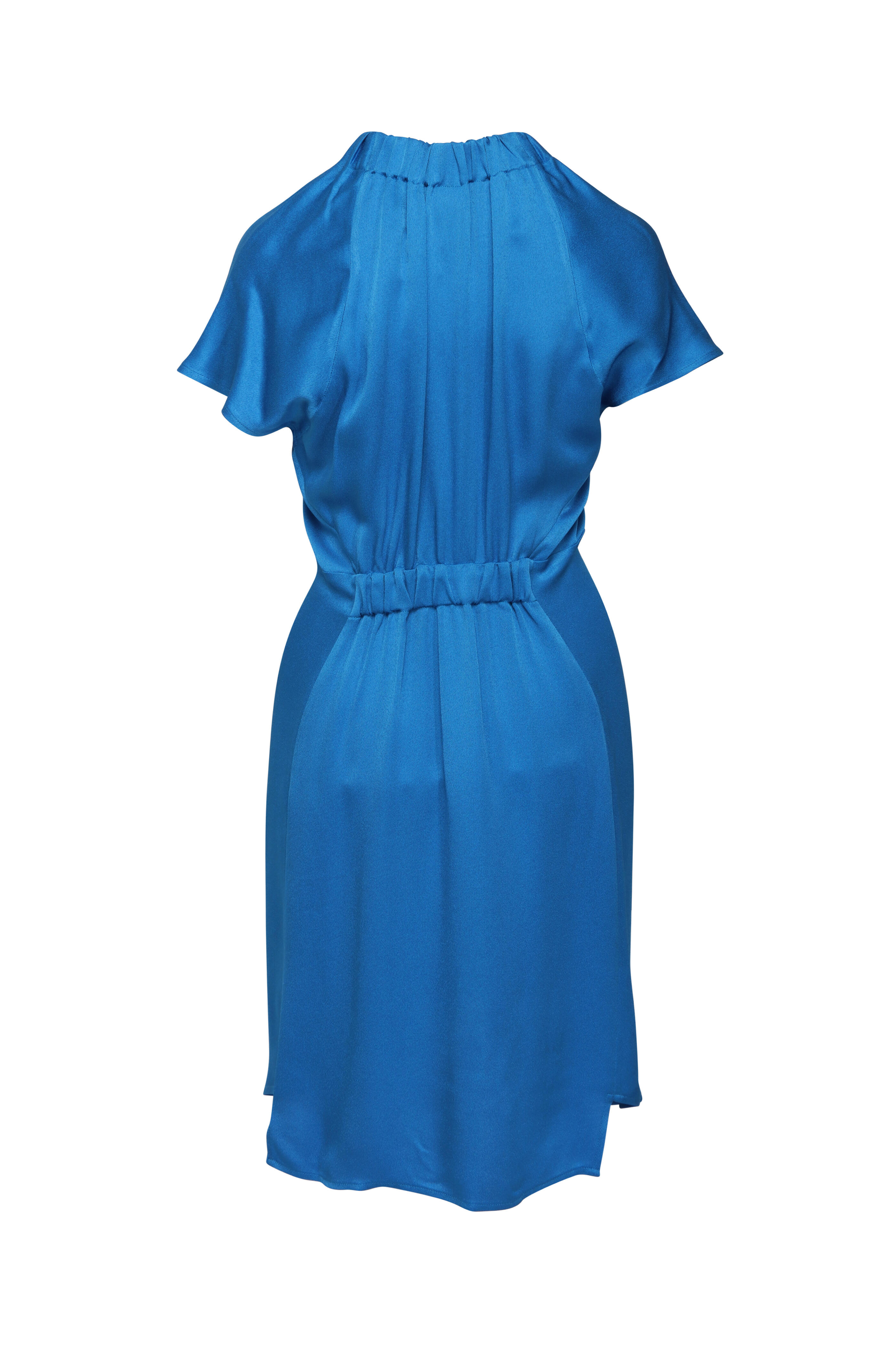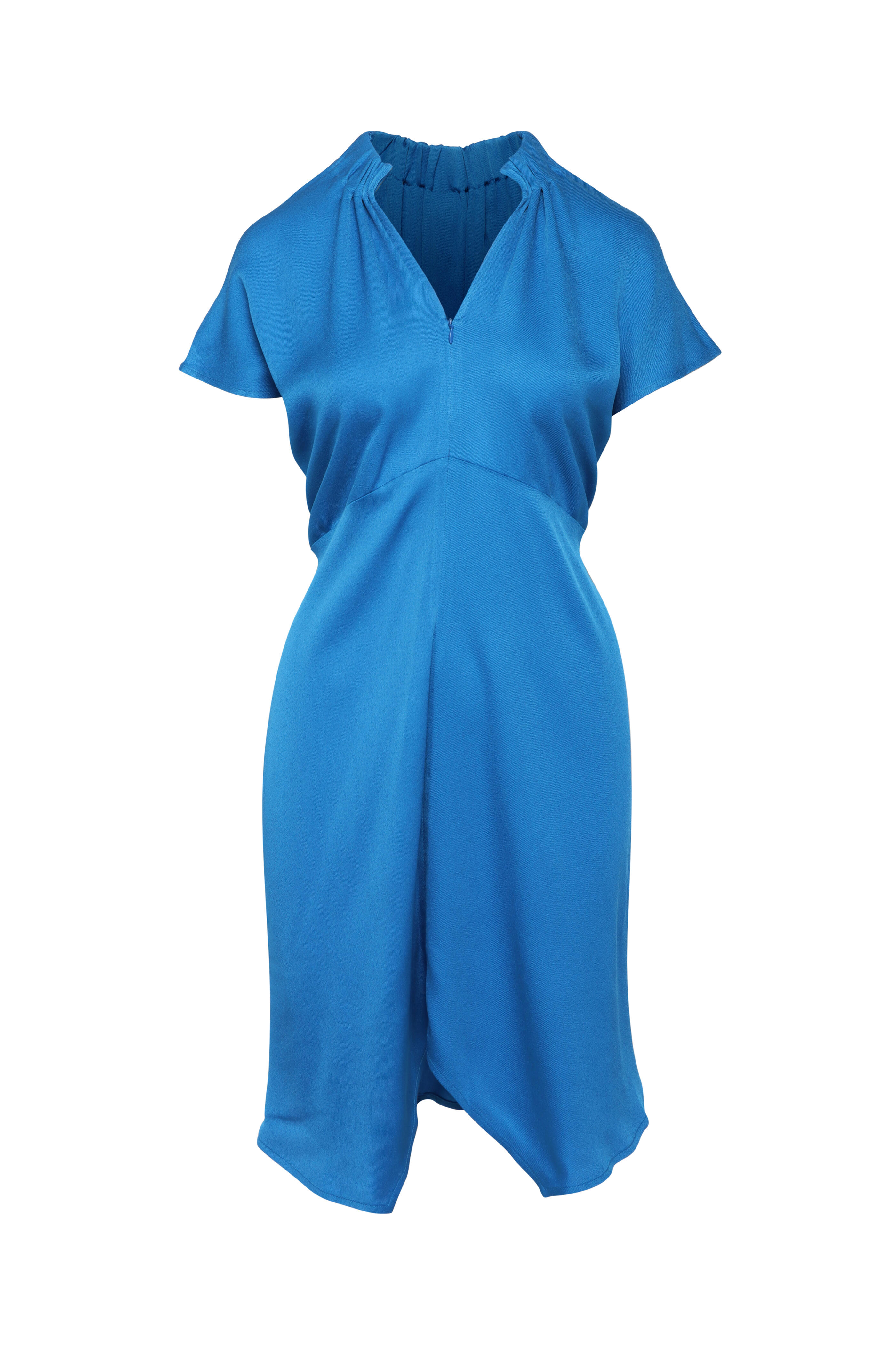 Elastic split v neck. Short dolman sleeves. Front zip closure. Slim through waist. Aline skirt. Imported. 72% viscose, 28% acetate. Dry clean.
