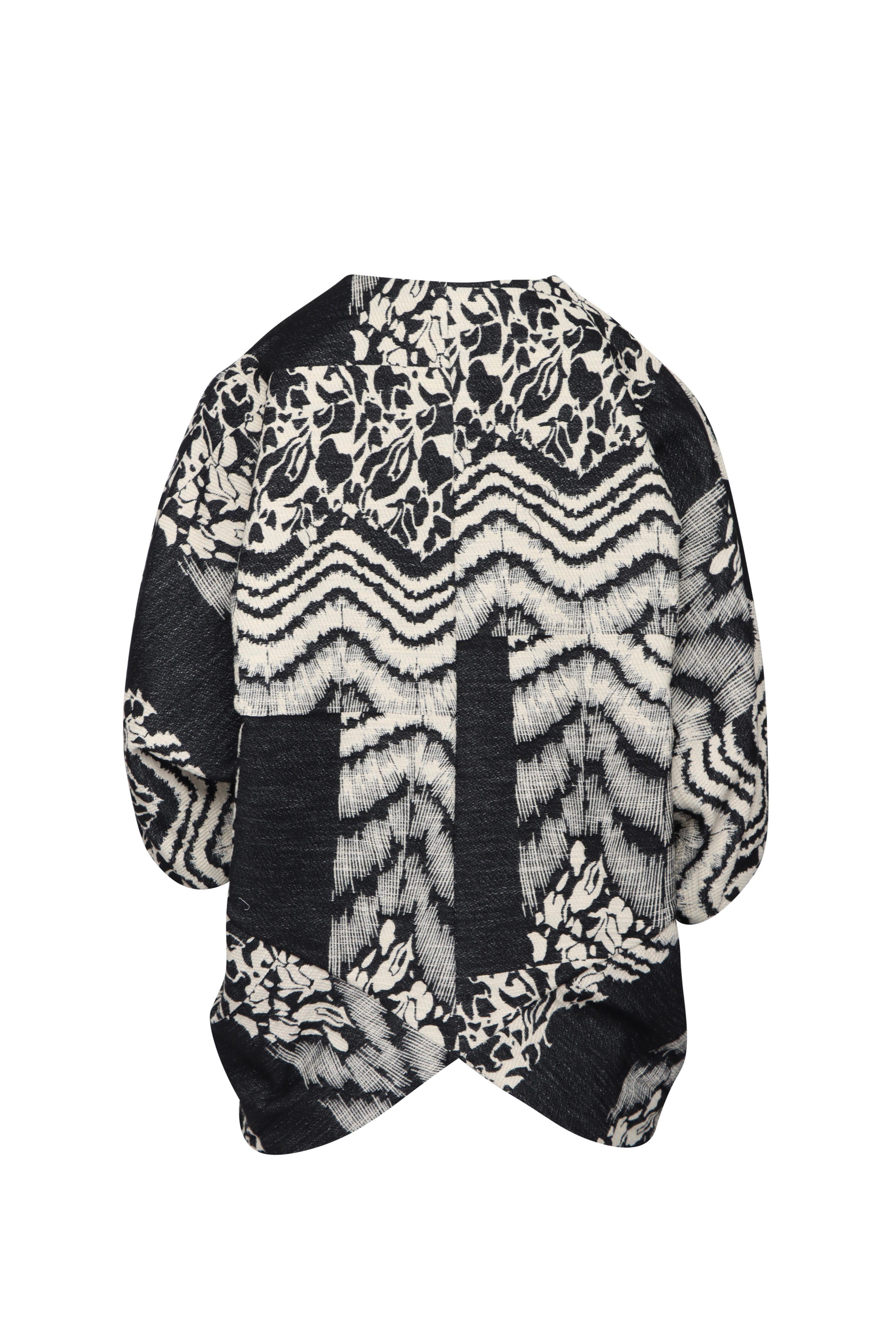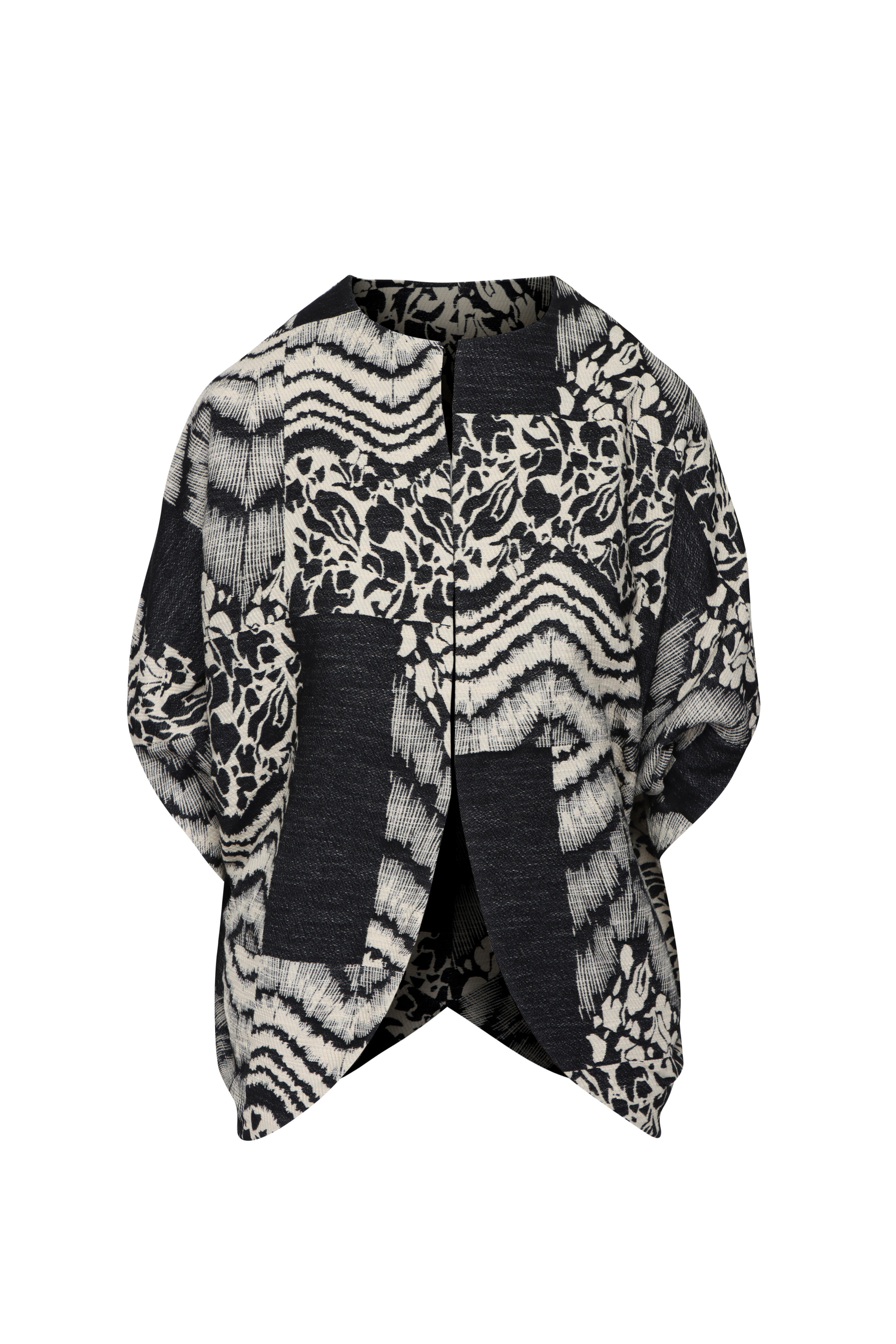 Round neck. Elbow length dolman sleeves. Hook and eye closure. Relaxed fit. Cocoon silhouette. Imported. 69% cotton, 24% organic cotton, 7% polyamide. Dry clean.