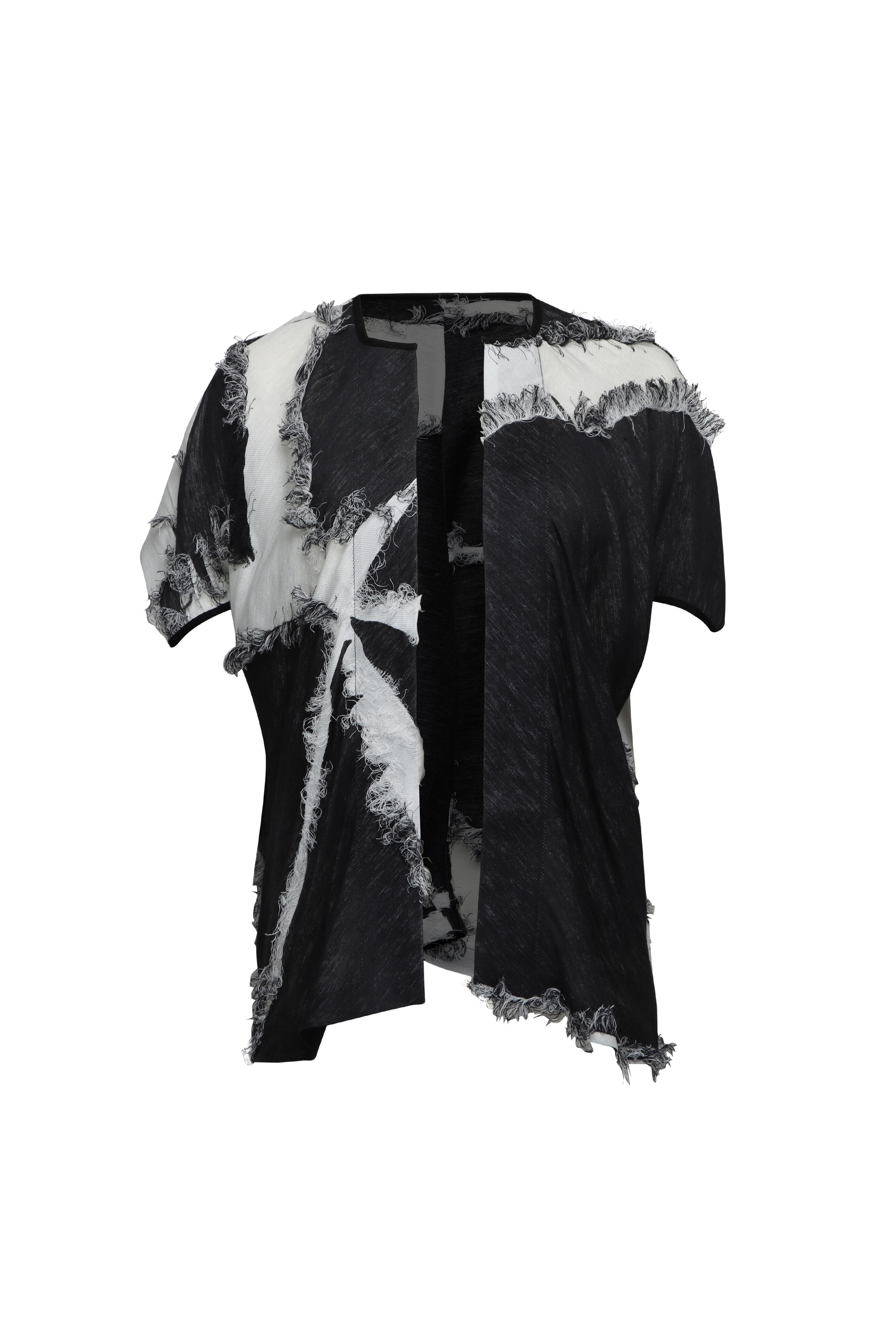 Round neck. Short dolman sleeves. Open front. Relaxed fit. Straight hem. Made in USA. Length 28” (US 2). 82% linen, 18% silk. Dry clean.