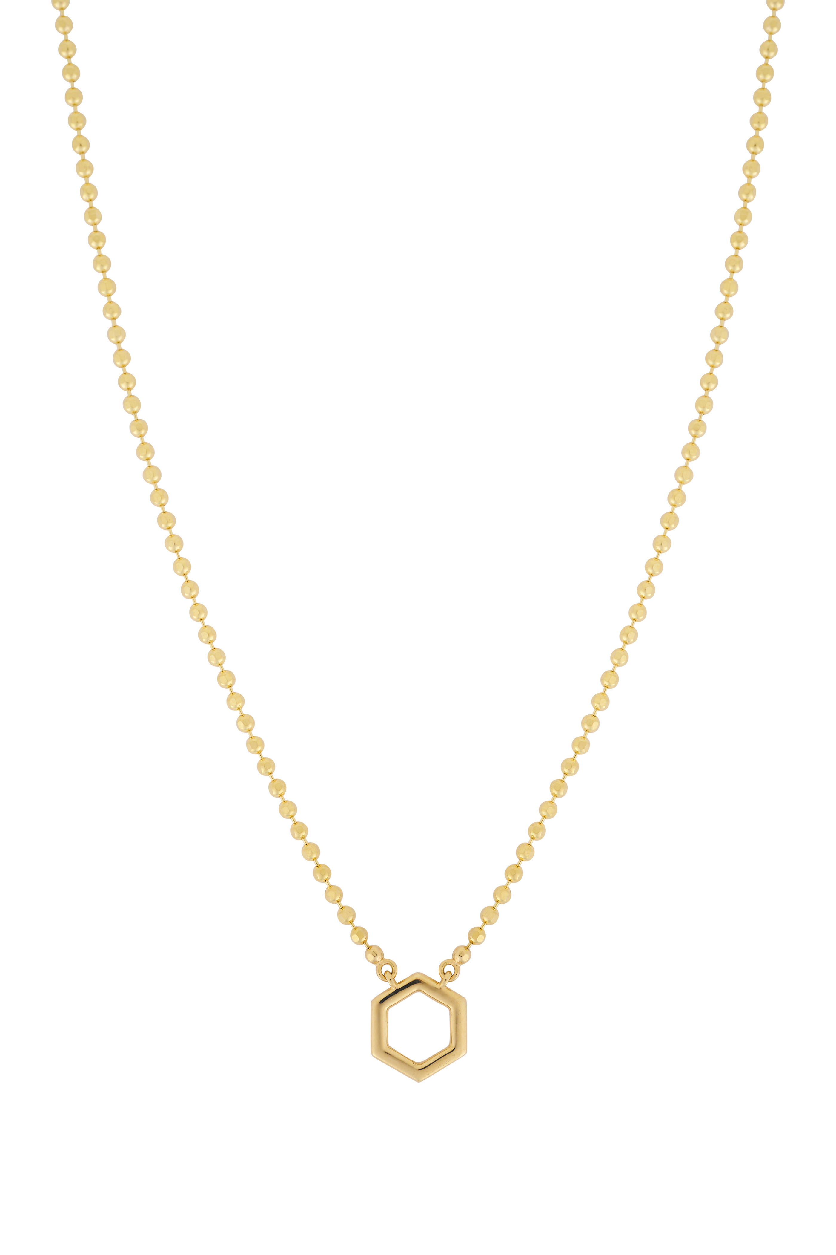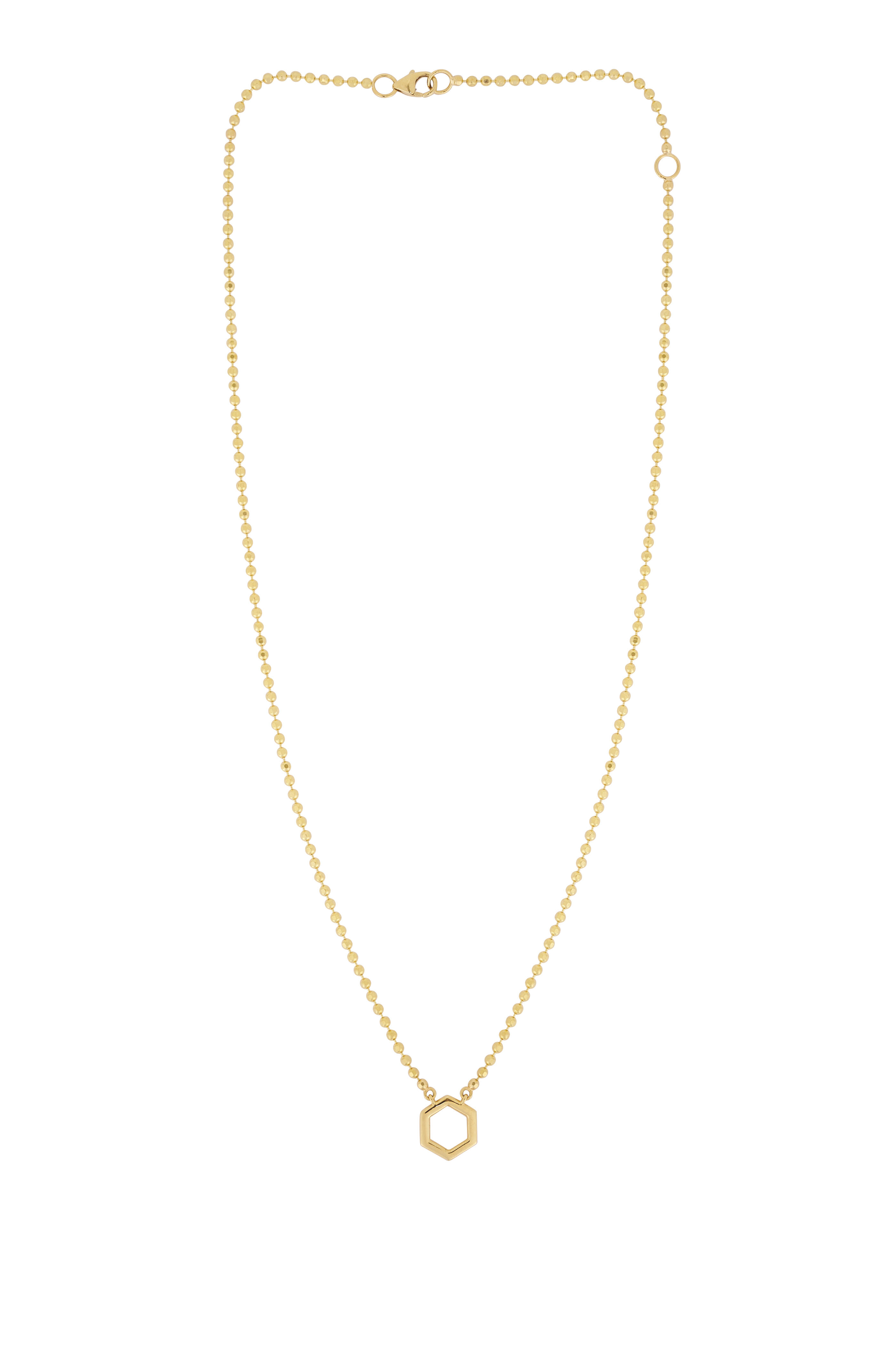 18k gold. Diamond. Hexagon shape pendant. Ball chain. Lobster claw clasps. Made in the USA. Length: 18".