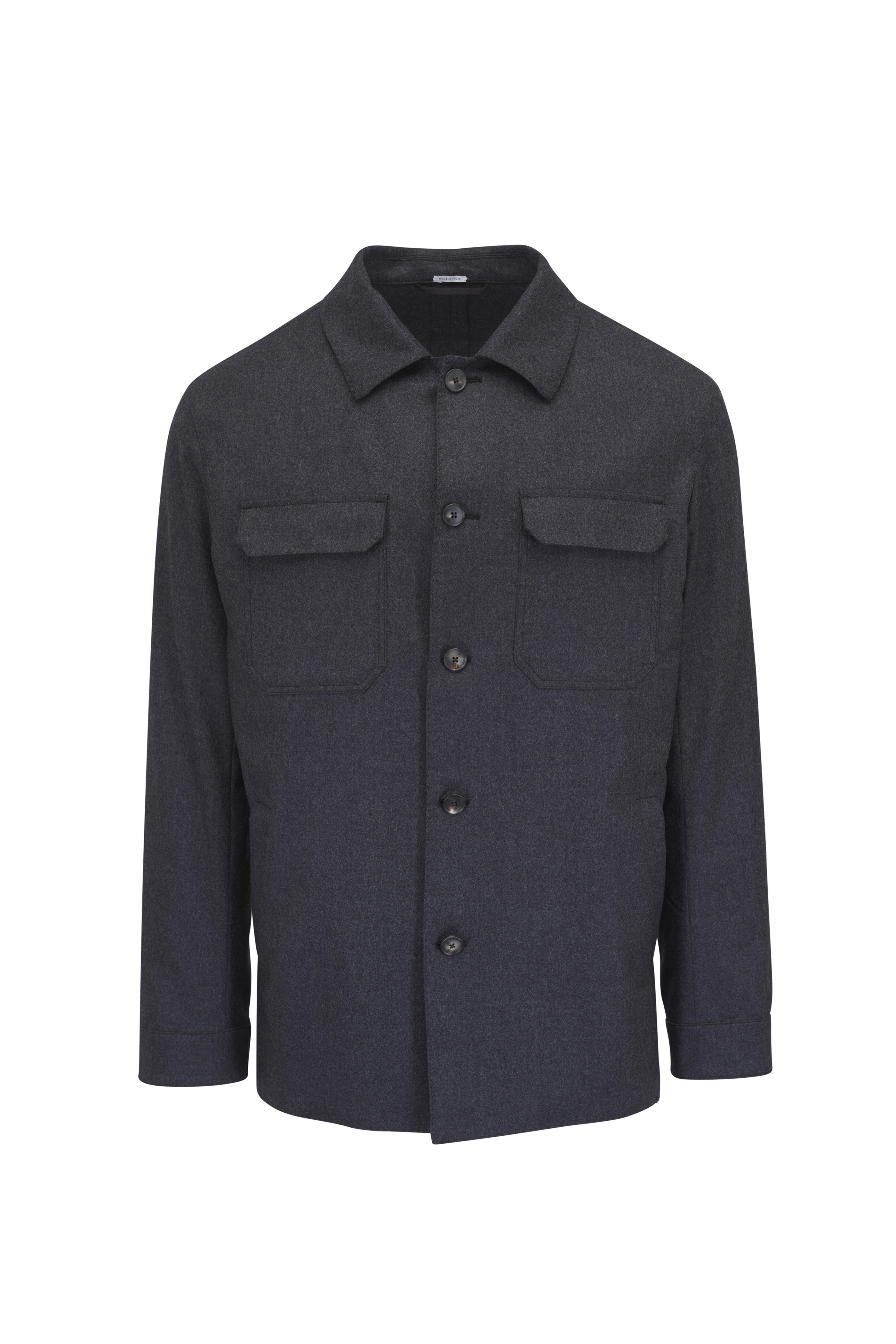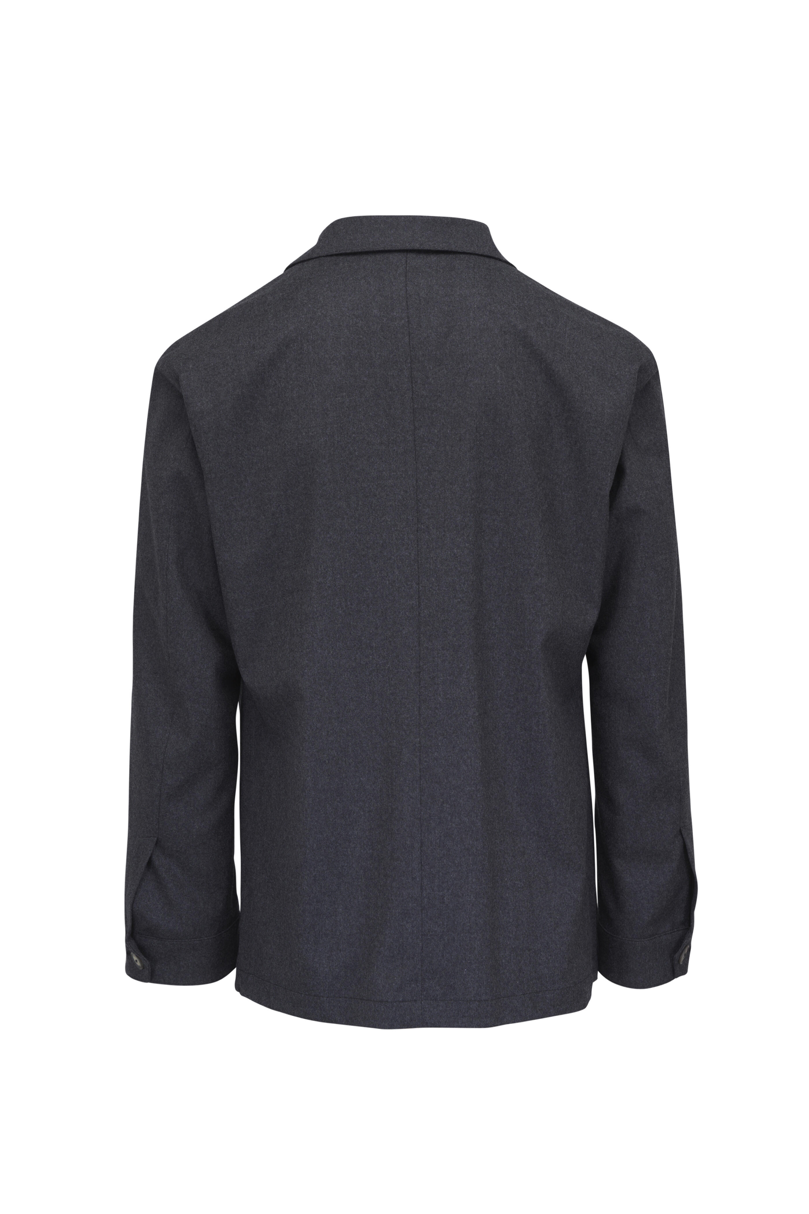 Spread collar. French front button placket. Side slip pockets; chest flap pockets. Single button cuffs. Imported. Approximately 29" shoulder to hem (measurements taken from size 44). 100% wool, lined. Dry clean.
