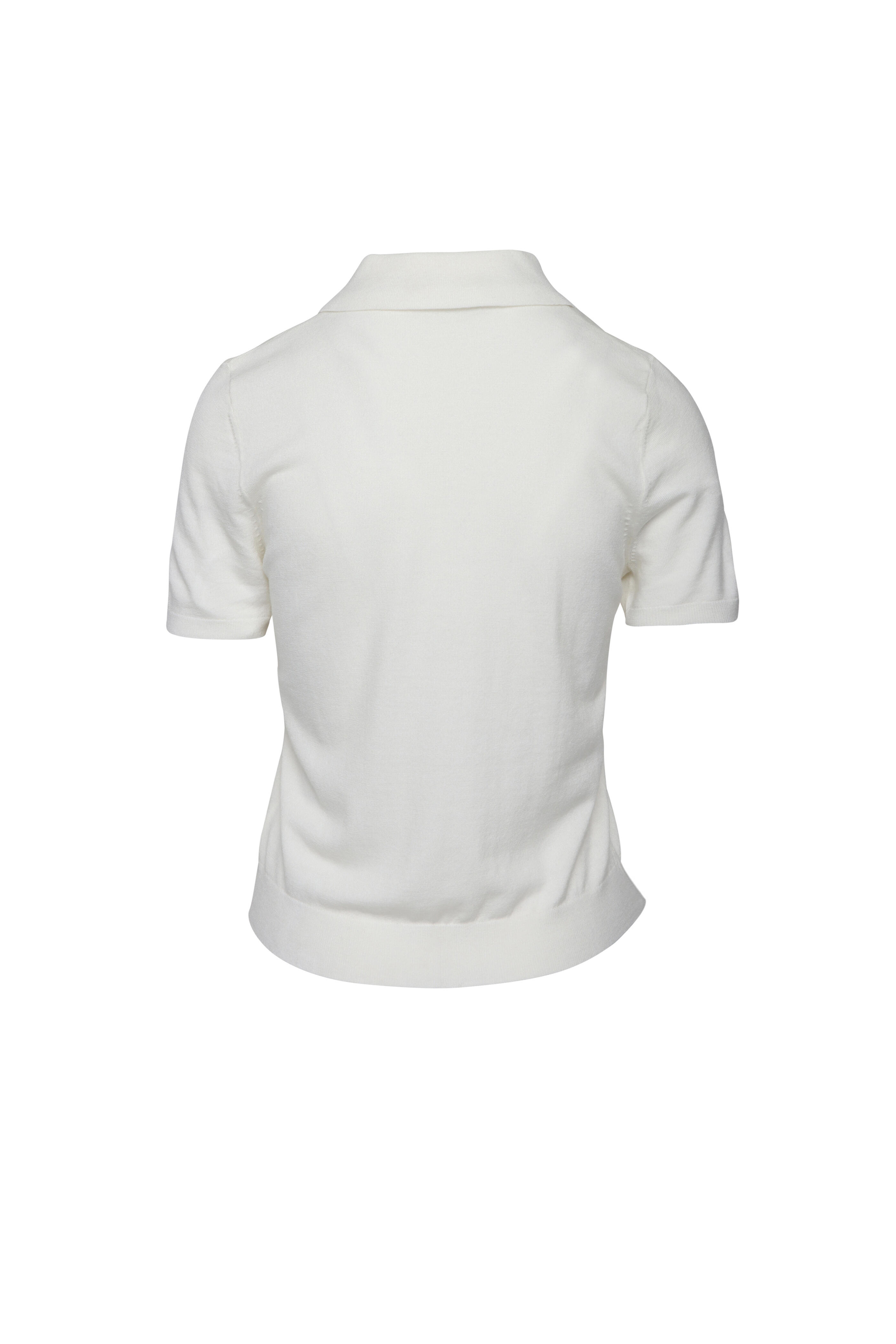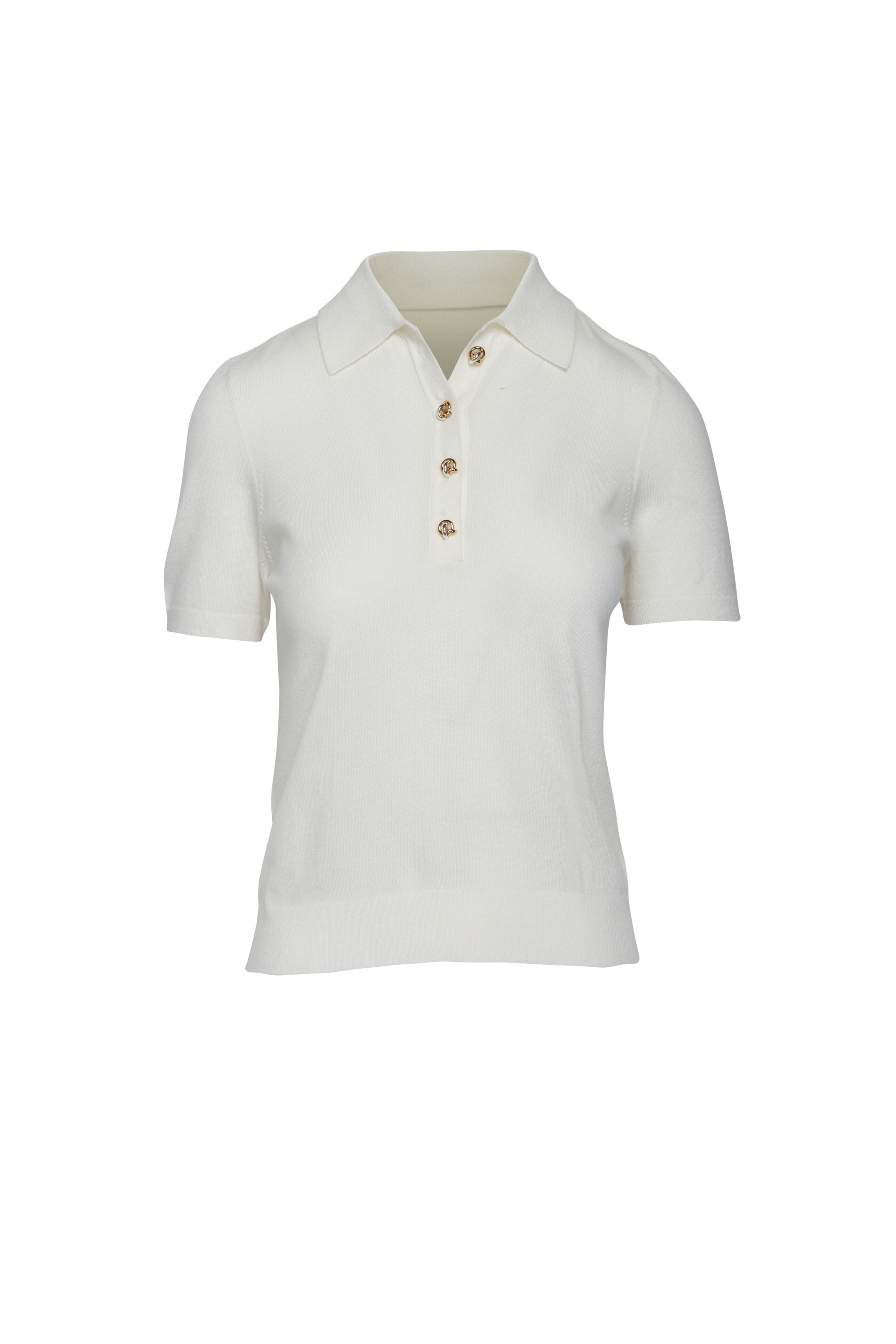Collar. Short sleeves. Quarter button placket. Slim fit. Straight hem. Imported. 88% merino wool, 8% polyamide, 6% polyester, 1% elastane. Dry clean.