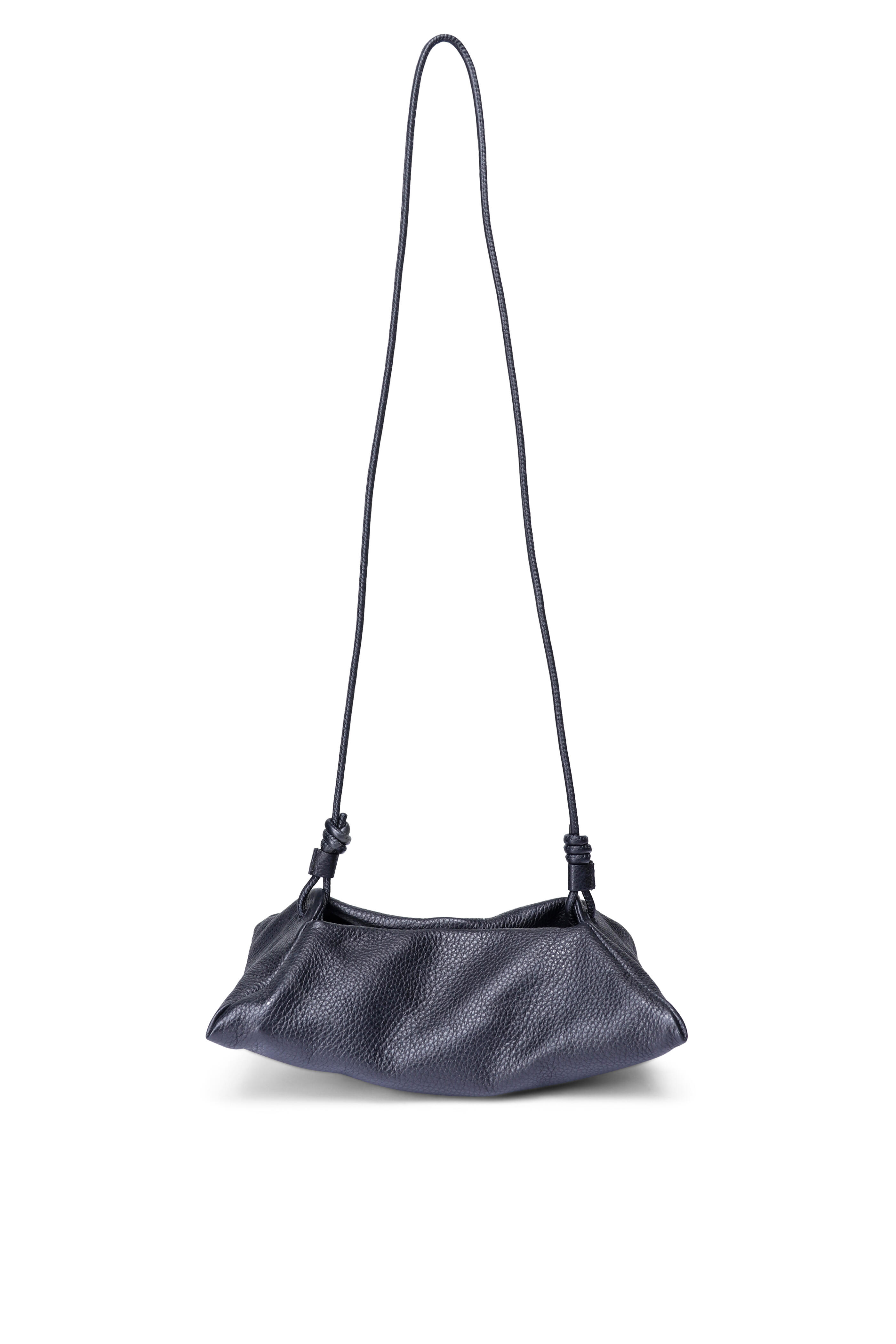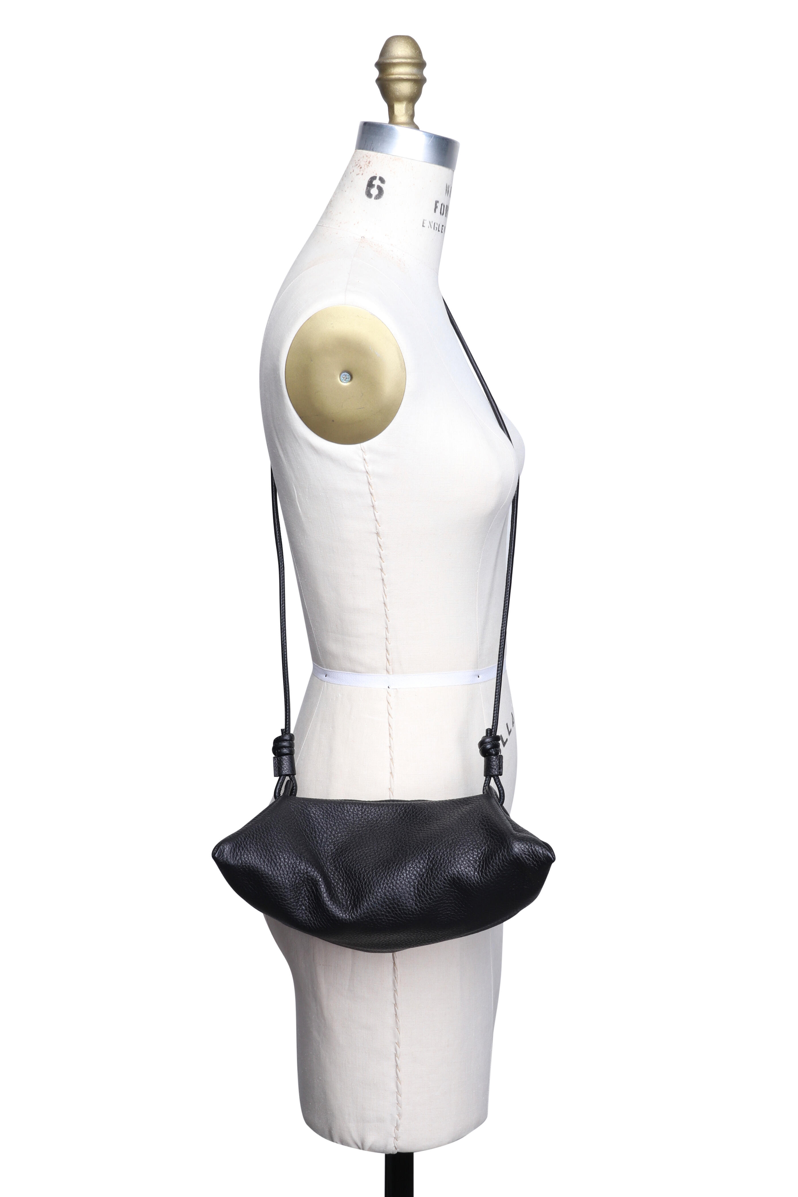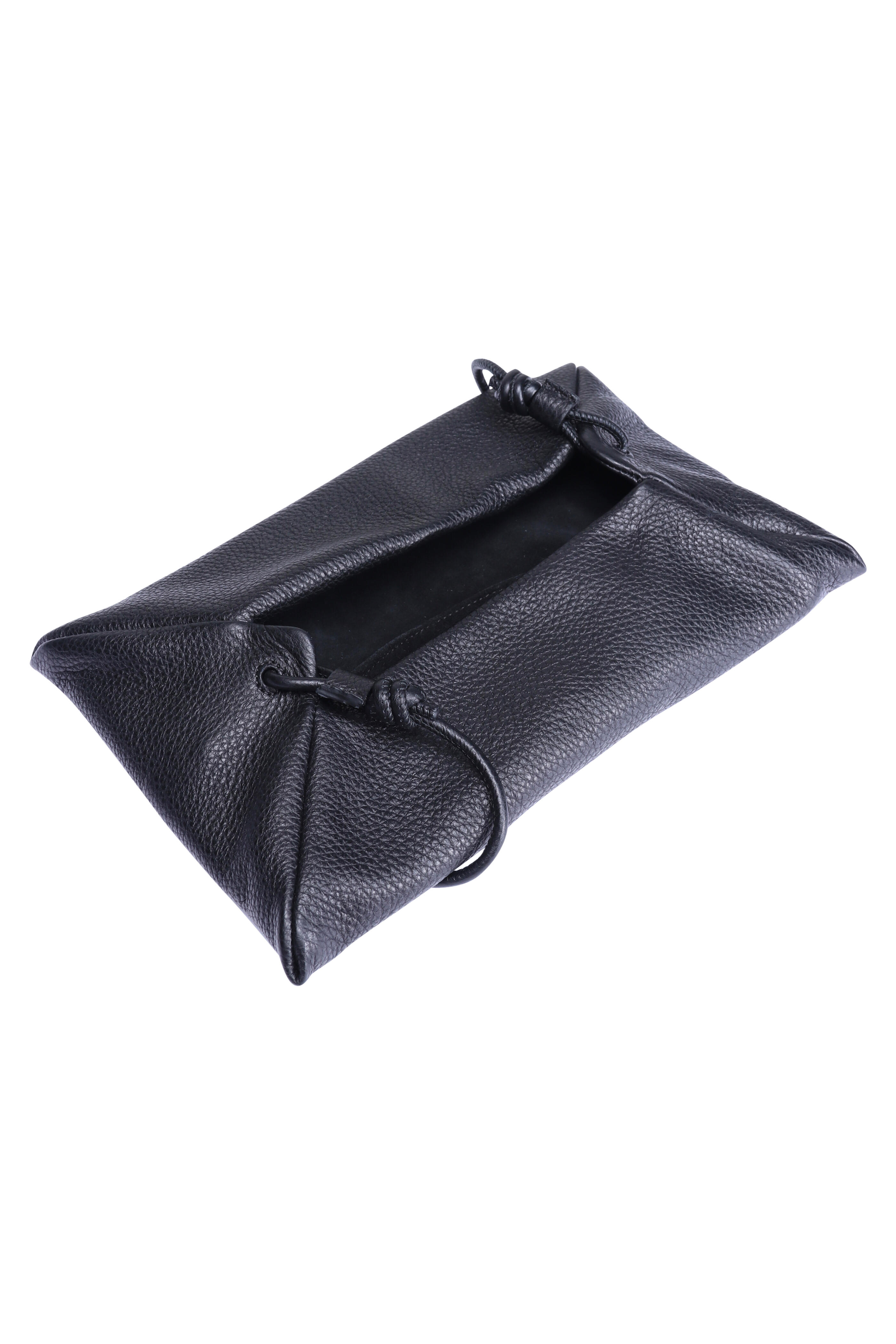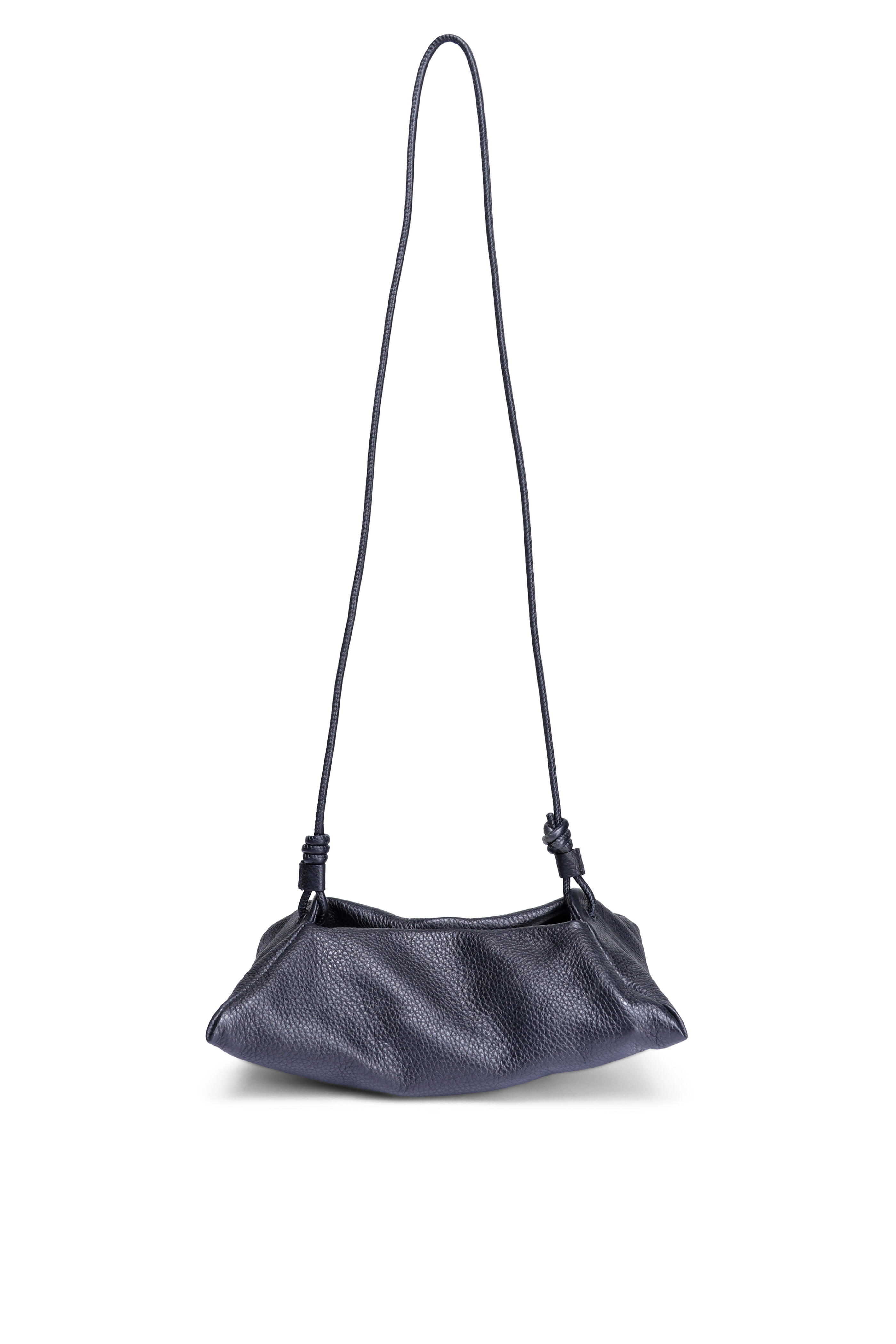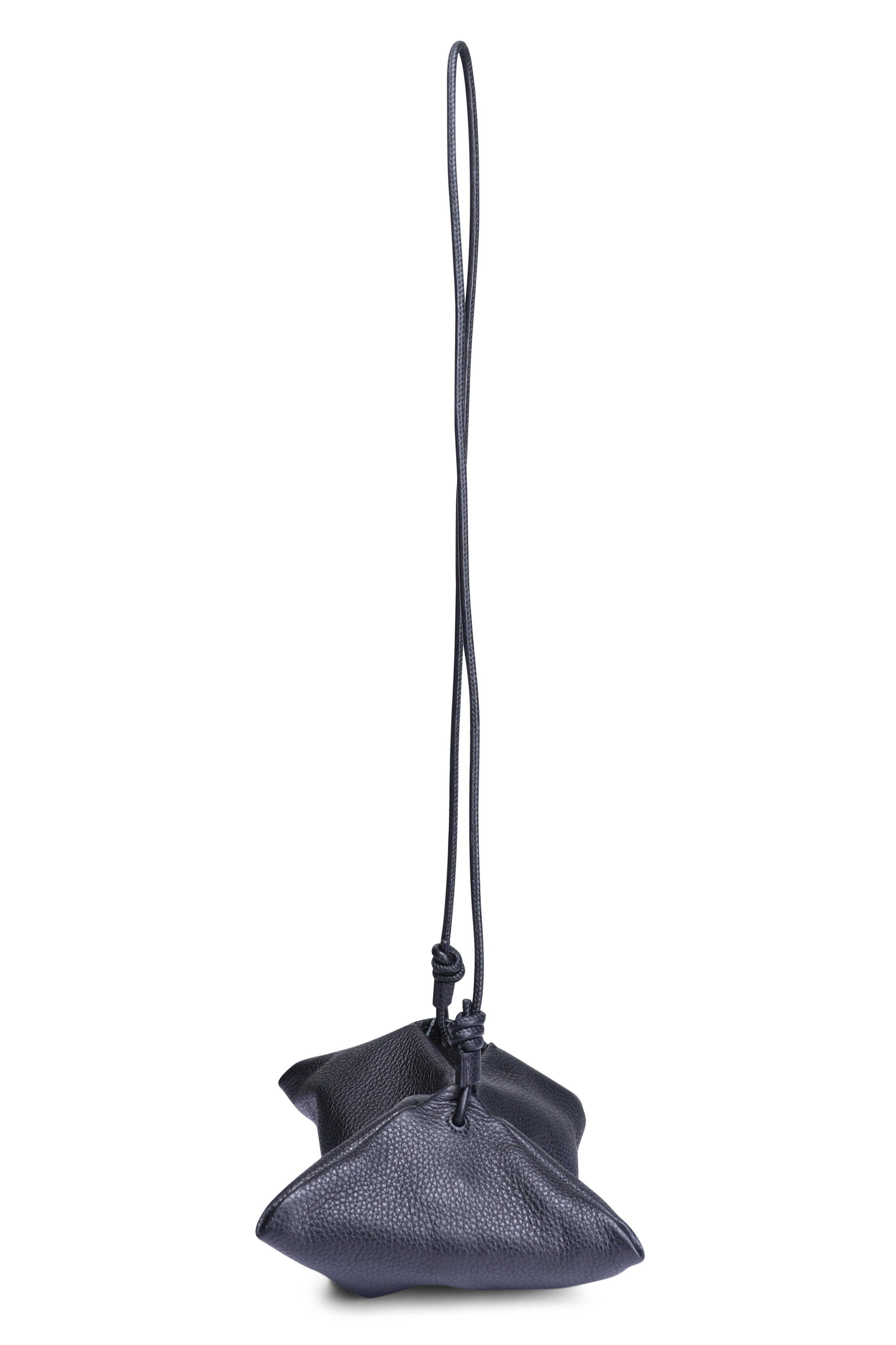 Grained leather upper. Suede lining. Magnetic closure. Adjustable elongated leather crossbody strap. Inspired by ancient art of origami. Made in Spain. 6” x 2” x 7.5”. Strap drop: 20.5”.