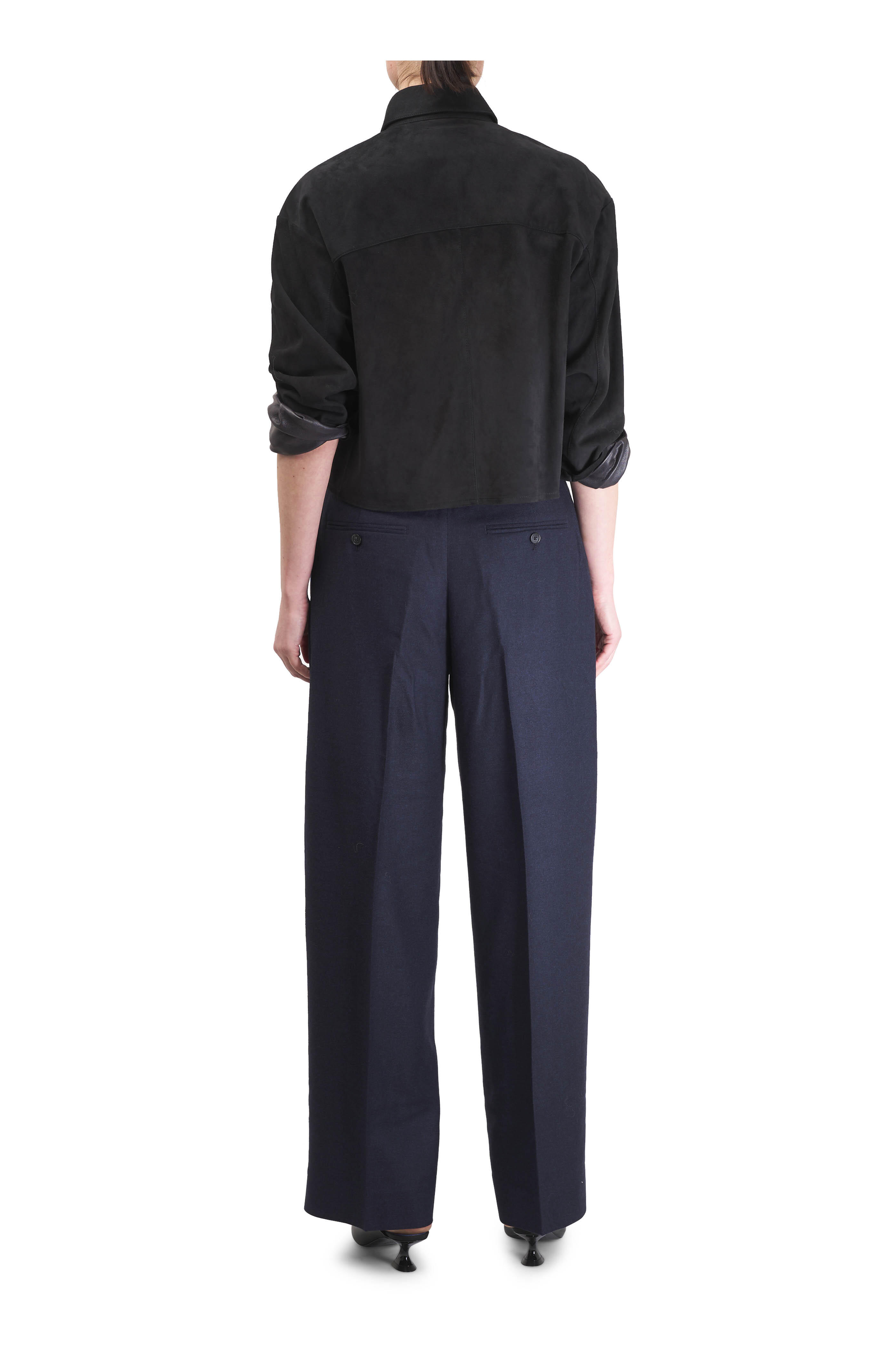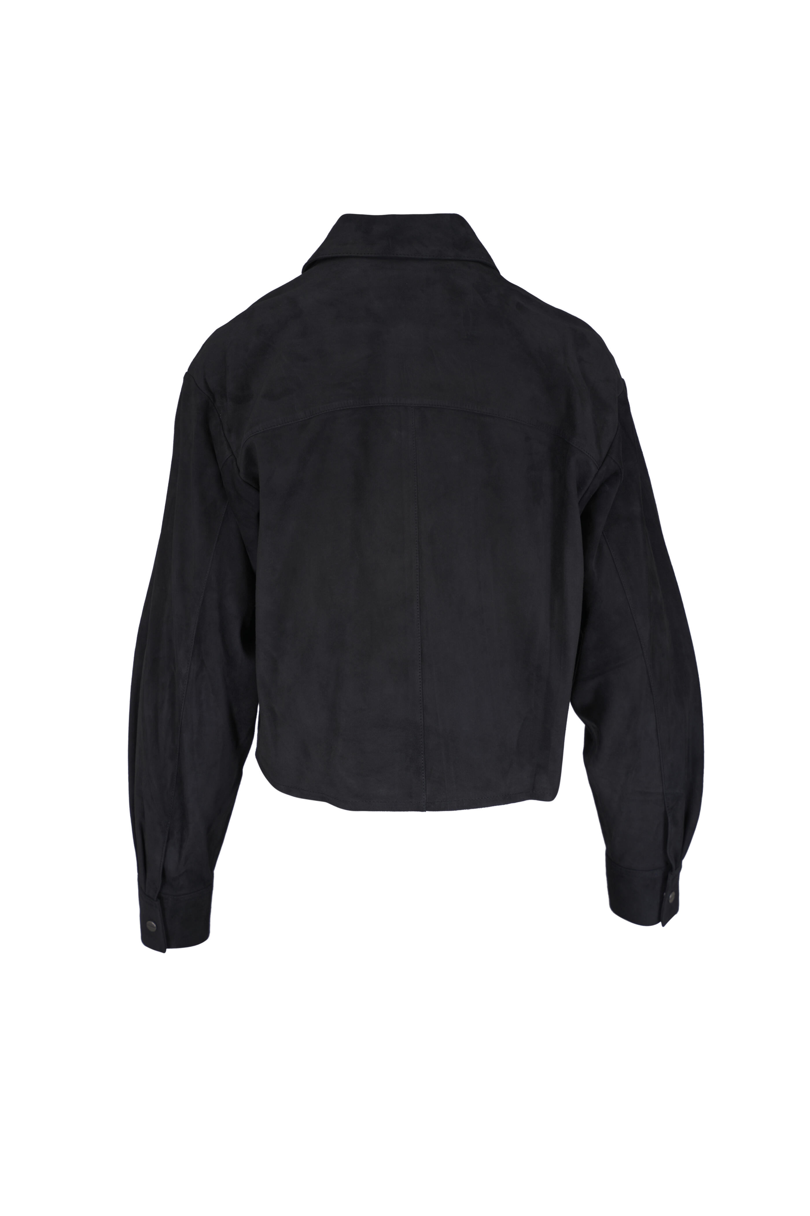 Spread collar. Button up placket. Chest patch pocket. Imported. 18" shoulder to hem (size XS). 100% leather. Dry Clean.