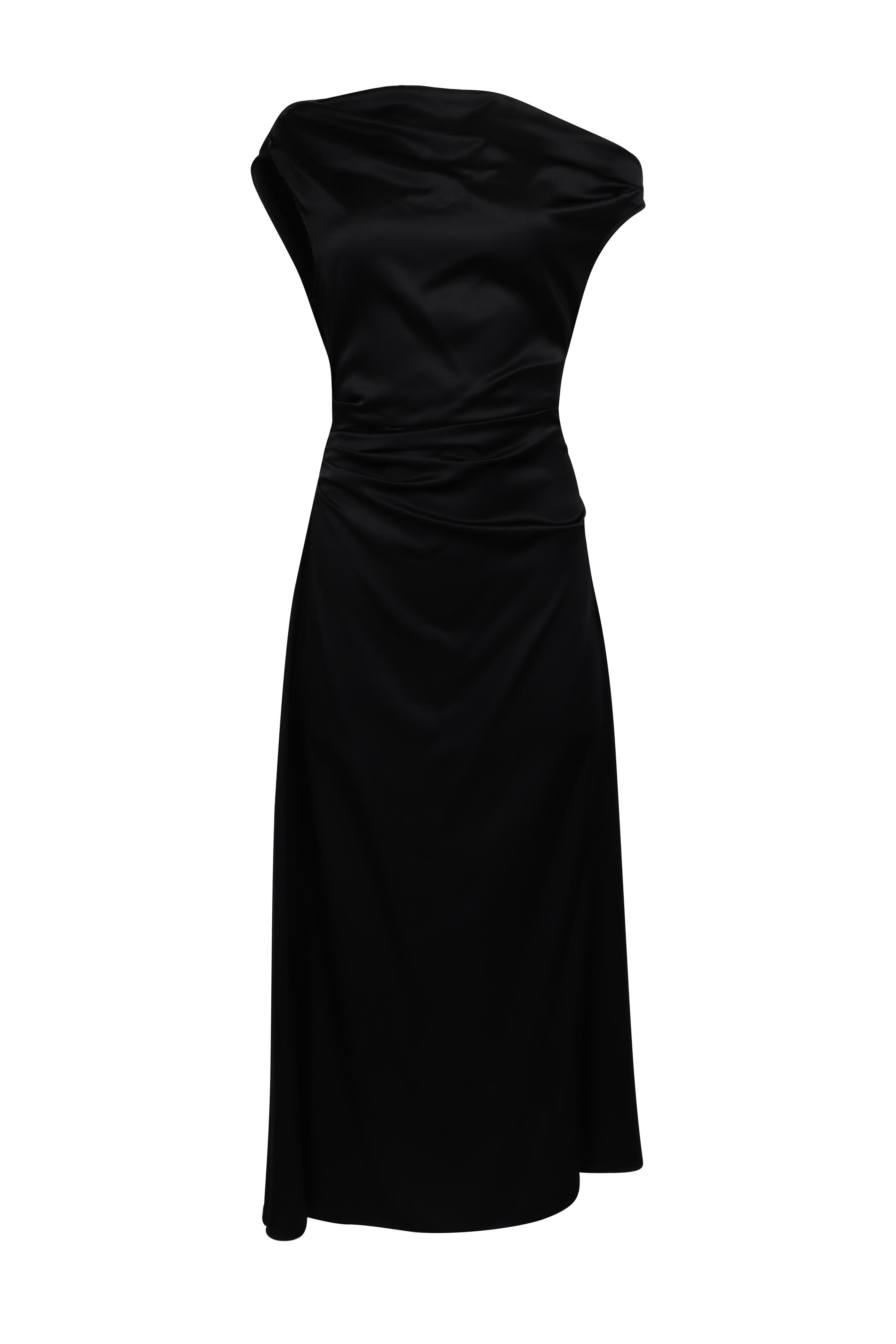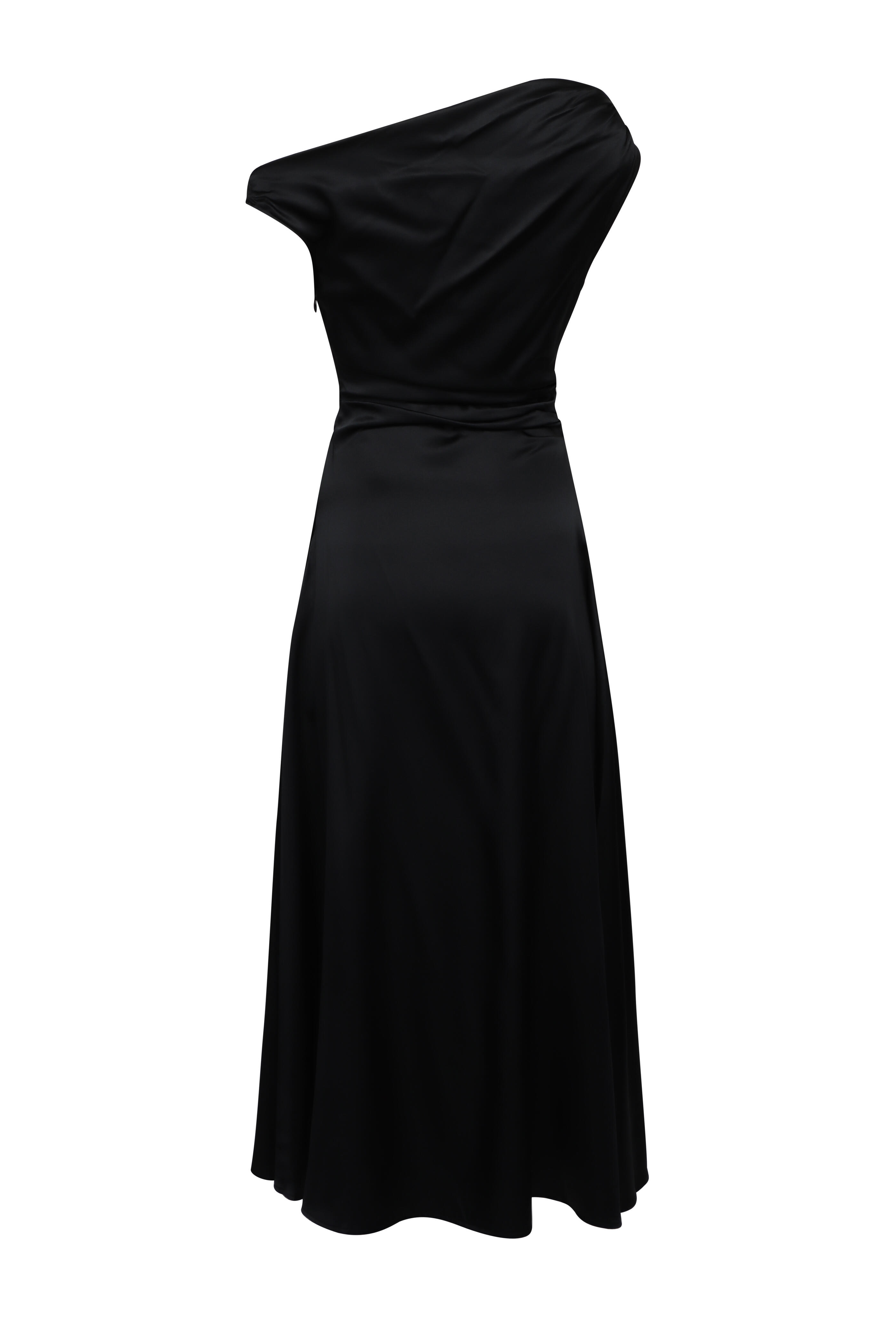Asymmetrical off the shoulder neckline. Short sleeves. Concealed zip closure. Ruched throughout. Aline skirt. Stretch silk fabrication. Imported. Bust 34.5” (US 4). Waist 27.5” (US 4). Length 50.5” (US 4). Midi length. 93% silk, 7% spandex. Dry clean.