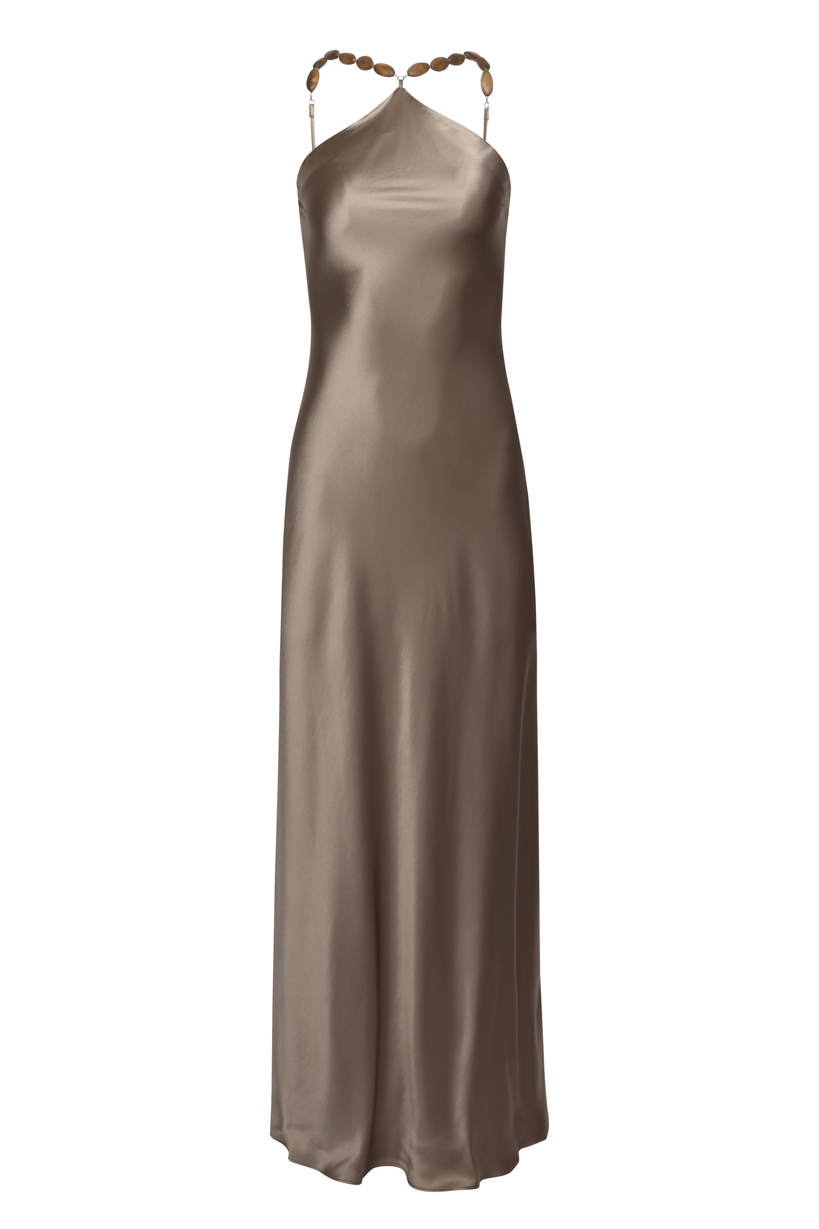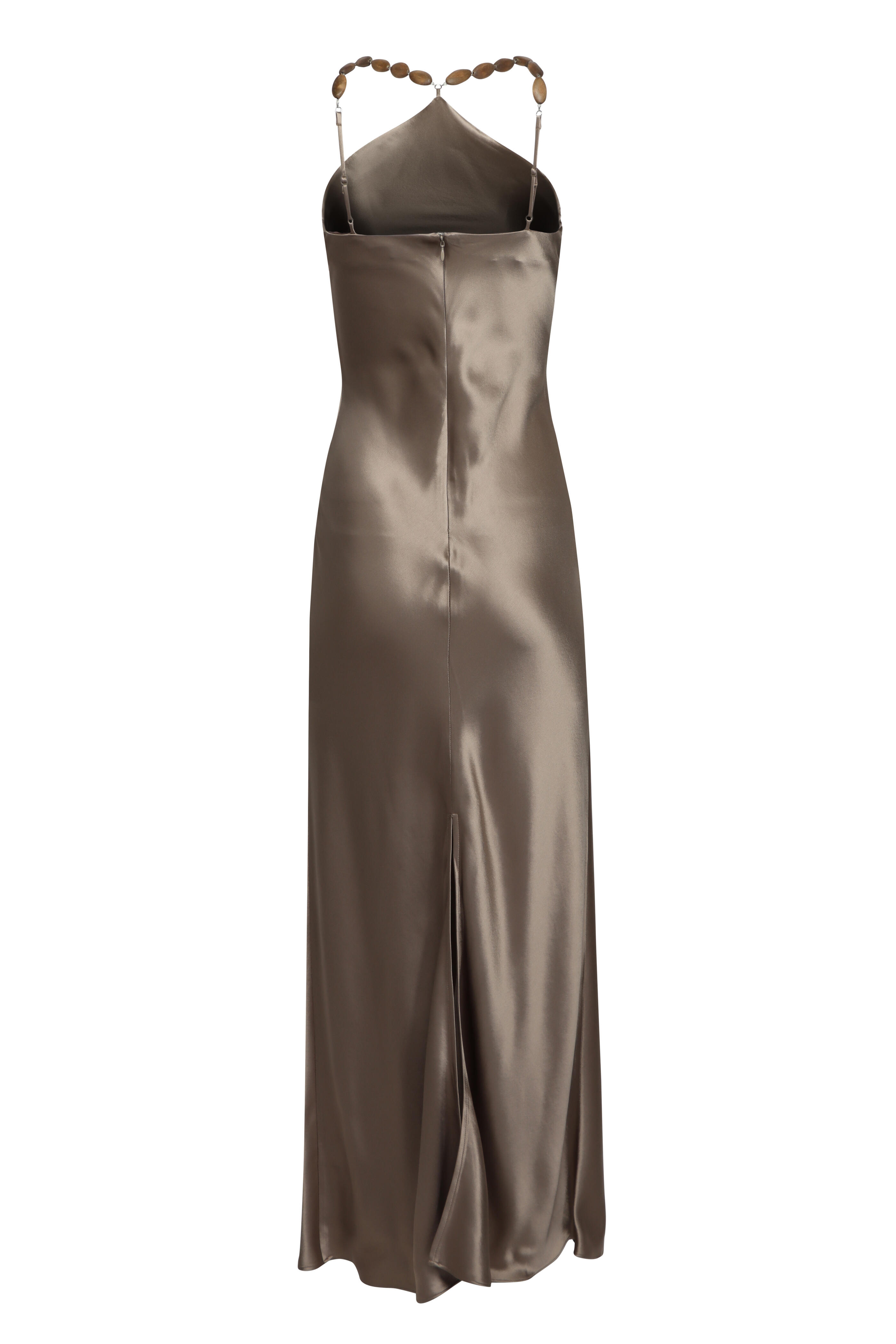 Halter neck. Square back. Sleeveless; thin adjustable straps. Concealed back zip closure. Slim silhouette. Back hem vent. Imported. Bust 33.5” (US 4). Waist 29” (US 4). Length 60” (US 4). Full length. 76% acetate, 24% polyester. Dry clean.