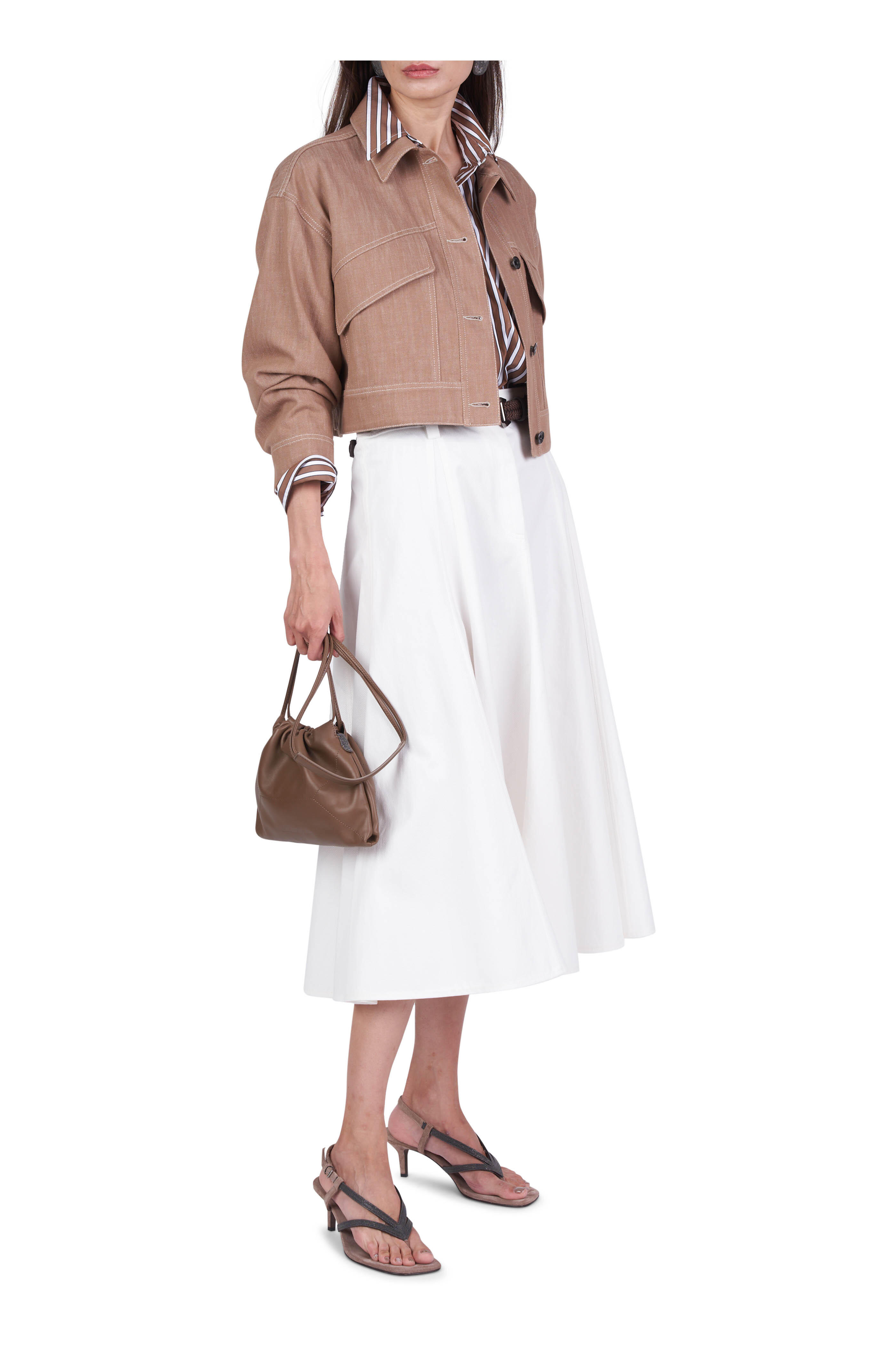 Spread collar. Front button placket. Front flat pockets. Buttoned cuffs. Side buttons for fit adjustment. Monili detailing. Made in Italy. 100% cotton. Dry clean.