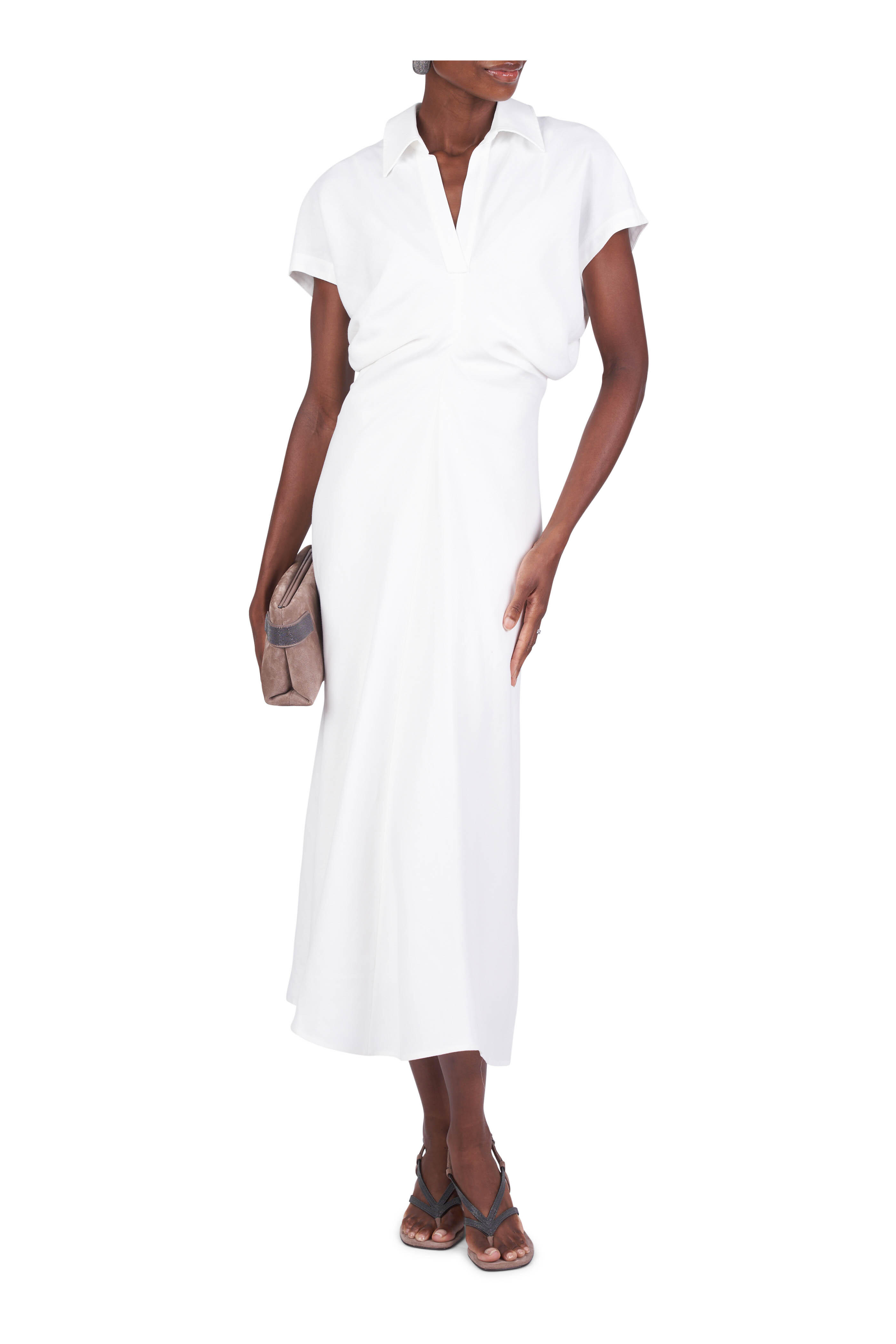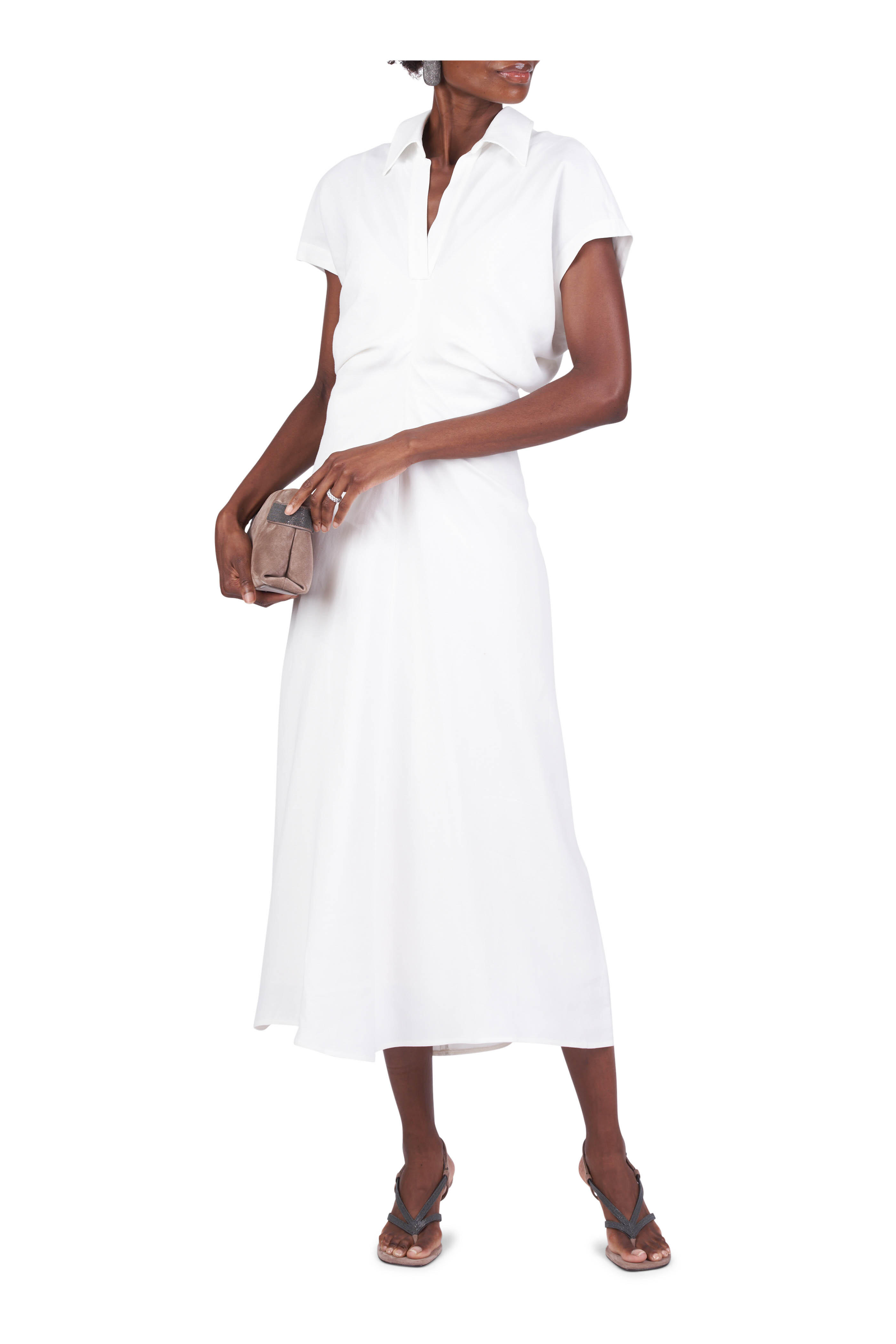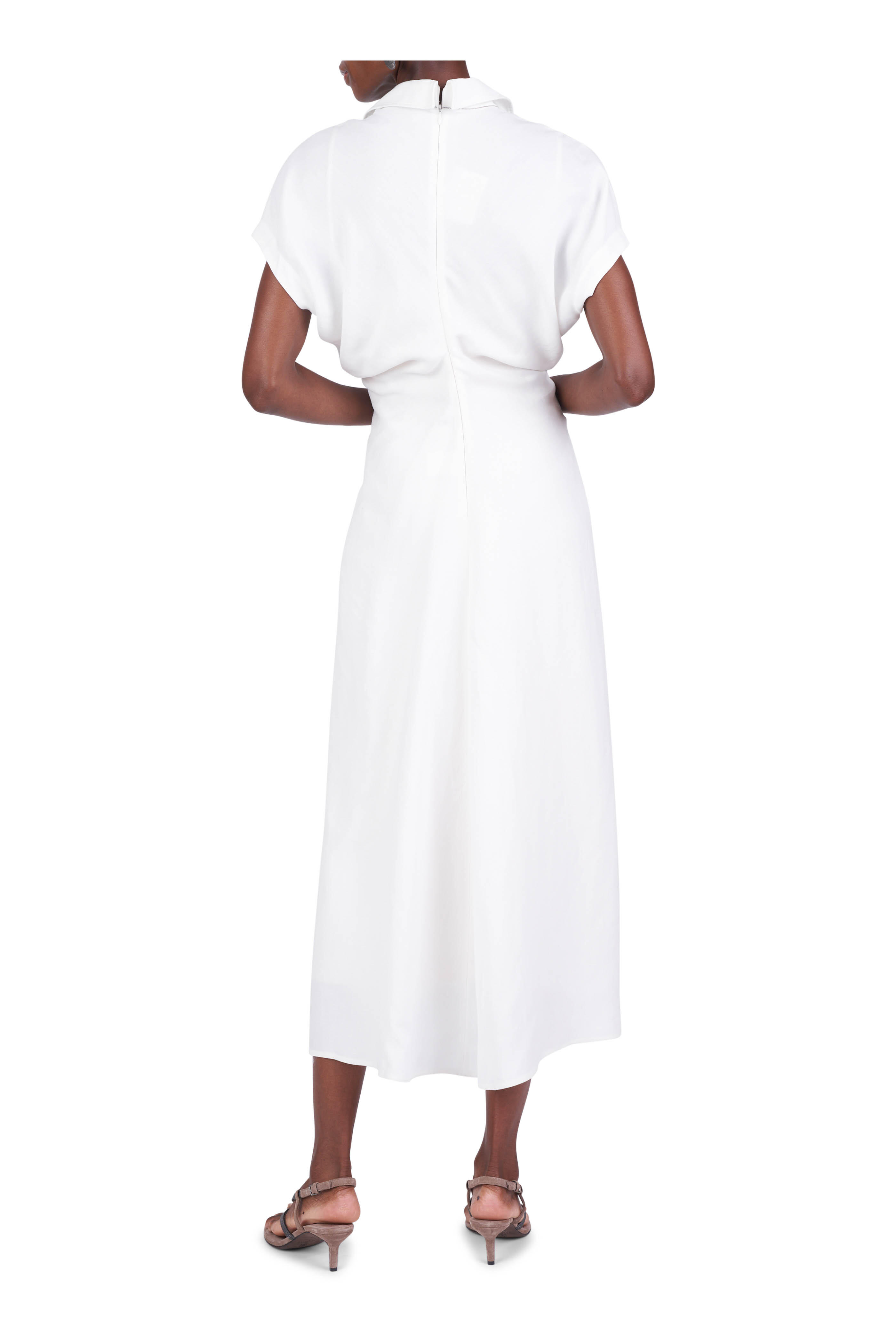 Spread collar. Concealed back zip. Removable slip with snaps. Monili detailing. Made in Italy. 72% viscose, 28% linen. Dry clean.