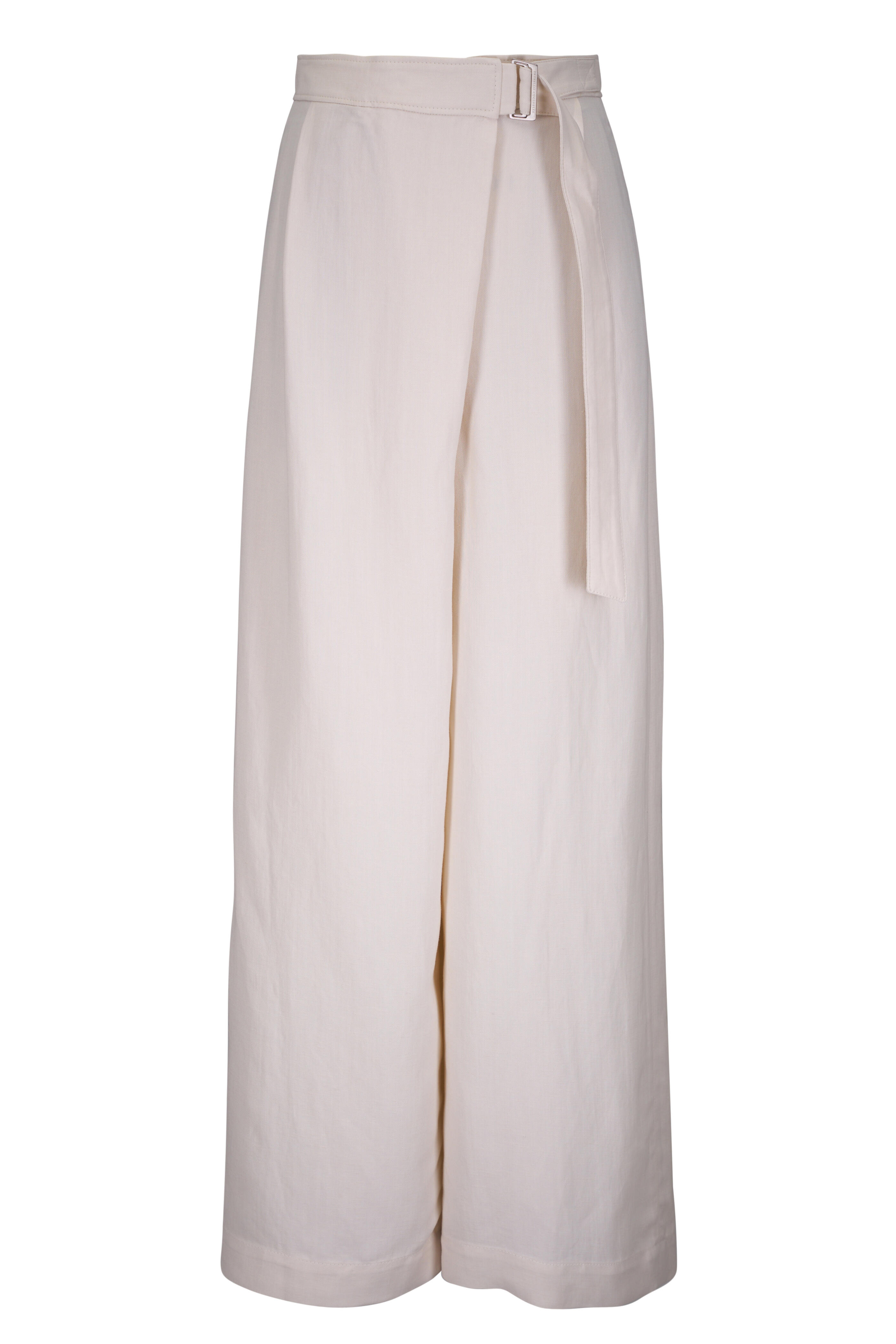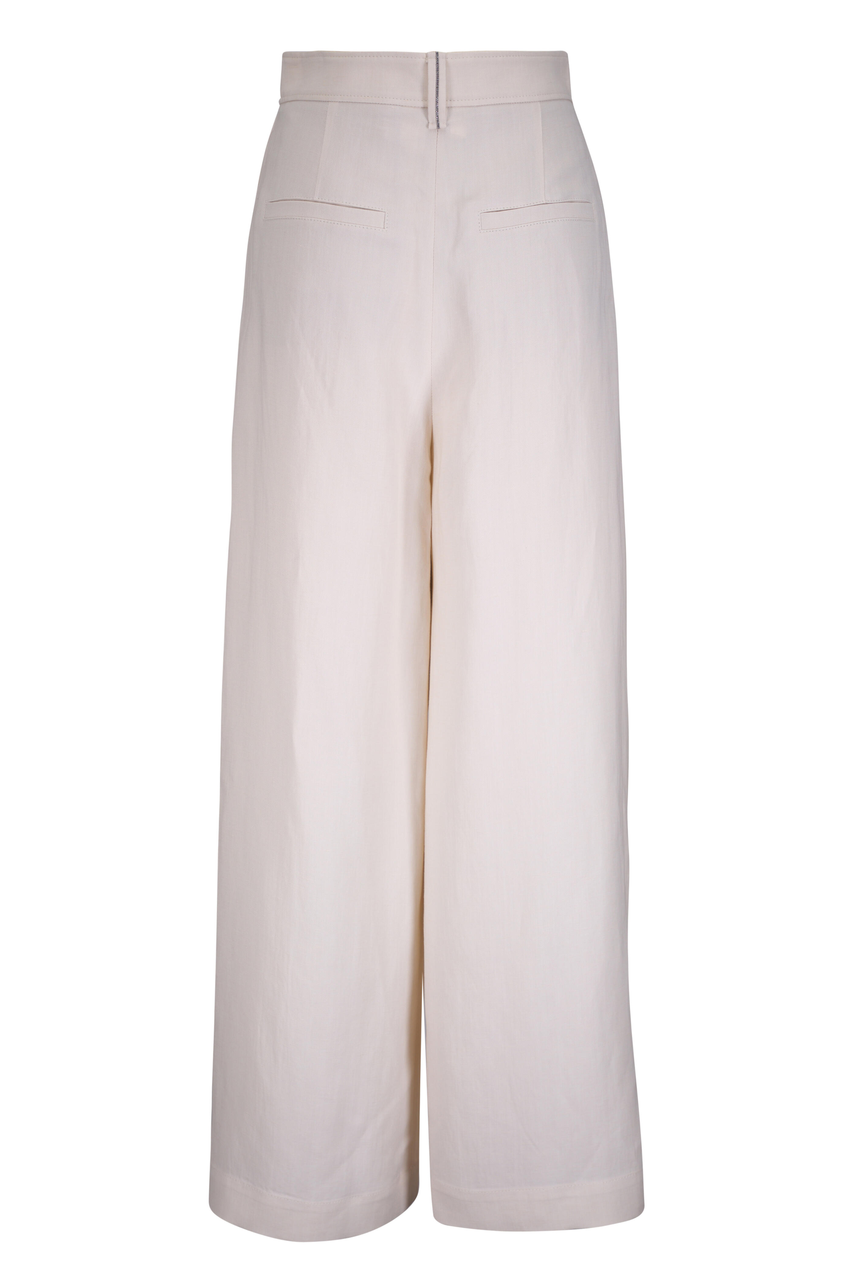 Adjustable belt; zip fly; backing button closure. Vertical front pockets; back welt pockets. Nickel-free monili decoration. Pleat. Straight hem. Made in Italy. 29" Inseam (size 0). 72% Viscose, 28% linen. Dry clean.