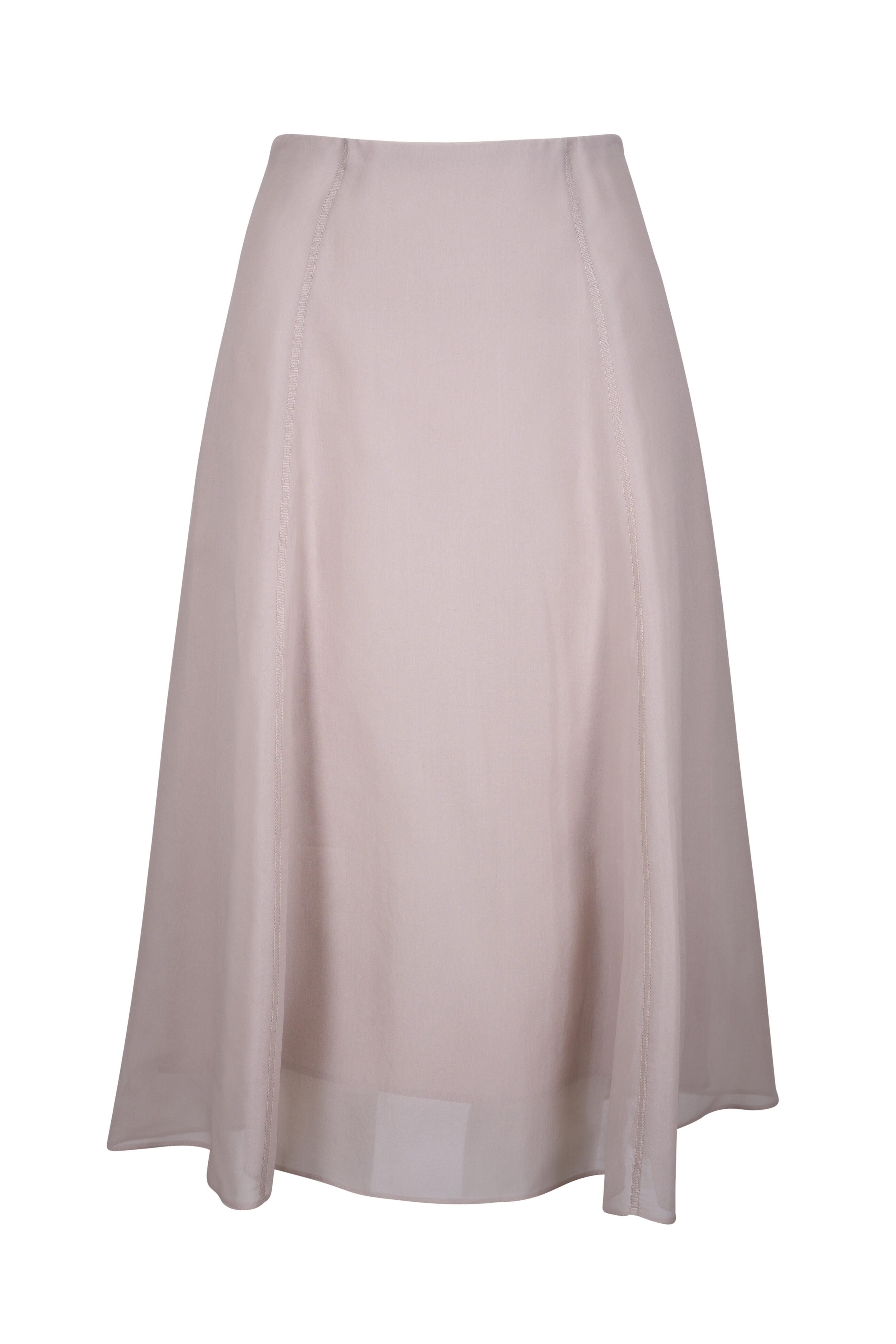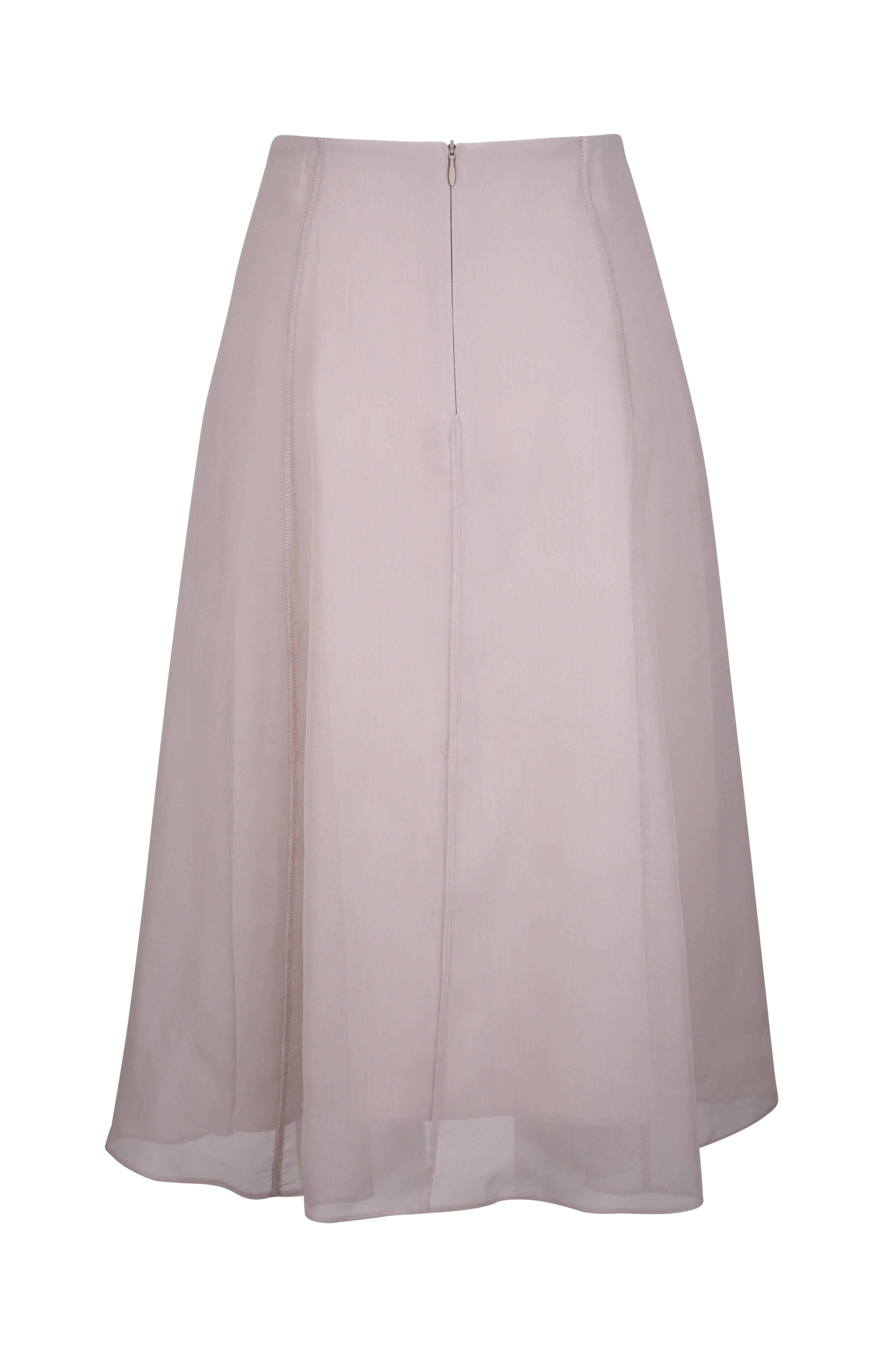 Banded waist. Concealed back zip. Made in Italy. 30" length. 100% silk; applique: 80% polyester, 20% elastane. Dry clean.