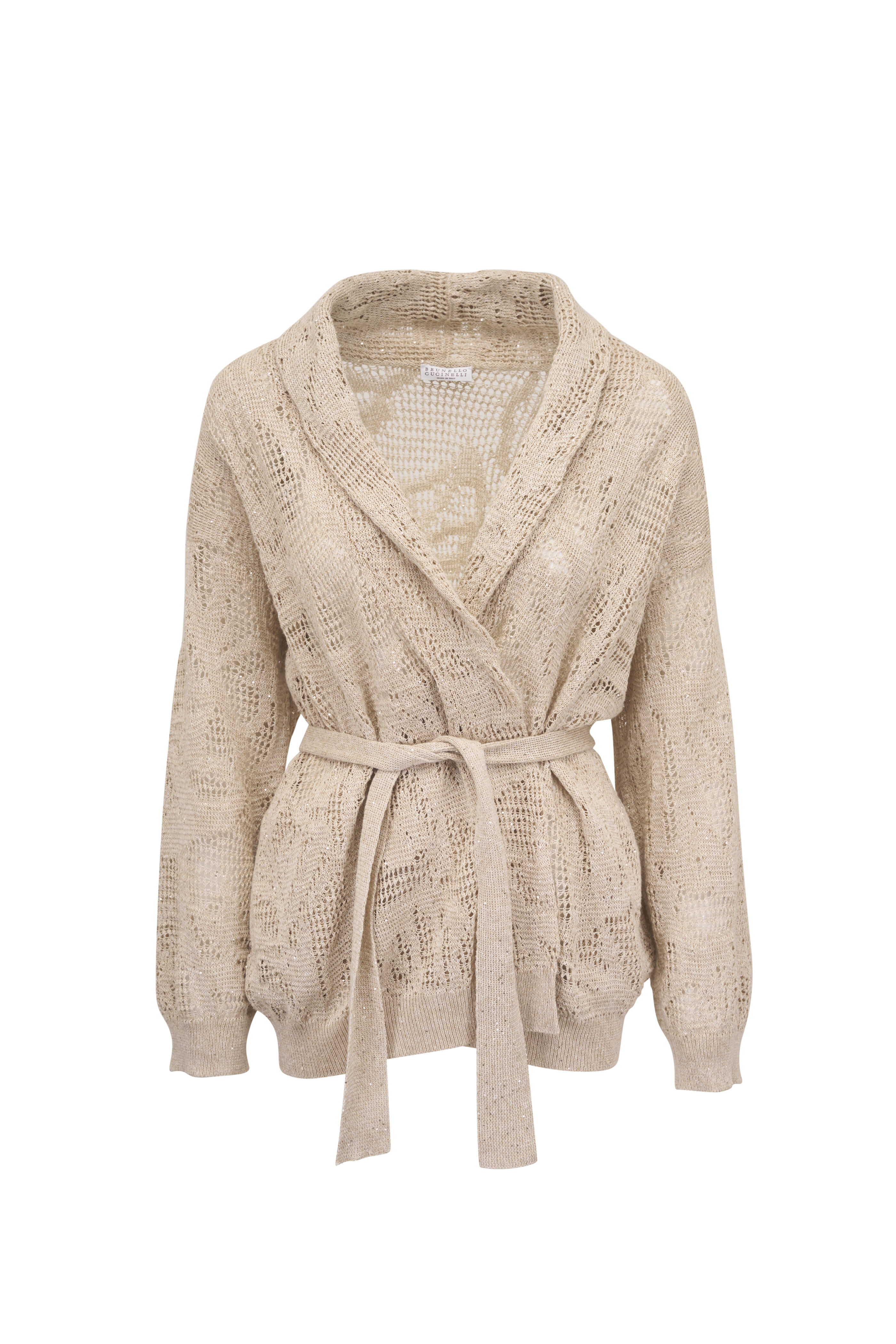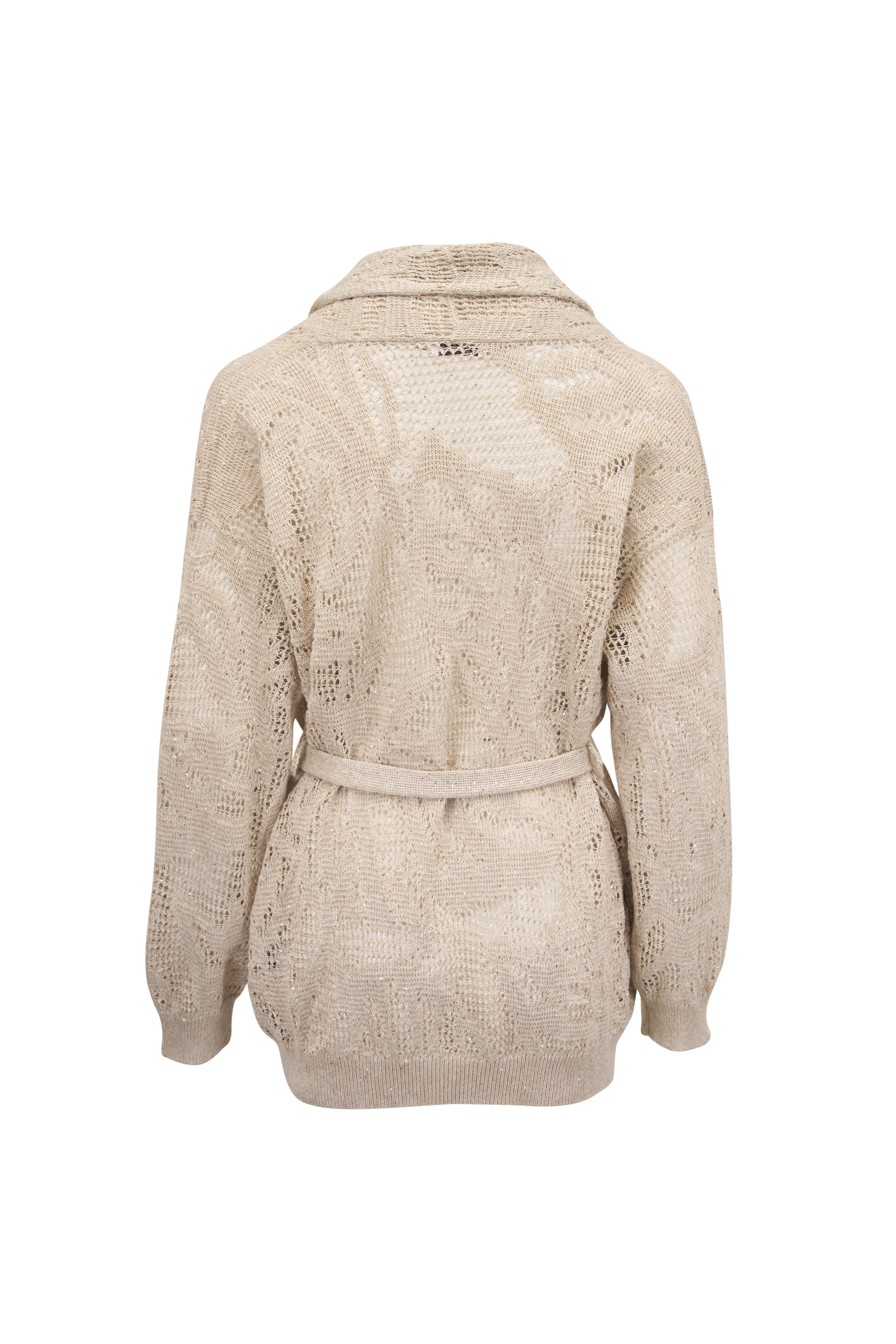 Shawl collar. Detachable self-tie belt. Side slip pockets. Ribbed knit cuffs and waistband. Made in Italy. 94% linen, 6% cotton. Dry clean.