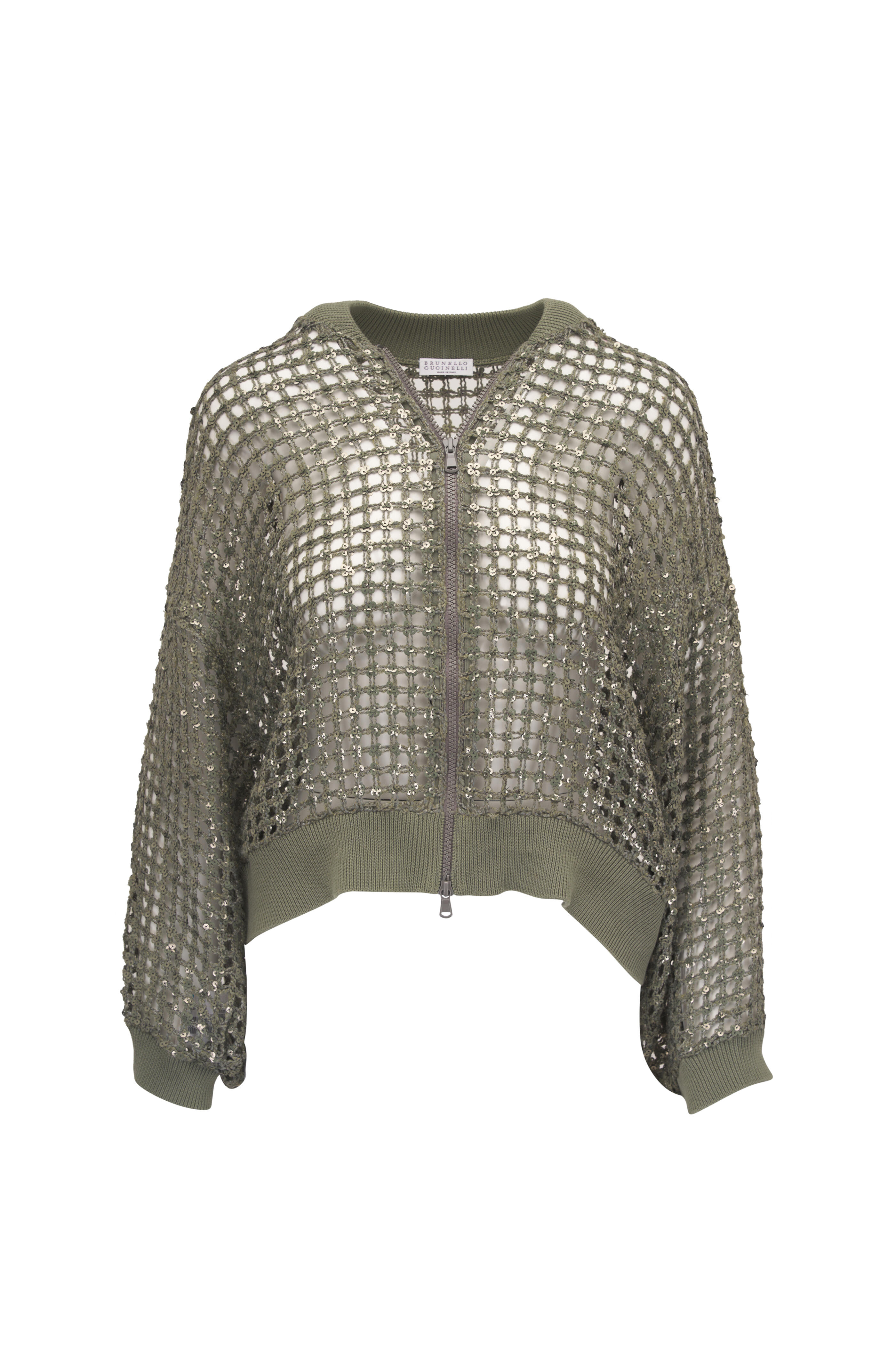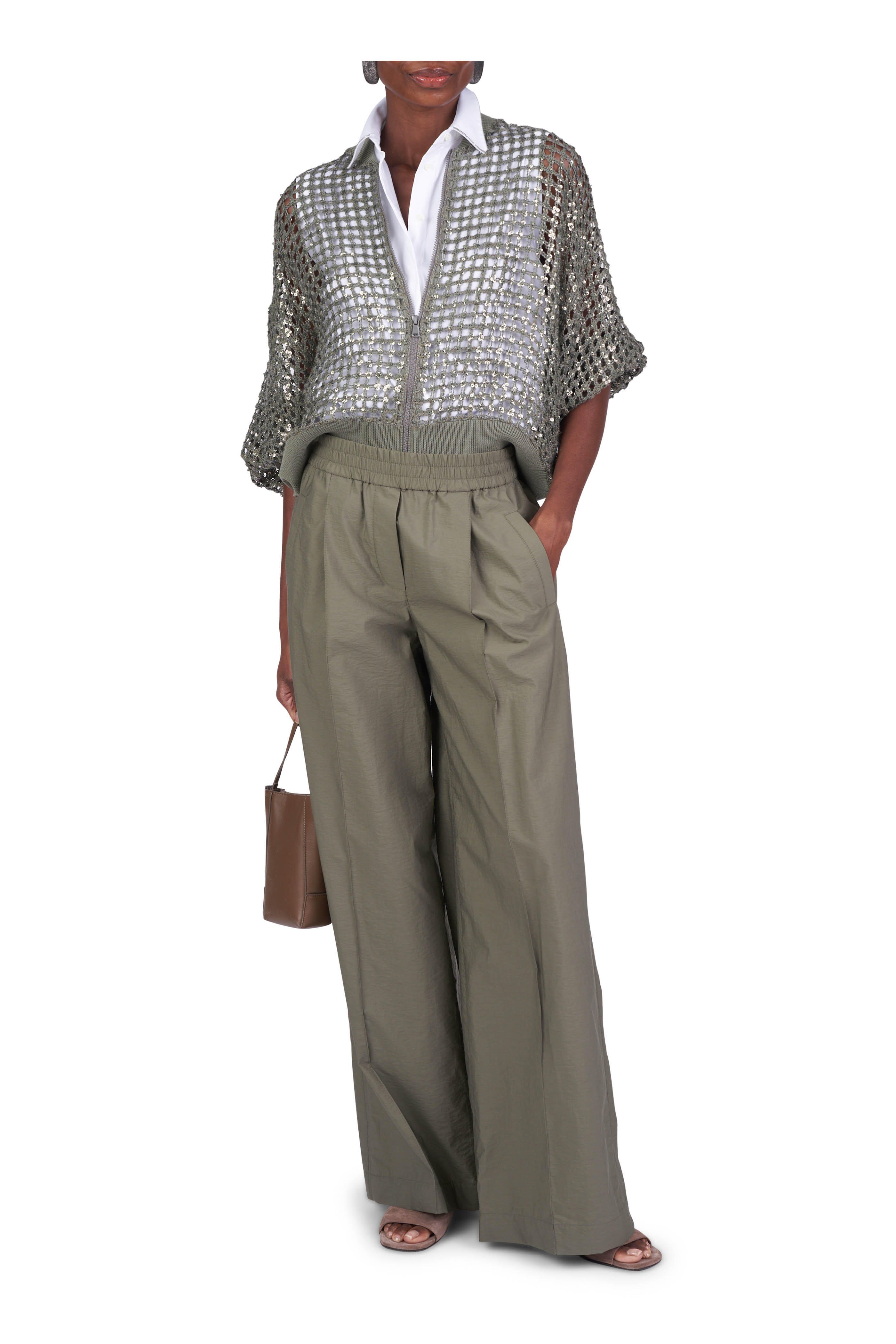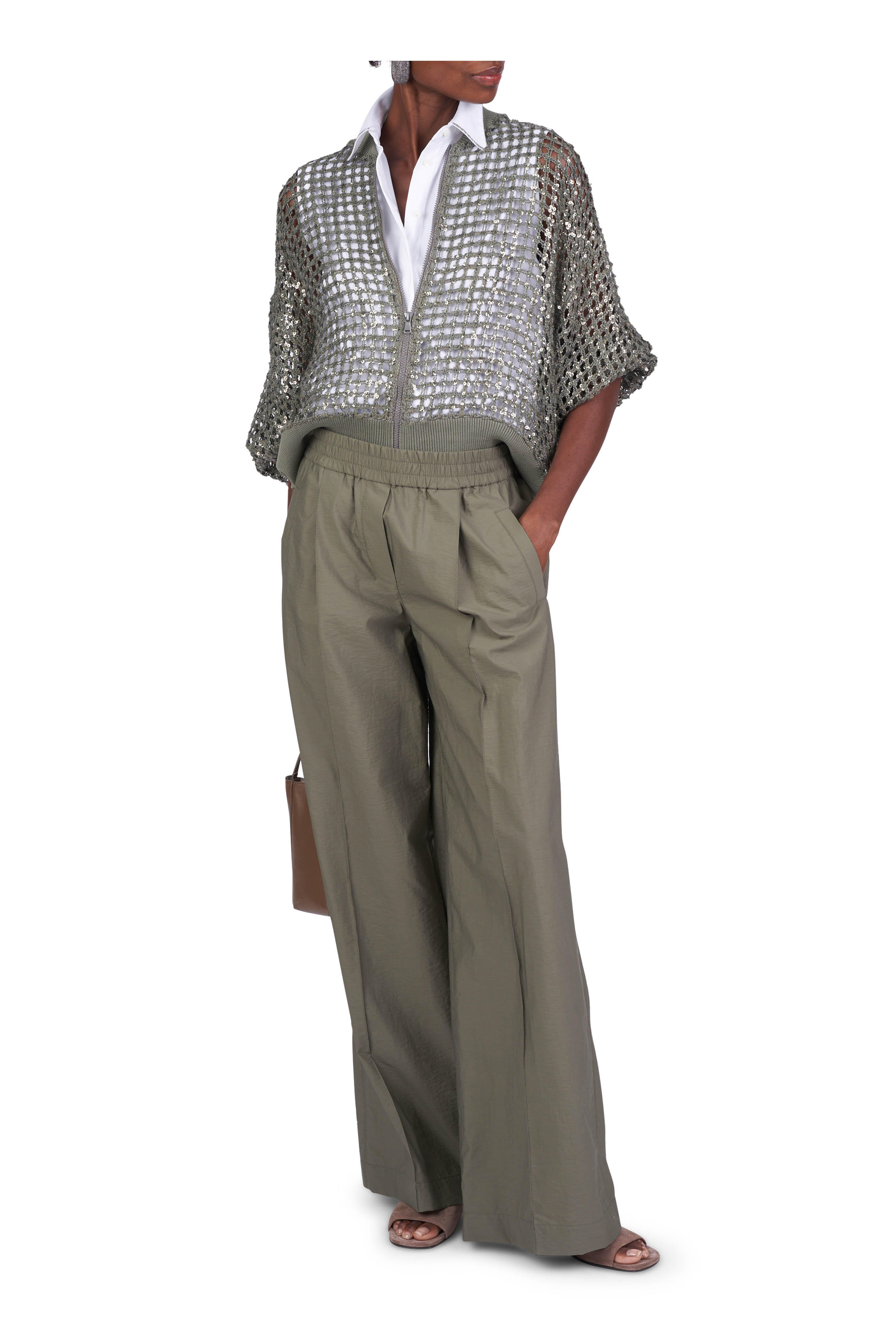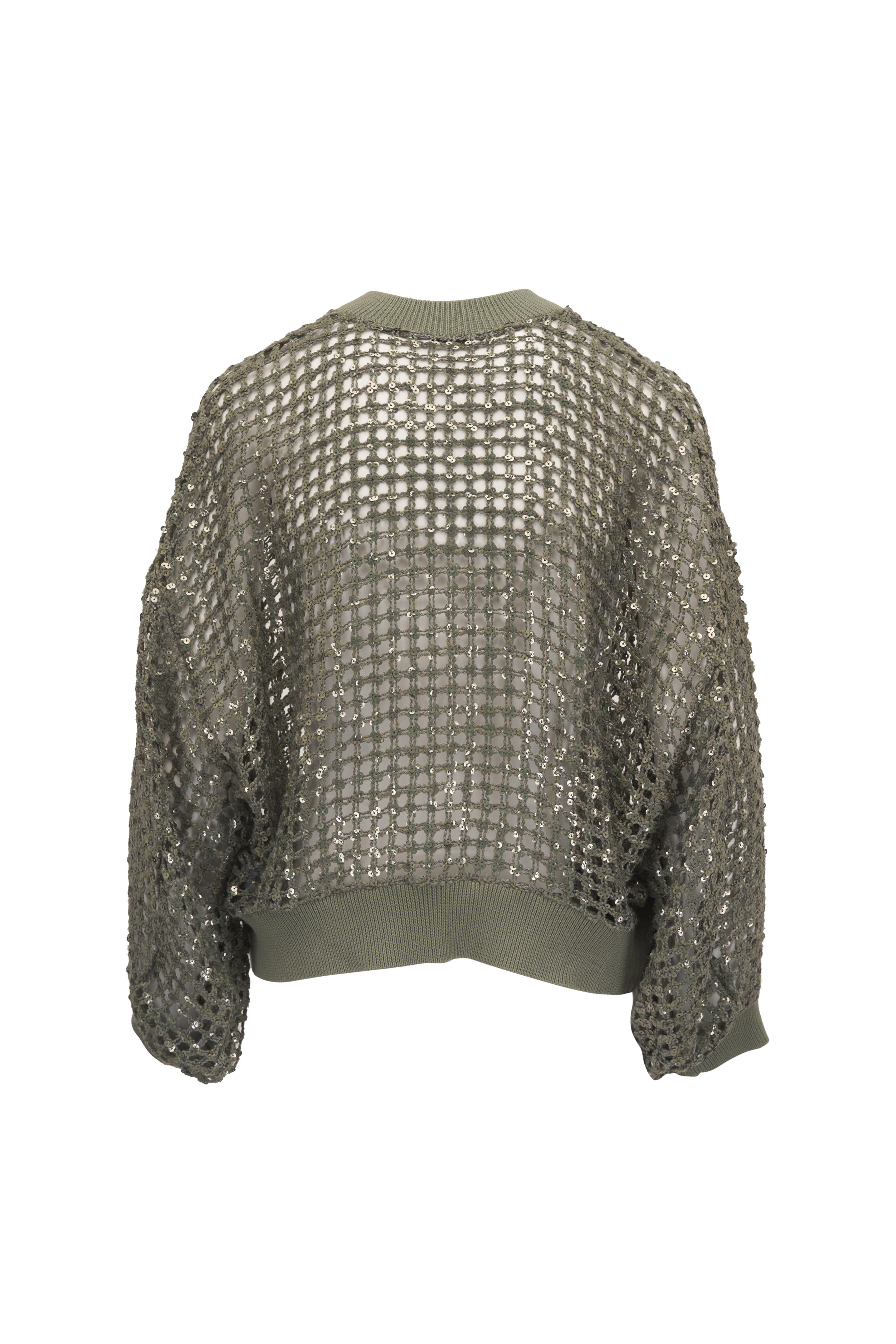 Paillette Eucalyptus Linen Open-Knit Zip Cardigan