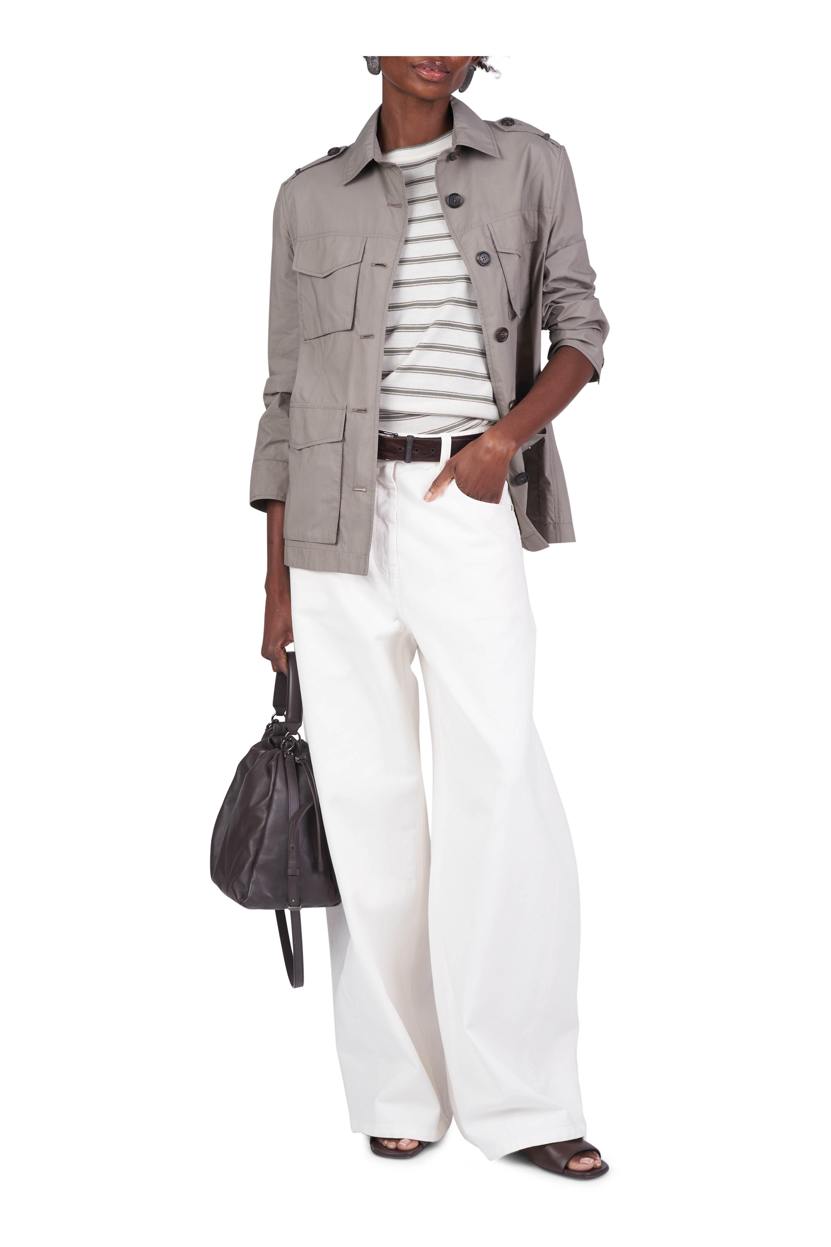 Spread collar. Front button placket. Lower flap patch pockets; chest flap patch pockets. Epaulettes with buttons. Button cuffs. Monili detailing. Made in Italy. 64% cotton, 36% nylon. Dry clean.