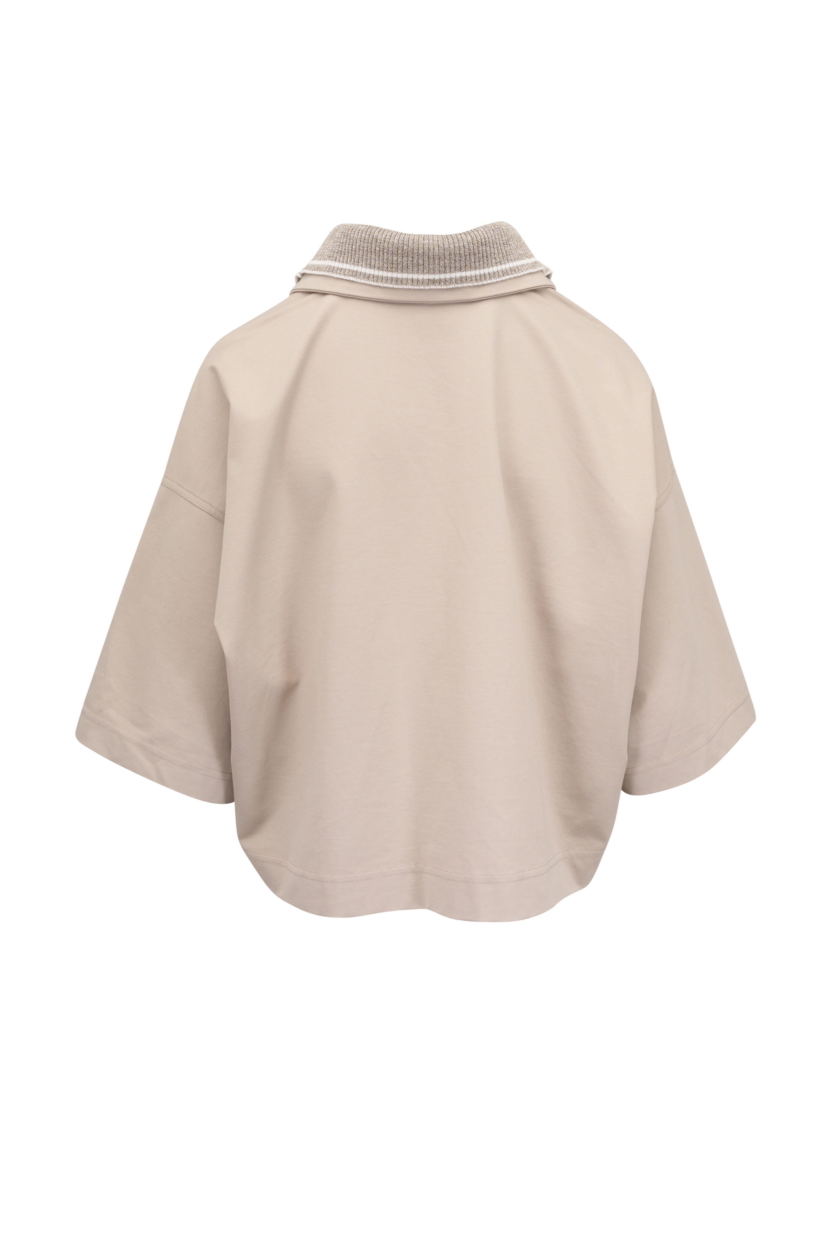 Spread collar. V-neckline. Drop shoulders. Oversized sleeves. Made in Italy. 65% cotton, 29% nylon, 6% elastane. Hand wash.