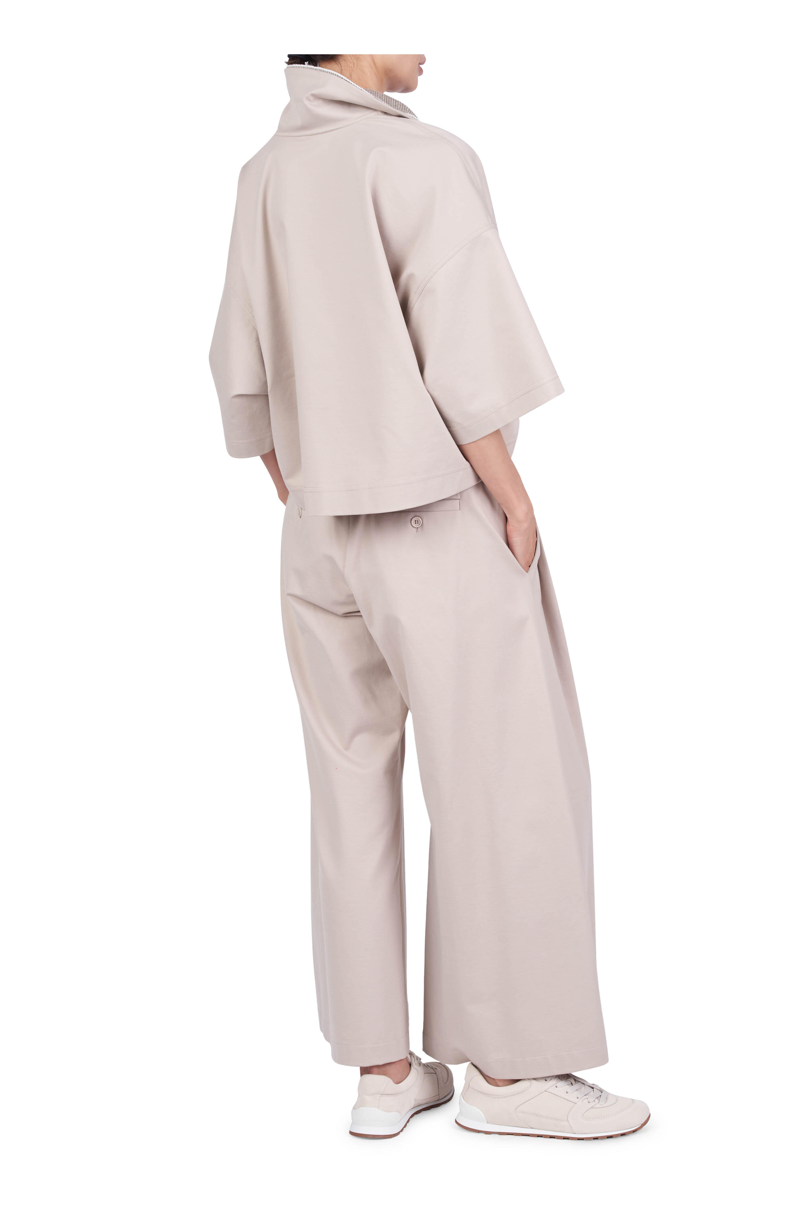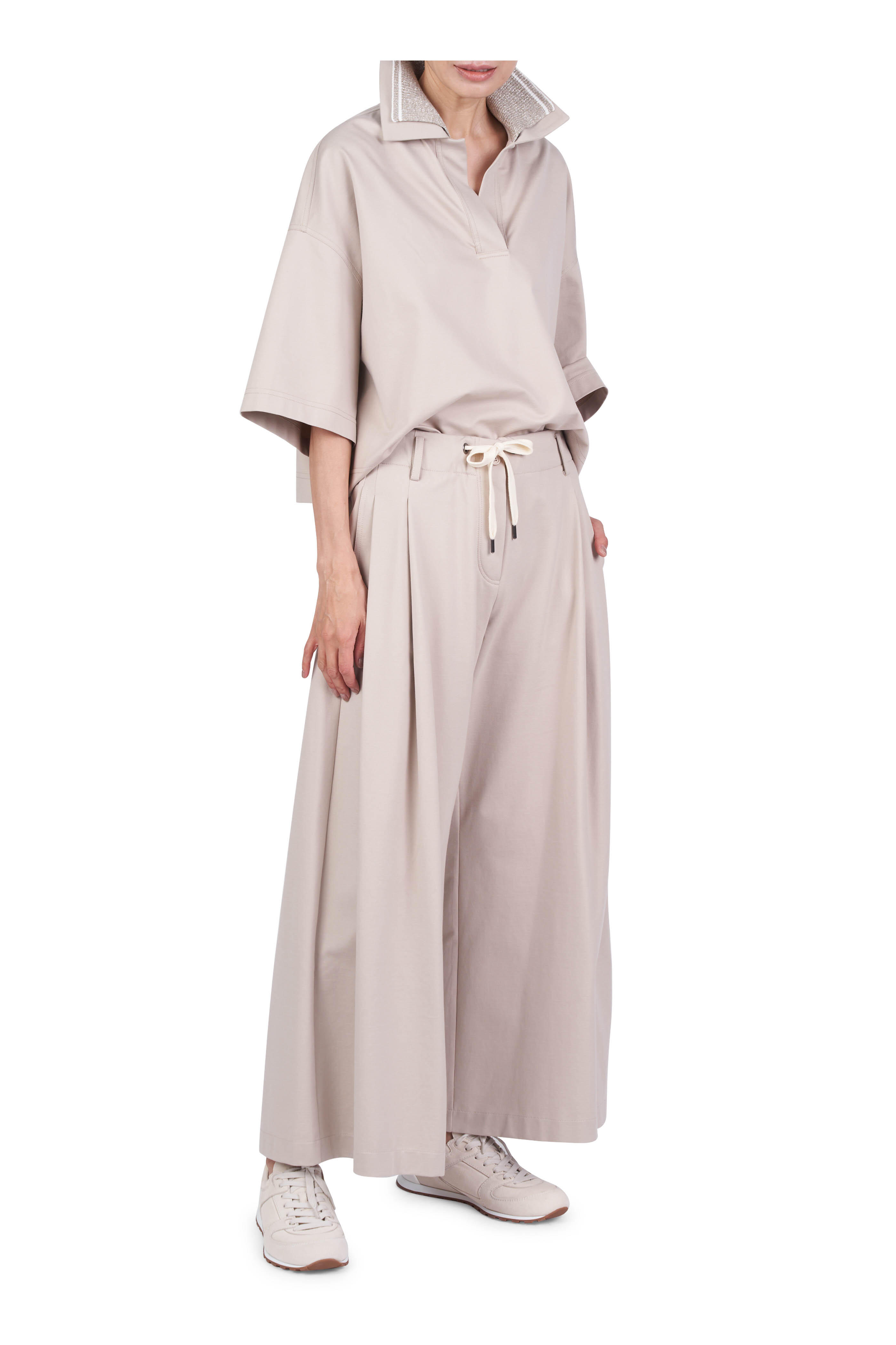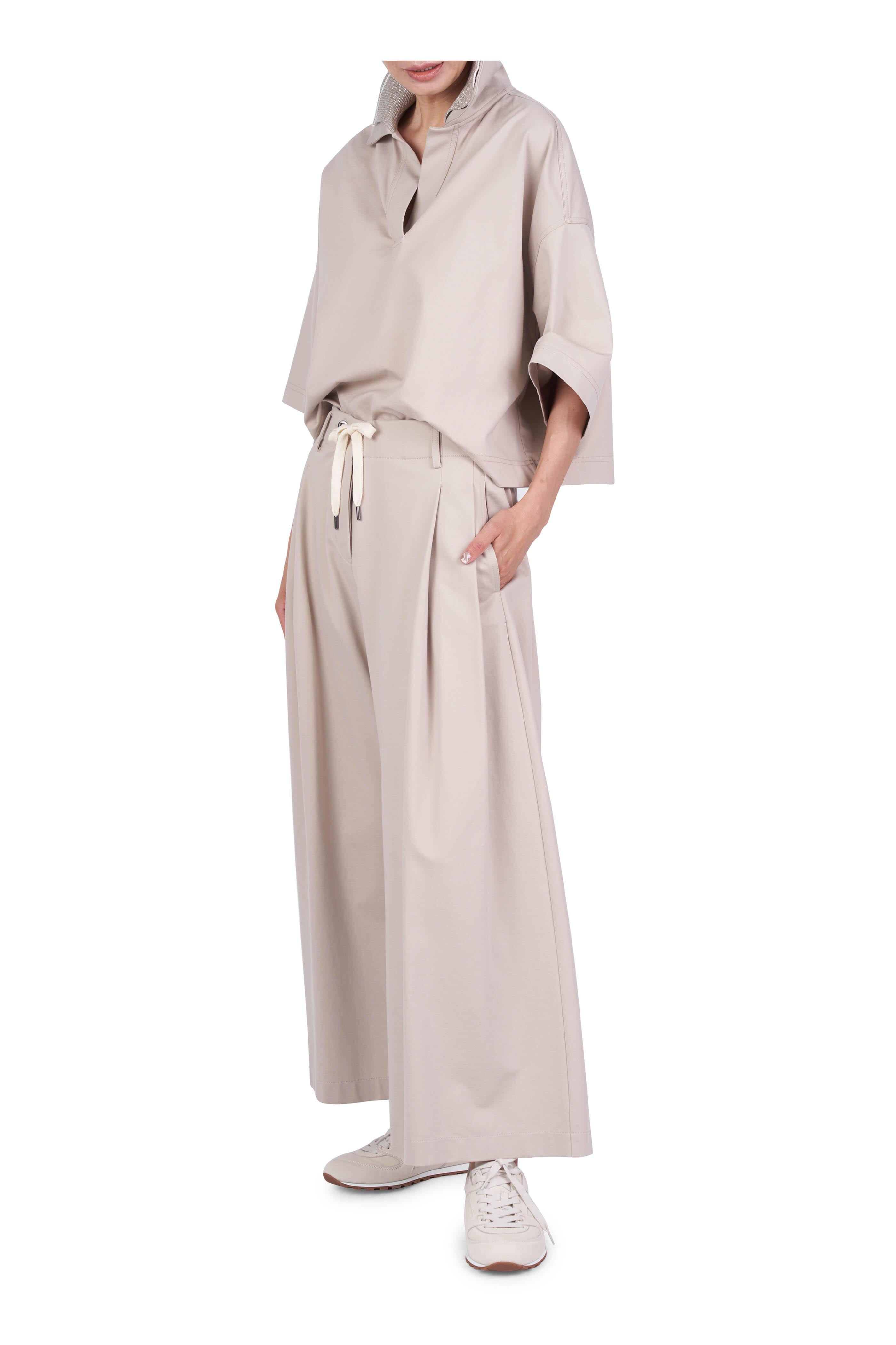 Elastic waistband with drawstring; button closure. Belt loops. Side slip pockets; back welt pockets with button. Double pleat. Monili detailing. Made in Italy. 65% cotton, 29% nylon, 6% elastane. Hand wash.