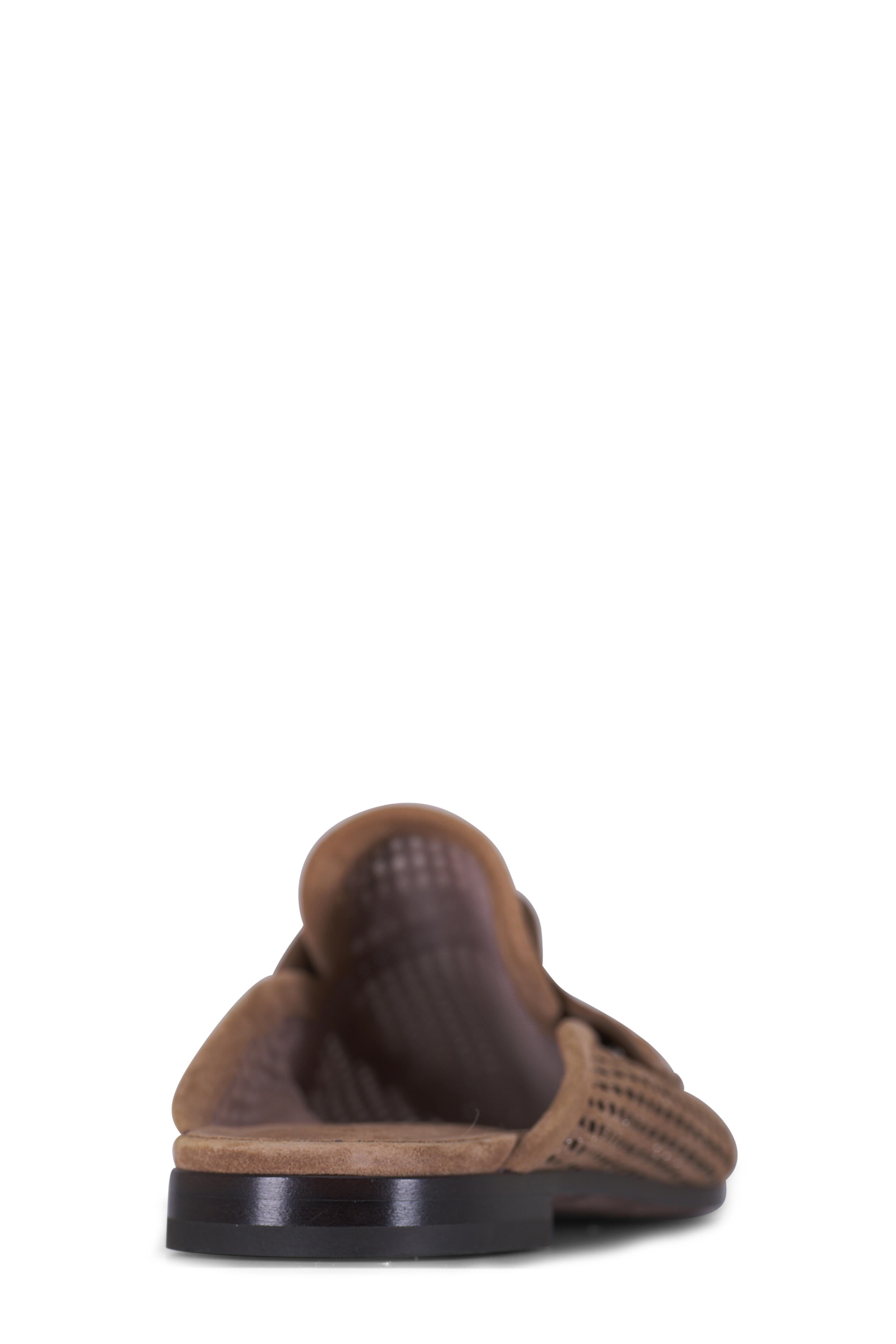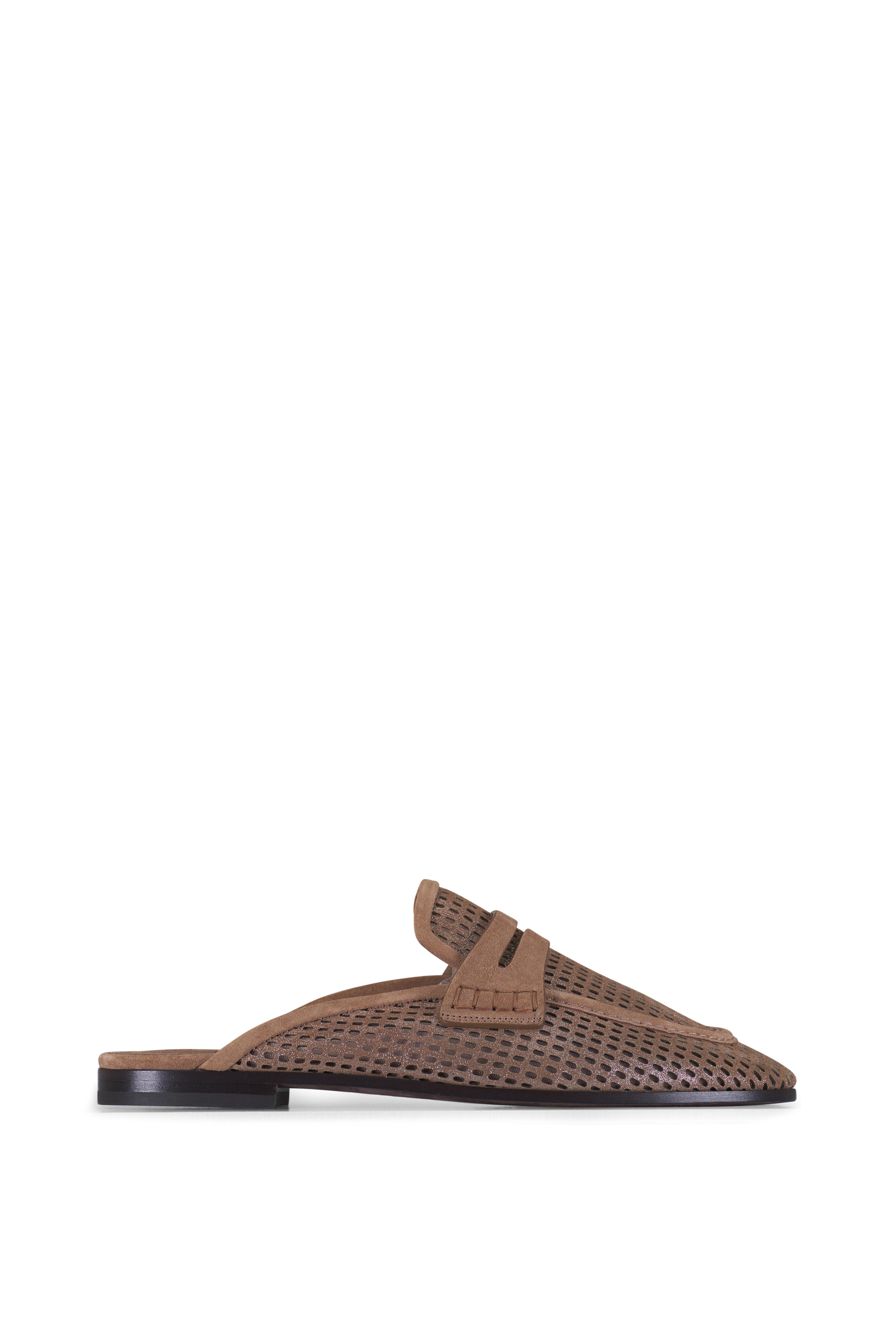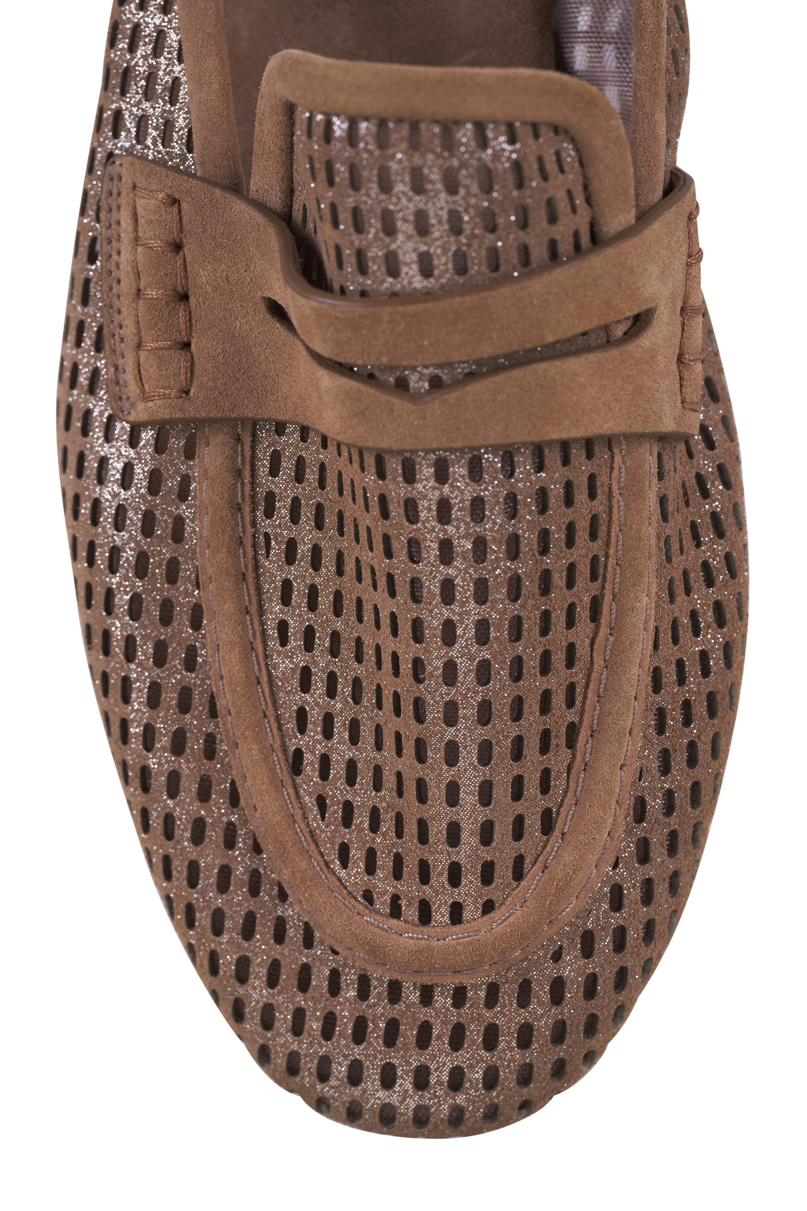 Laser cut sparkling leather upper. Round toe. Slip on style. Penny strap at vamp. Non-slip rubber insert. Leather sole. Made in Italy.