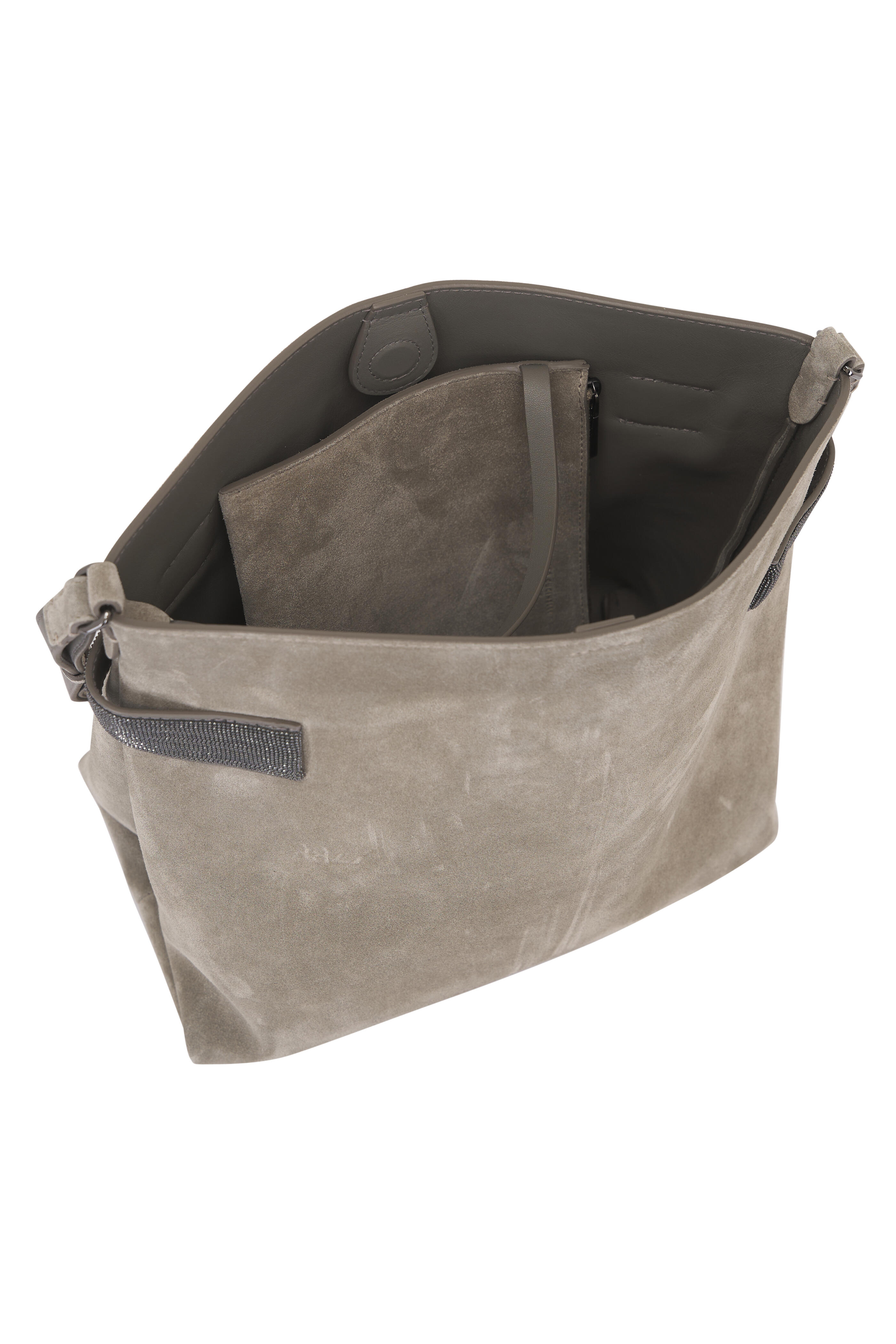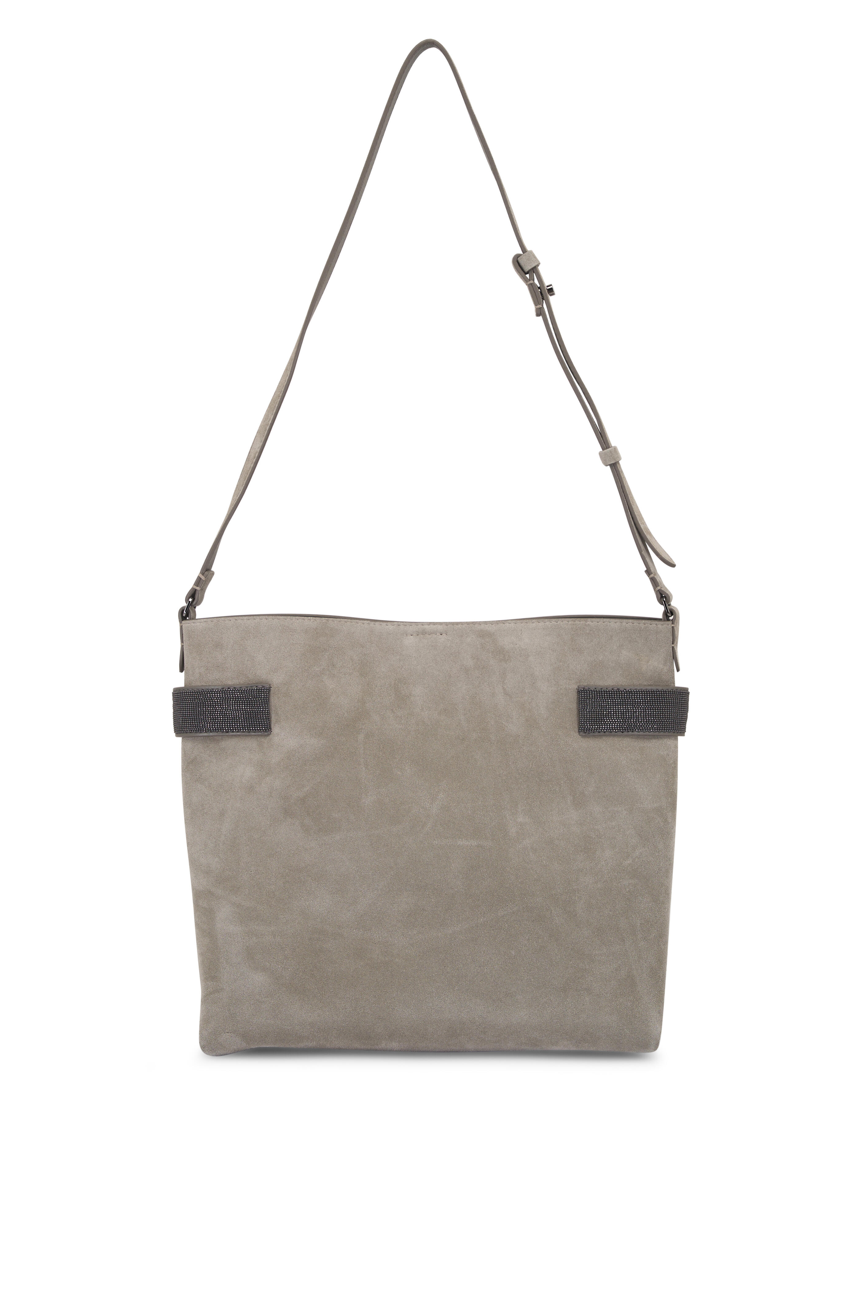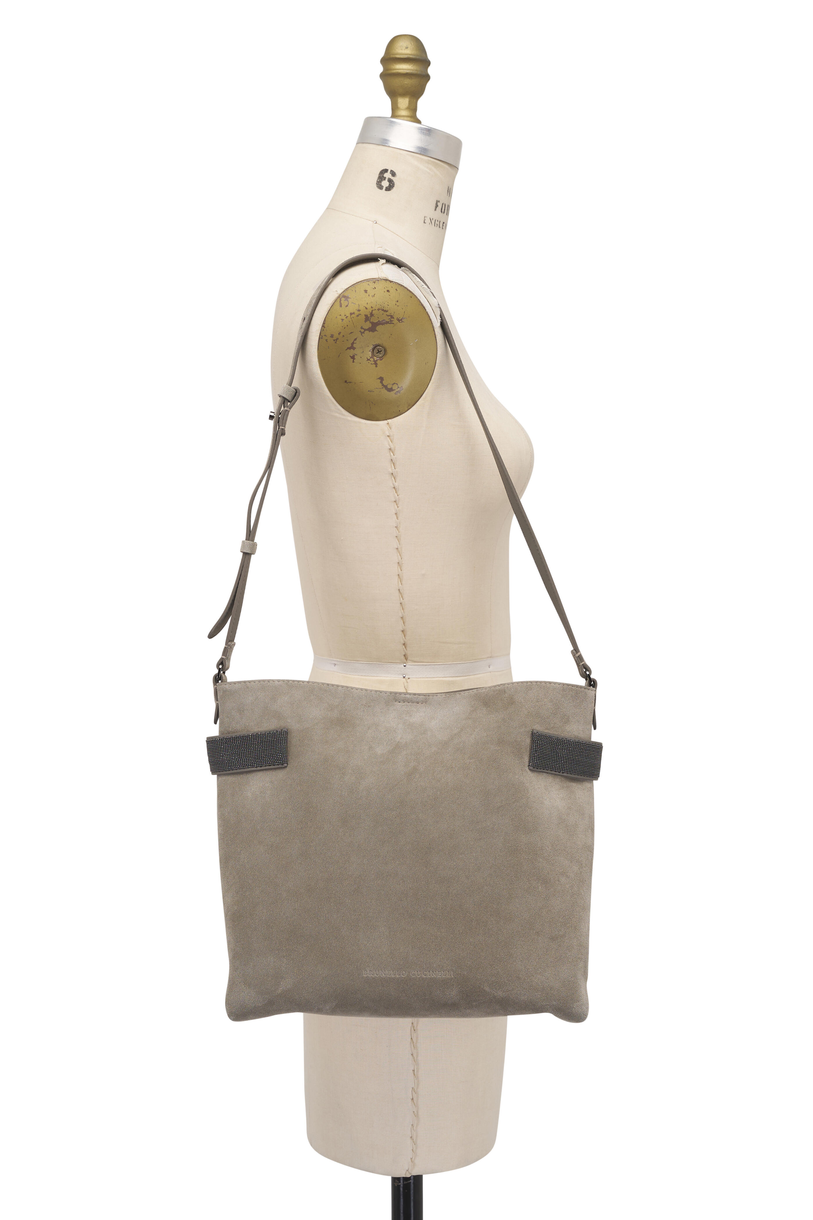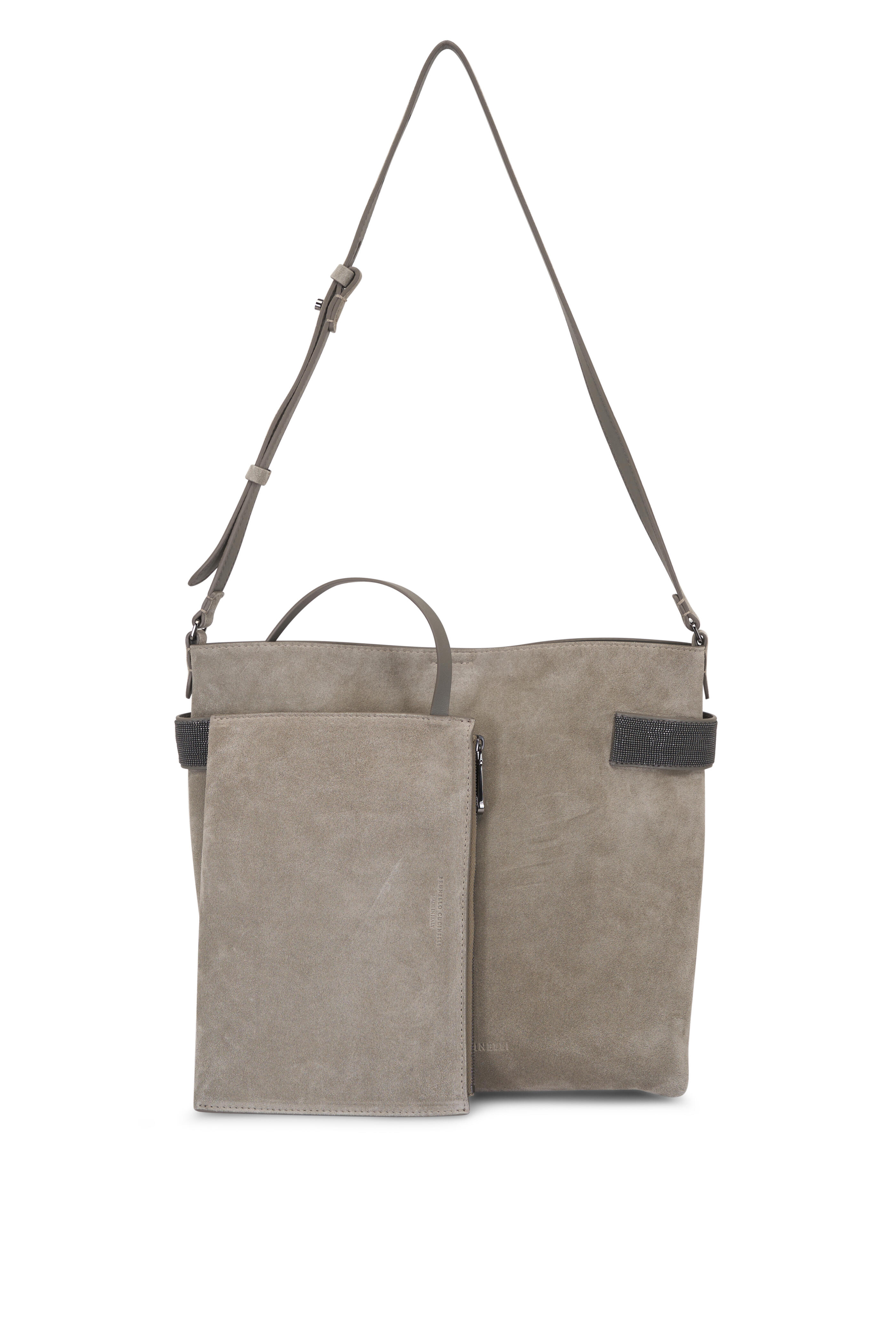 Suede outer. Leather lining. Magnetic clasps. Adjustable, detachable shoulder strap. Nickel-free monili detailing. Internal pocket with zip closure. Detachable internal pochette with zipper. Made in Italy. 7.48" L x 3.54" W x 6.69" H.