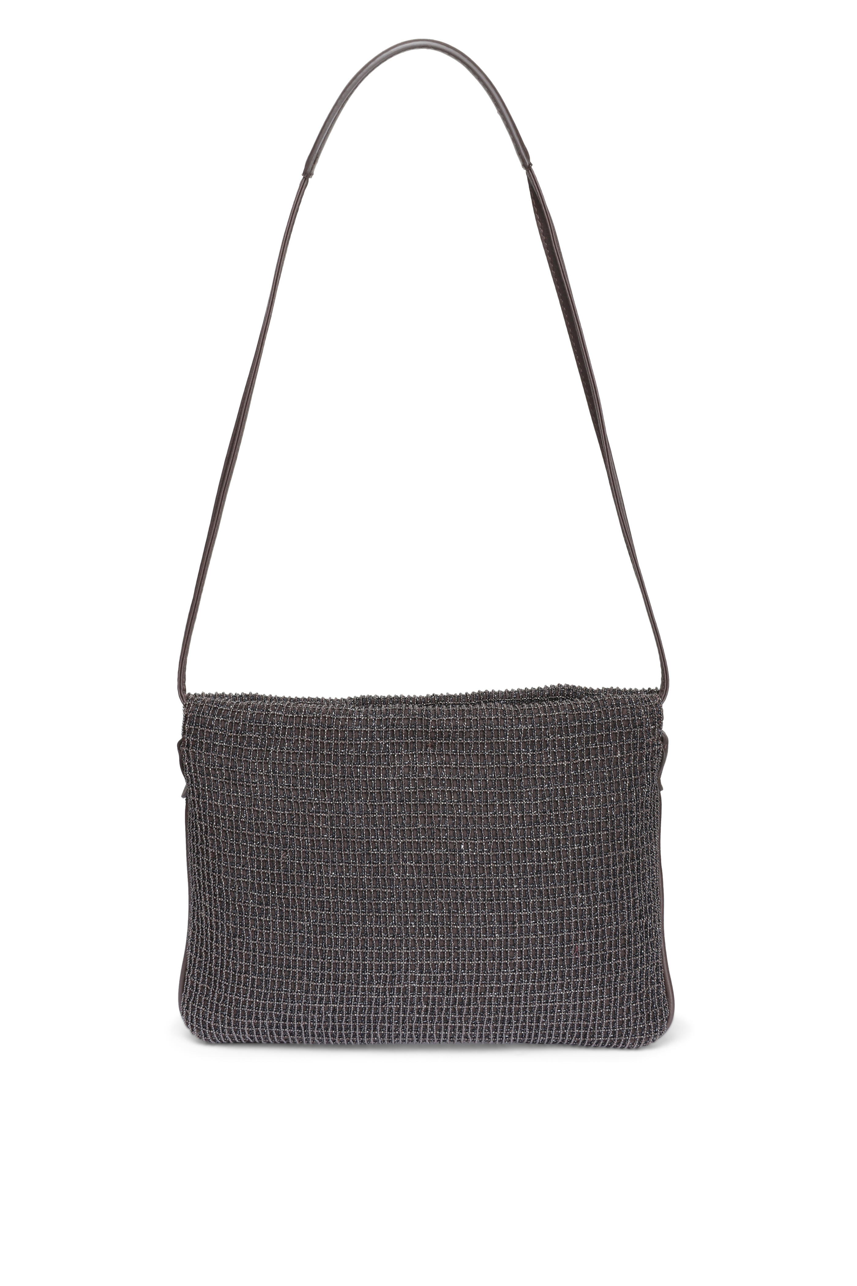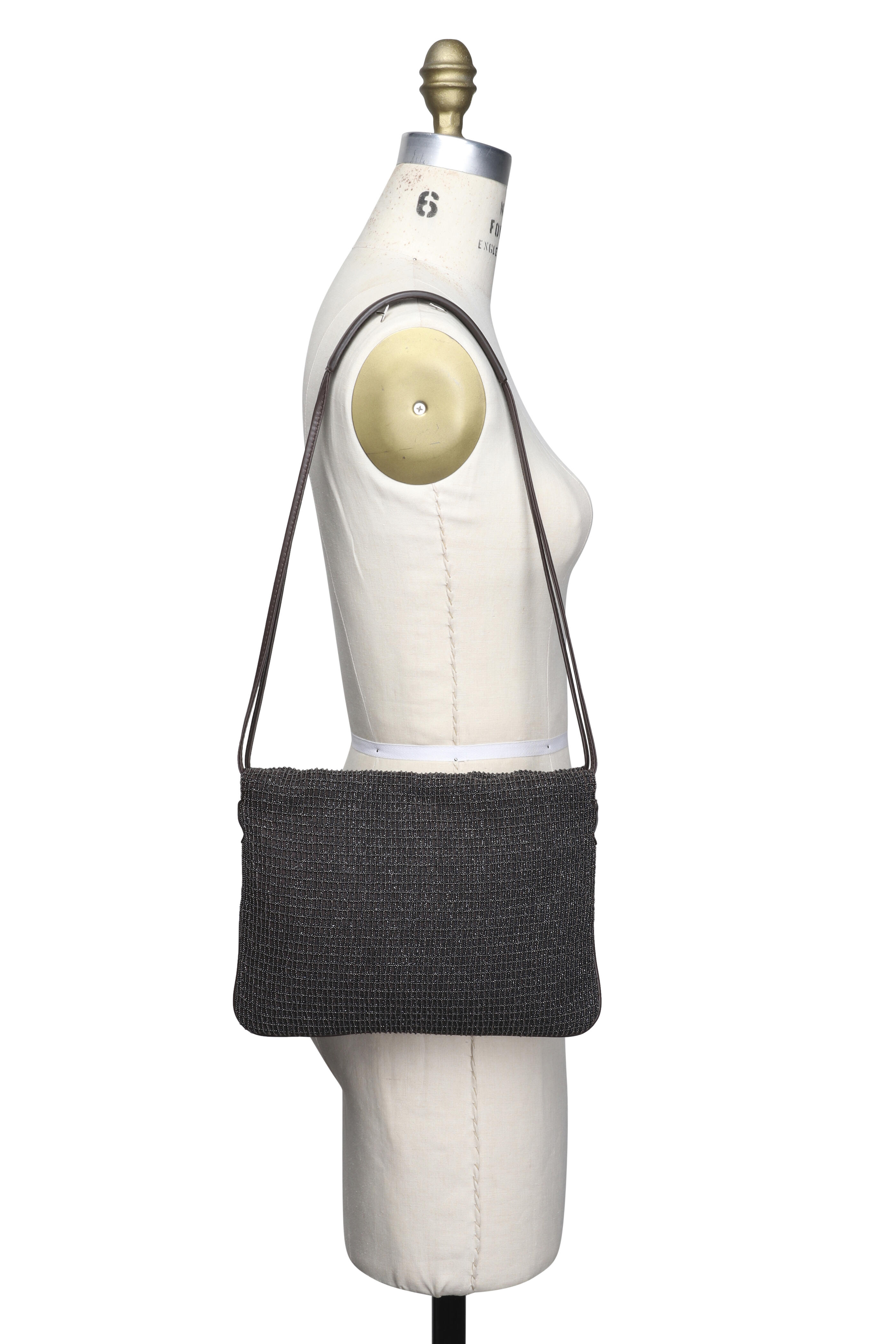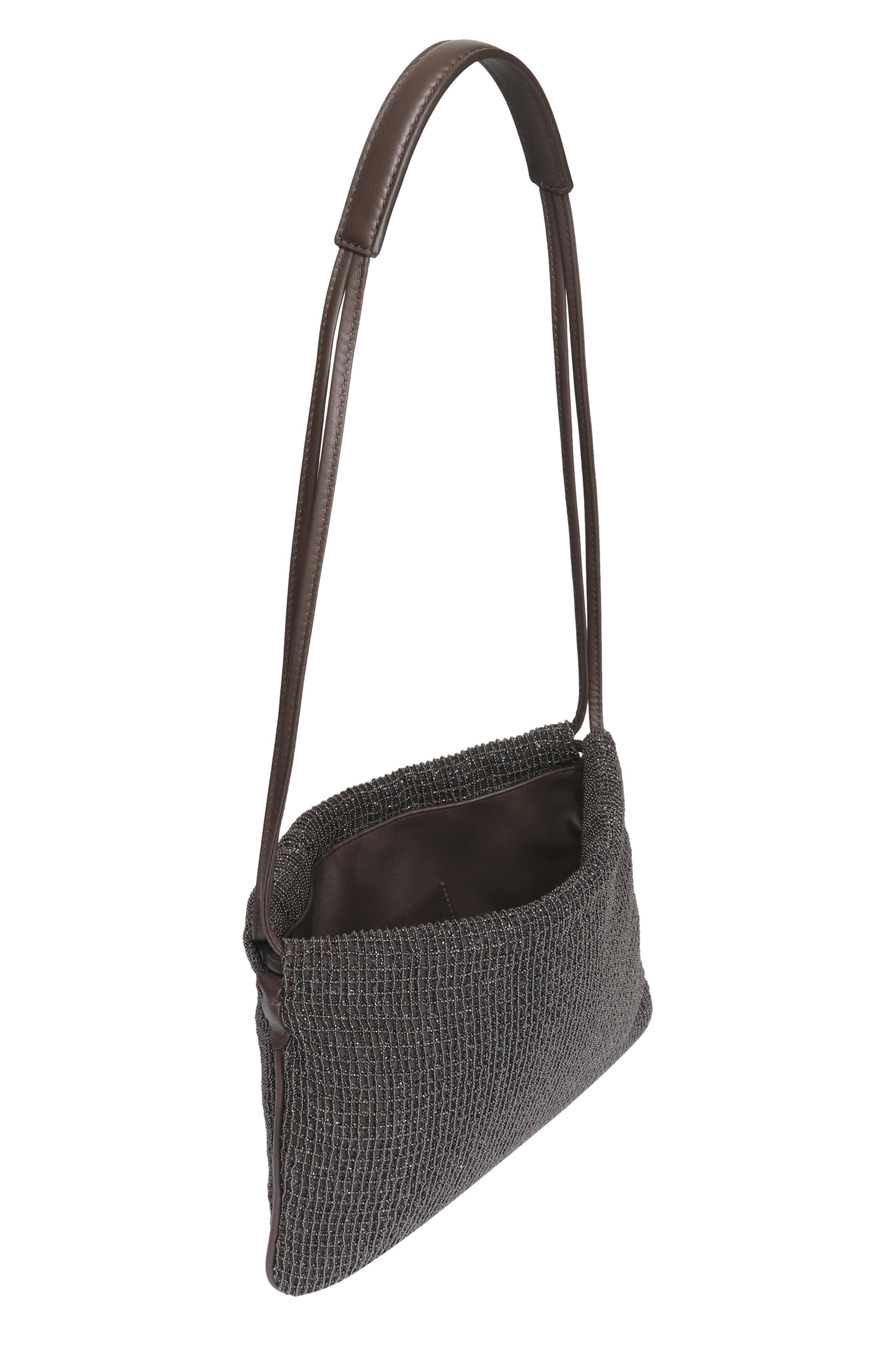 Leather and monili netting. Drawstring closure. Shoulder strap. Interior pocket. Leather lining. Made in Italy. Length: 9.84". Width: 7.87". Depth: 0.79".