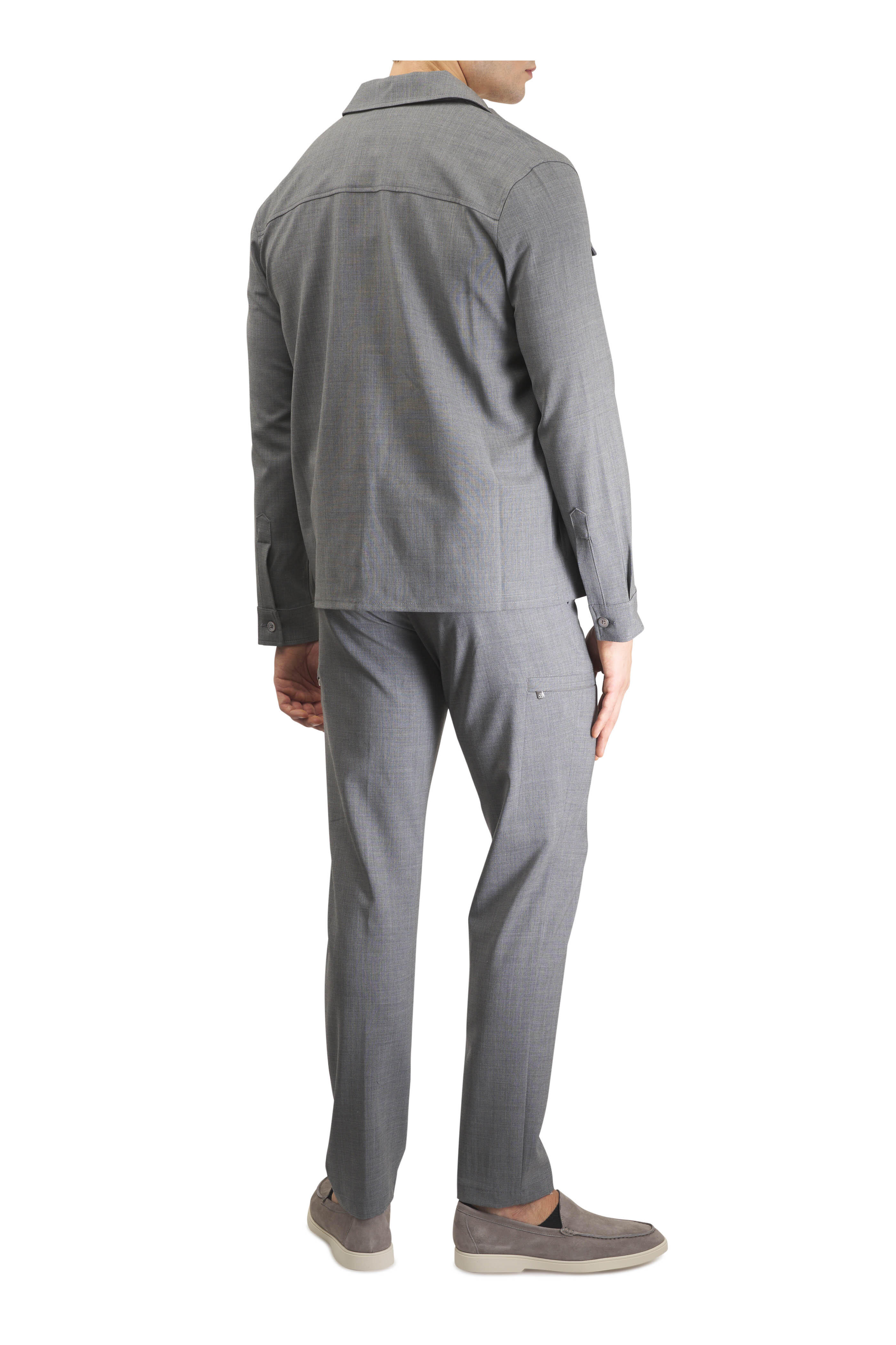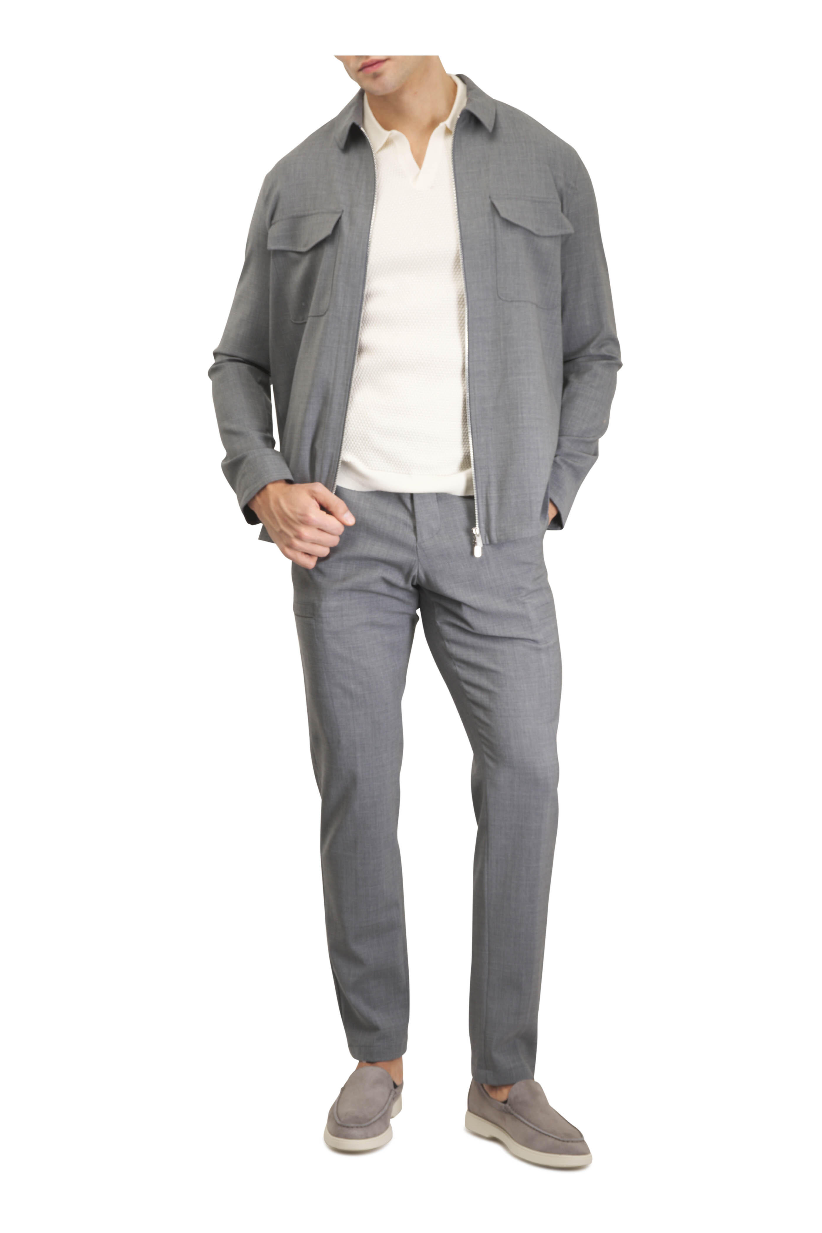 Johnny collar. Ribbed trims. Imported. 60% cotton, 20% viscose, 15% nylon, 5% cashmere. Hand wash.
