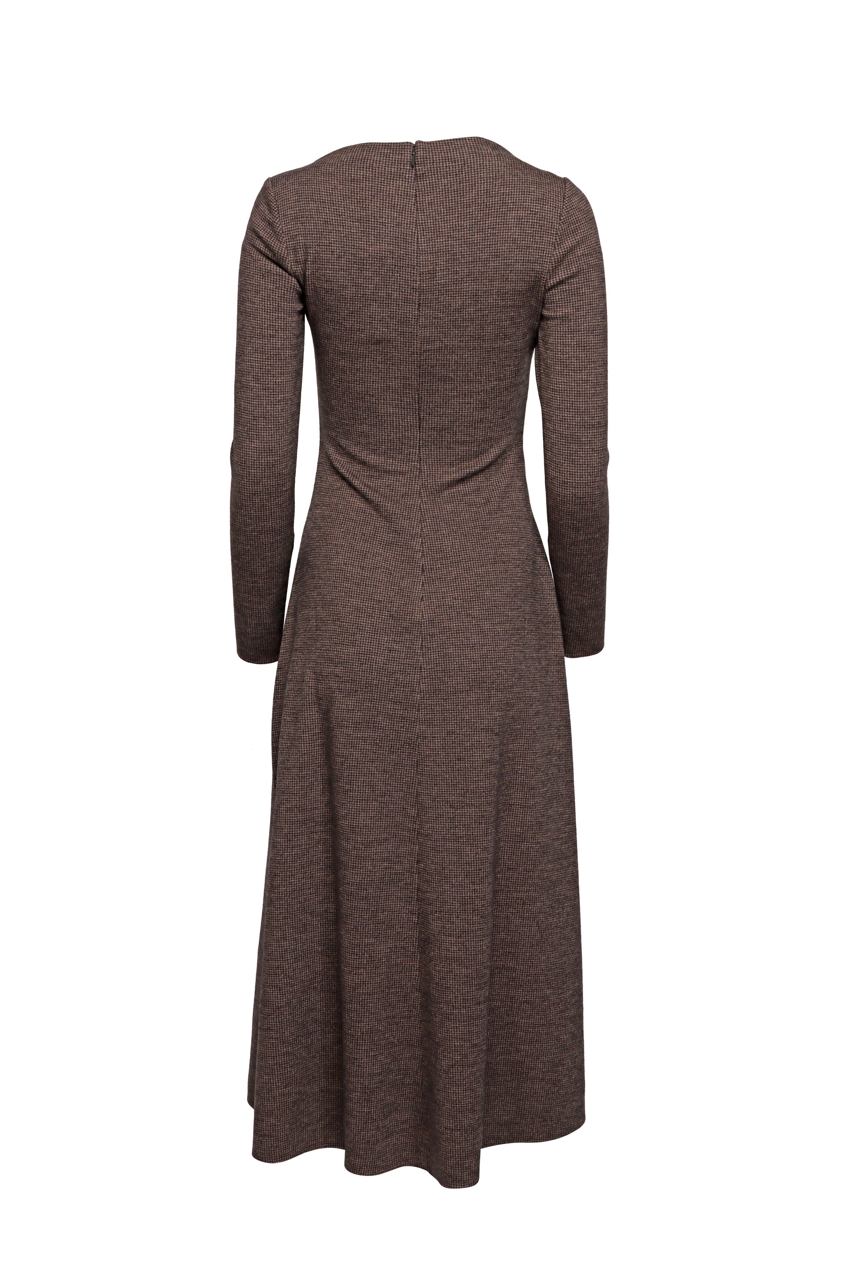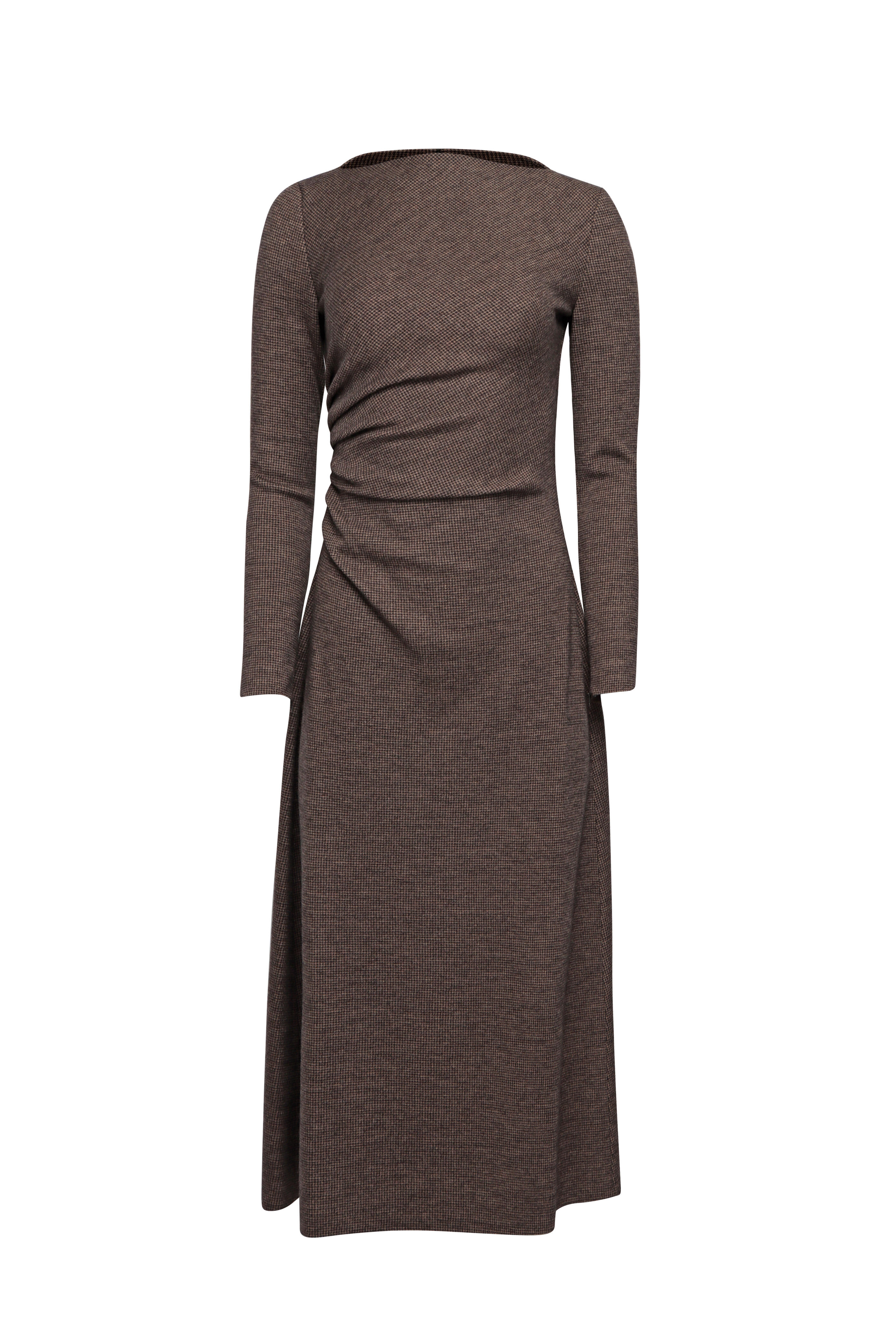 Straight neck. Long sleeves; concealed zip cuffs. Concealed back zip closure. Ruched at right hip. Aline silhouette. Made in Italy. Sleeve 23.8” (US 8). Length 51.5” (US 8). Midi length. 100% wool. Dry clean.