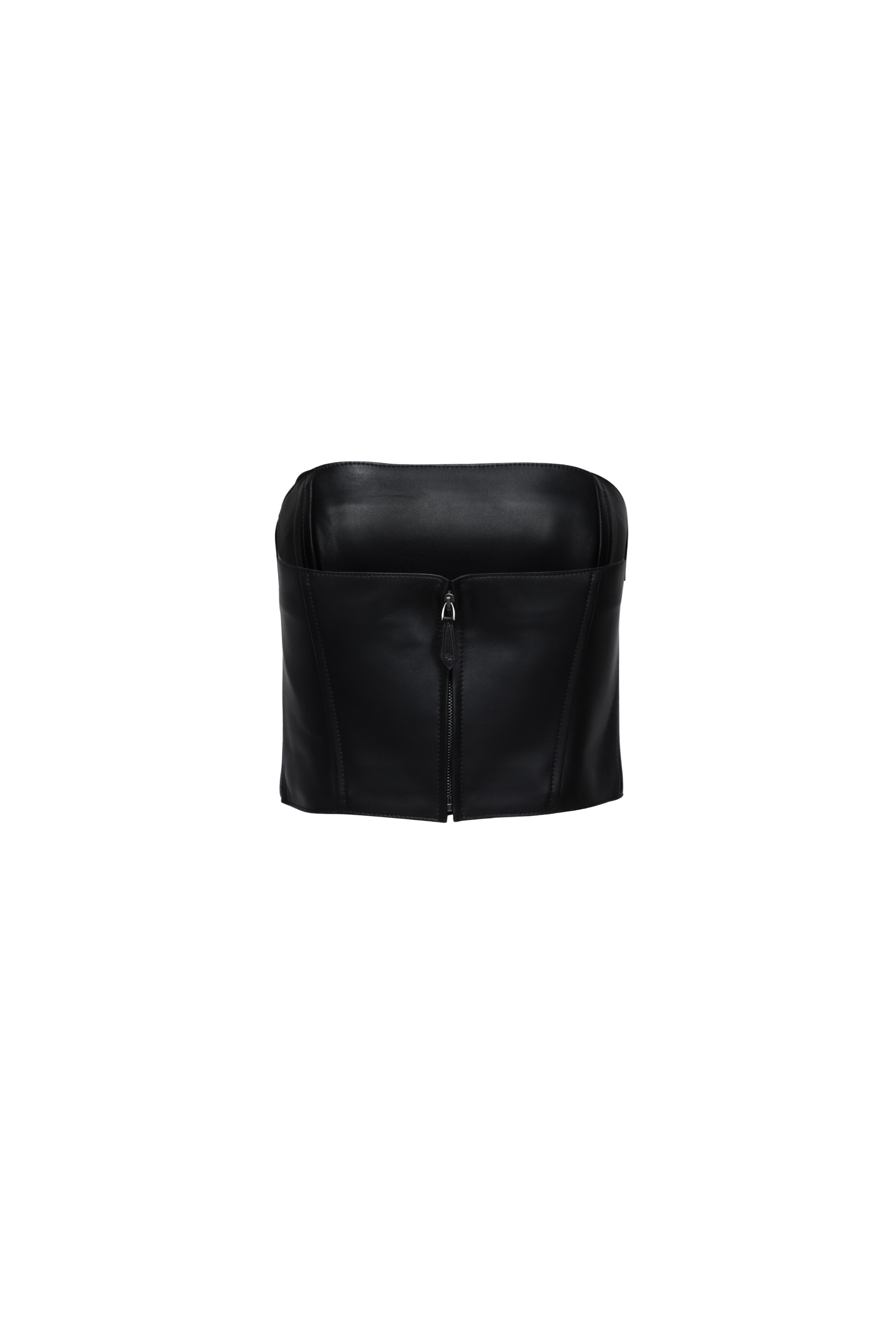 Strapless. Concealed back zip closure. Slim silhouette. Made in Italy. Length 10.5” (all sizes). Cropped length. 100% leather outer, 95% cupro, 5% elastane. Dry clean with leather specialist.