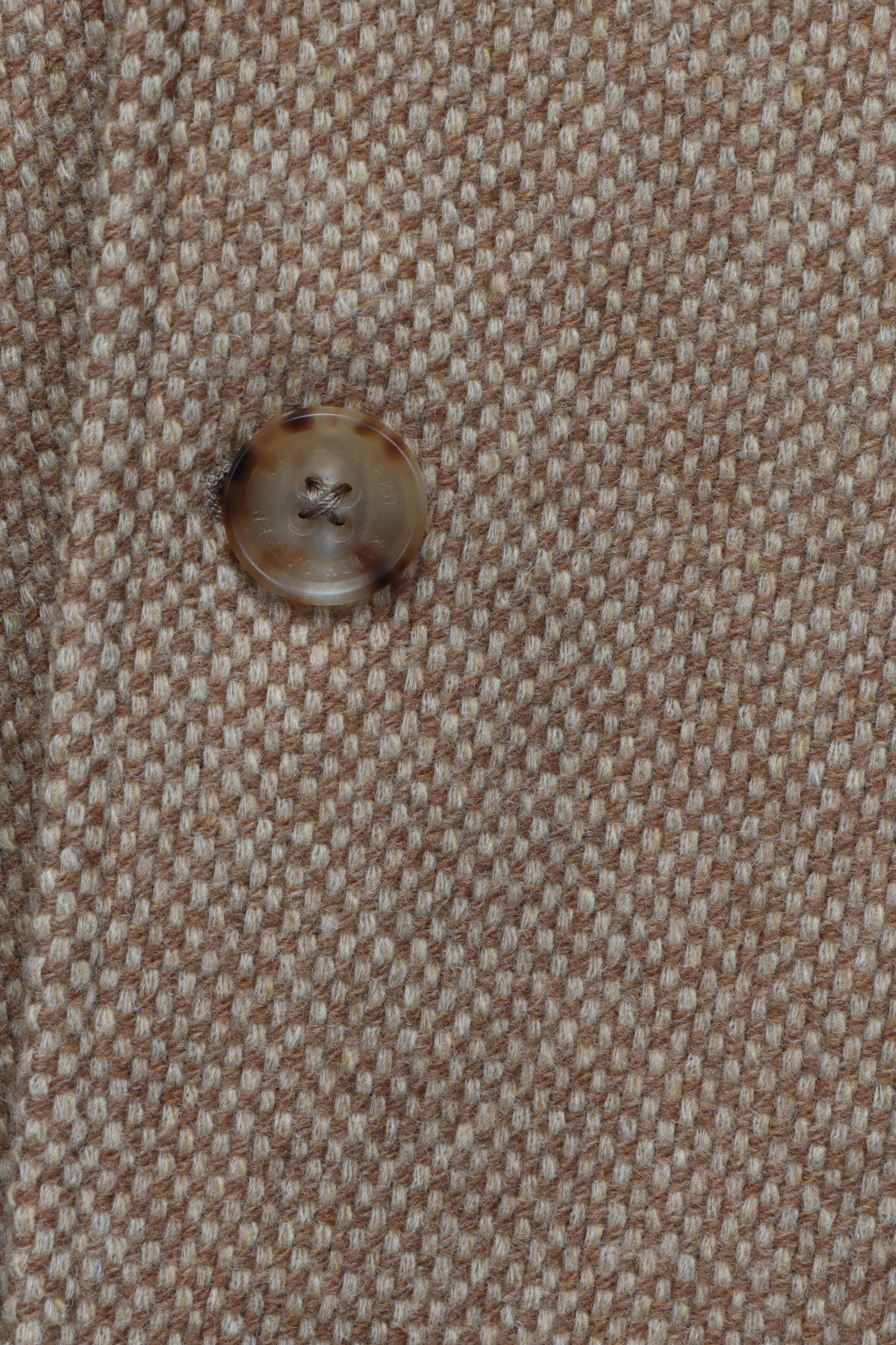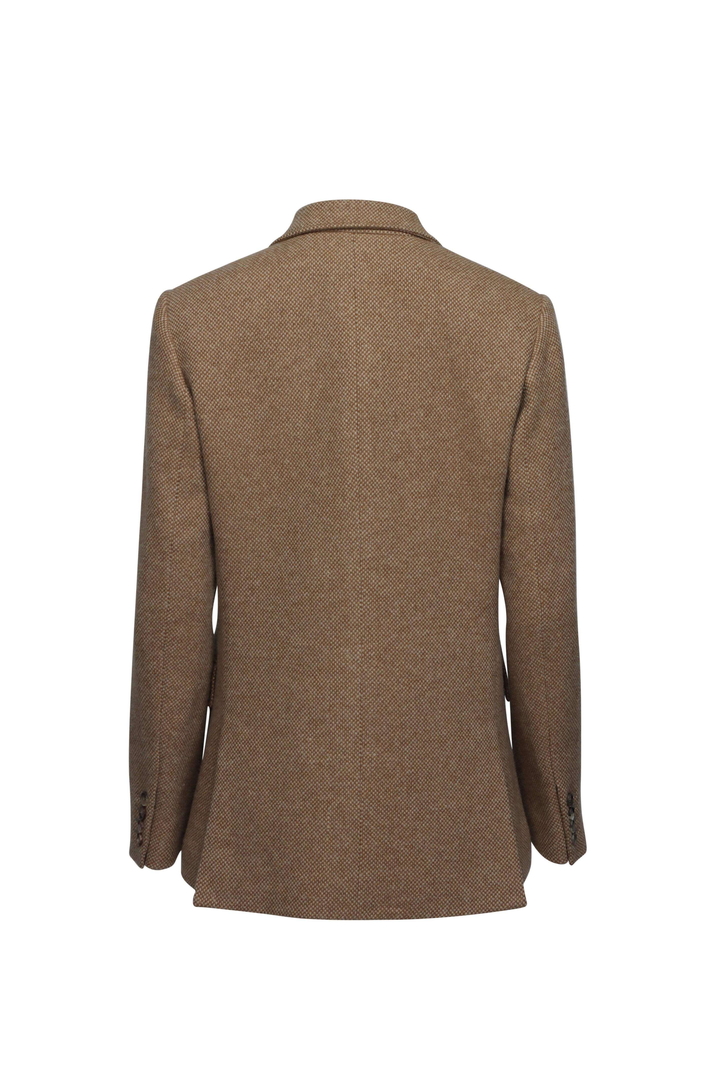 Notch lapel. Long sleeves; button cuffs. Single breasted front button closure. Single chest welt pocket. Hip welt pocket. Tailored fit. Tweed fabrication. Made in Italy. Sleeve 25” (US 8). Length 75.5” (US 8). 86% wool, 14% cashmere outer, 95% cupro, 5% elastane lining. Dry clean.