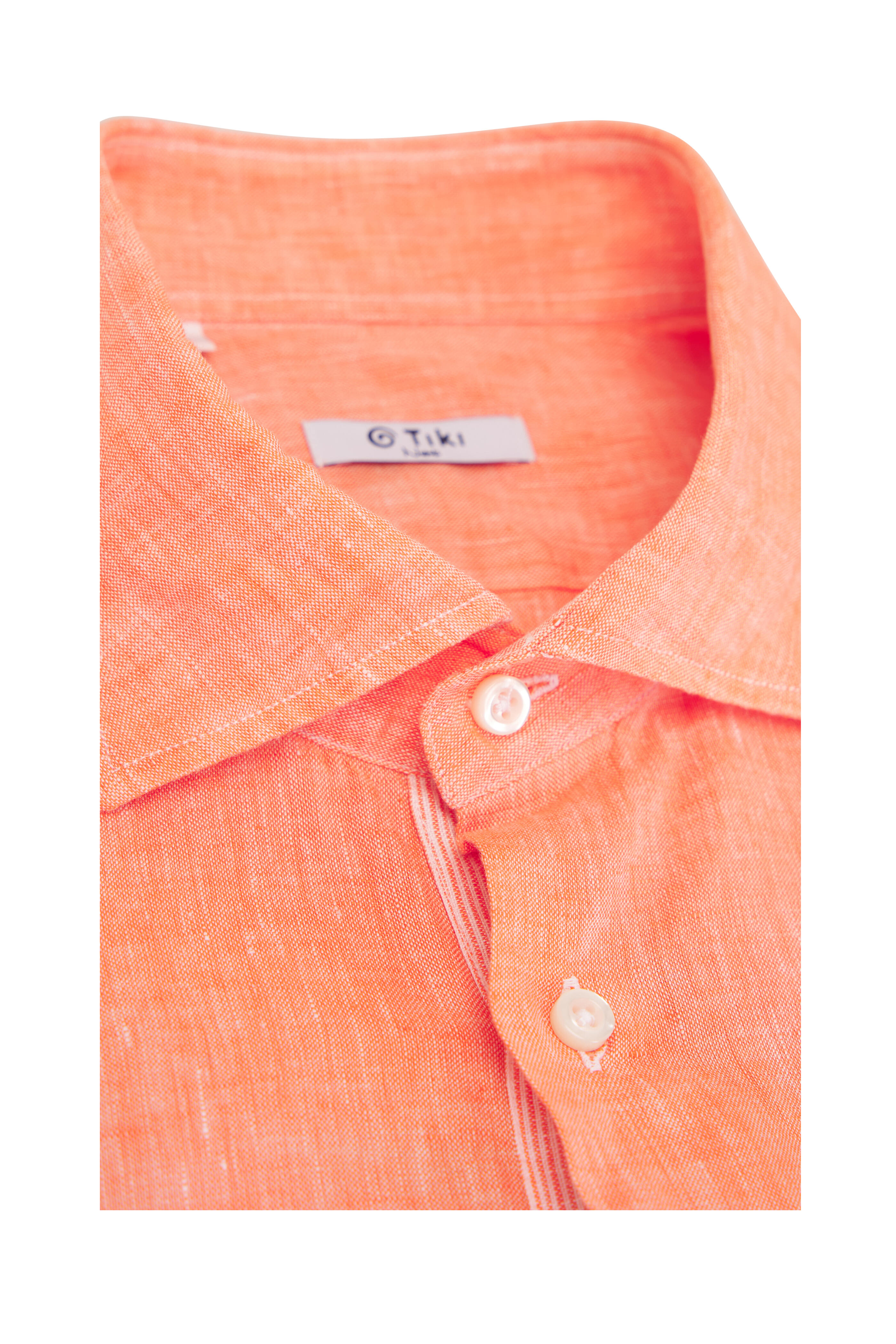 Spread collar. Button front closure. Single-button mitered cuffs. Made in Italy. 100% linen. Machine wash.
