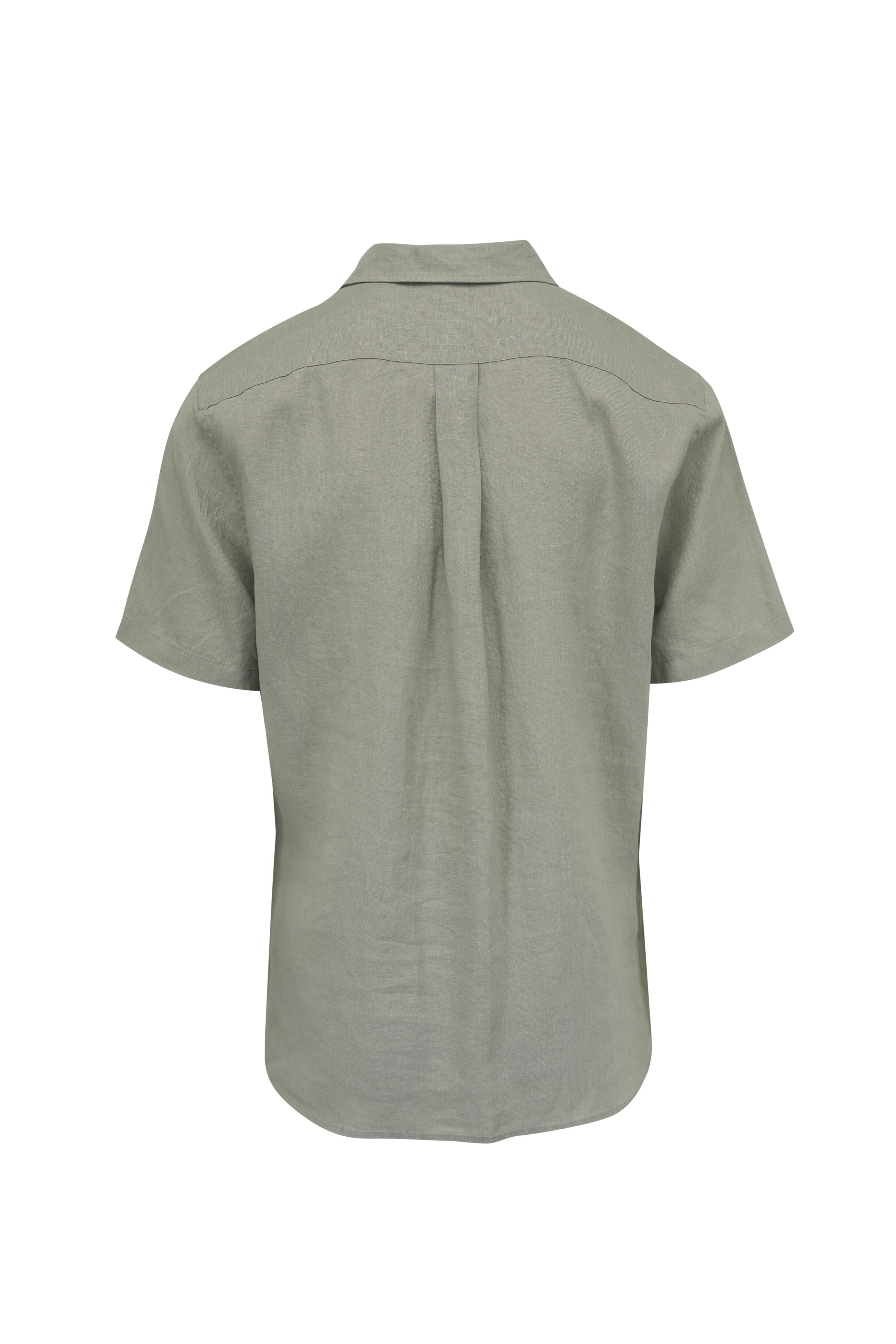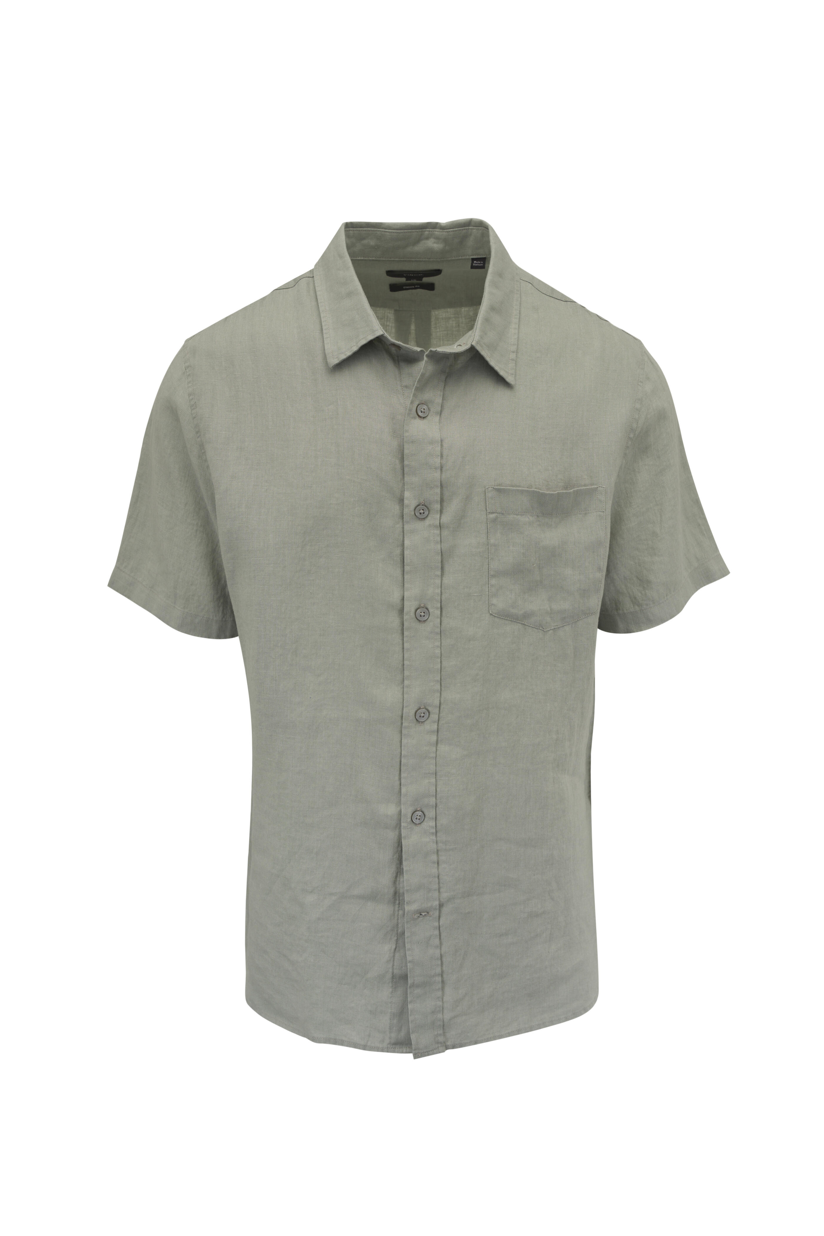 Spread collar. French front button placket. Shoulder yoke and side pleats at the back. Shirttail hem. Imported. 100% linen. Machine wash.
