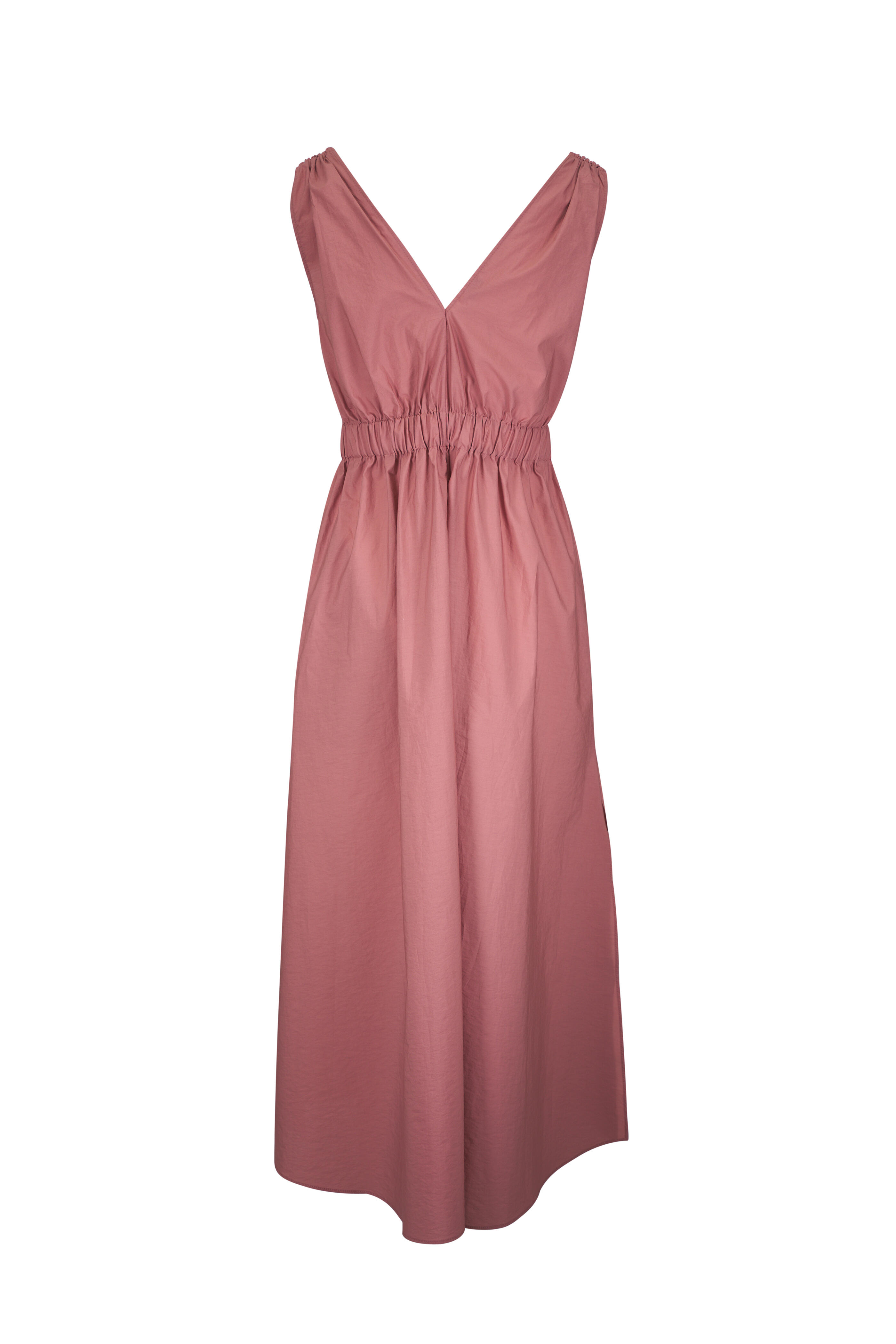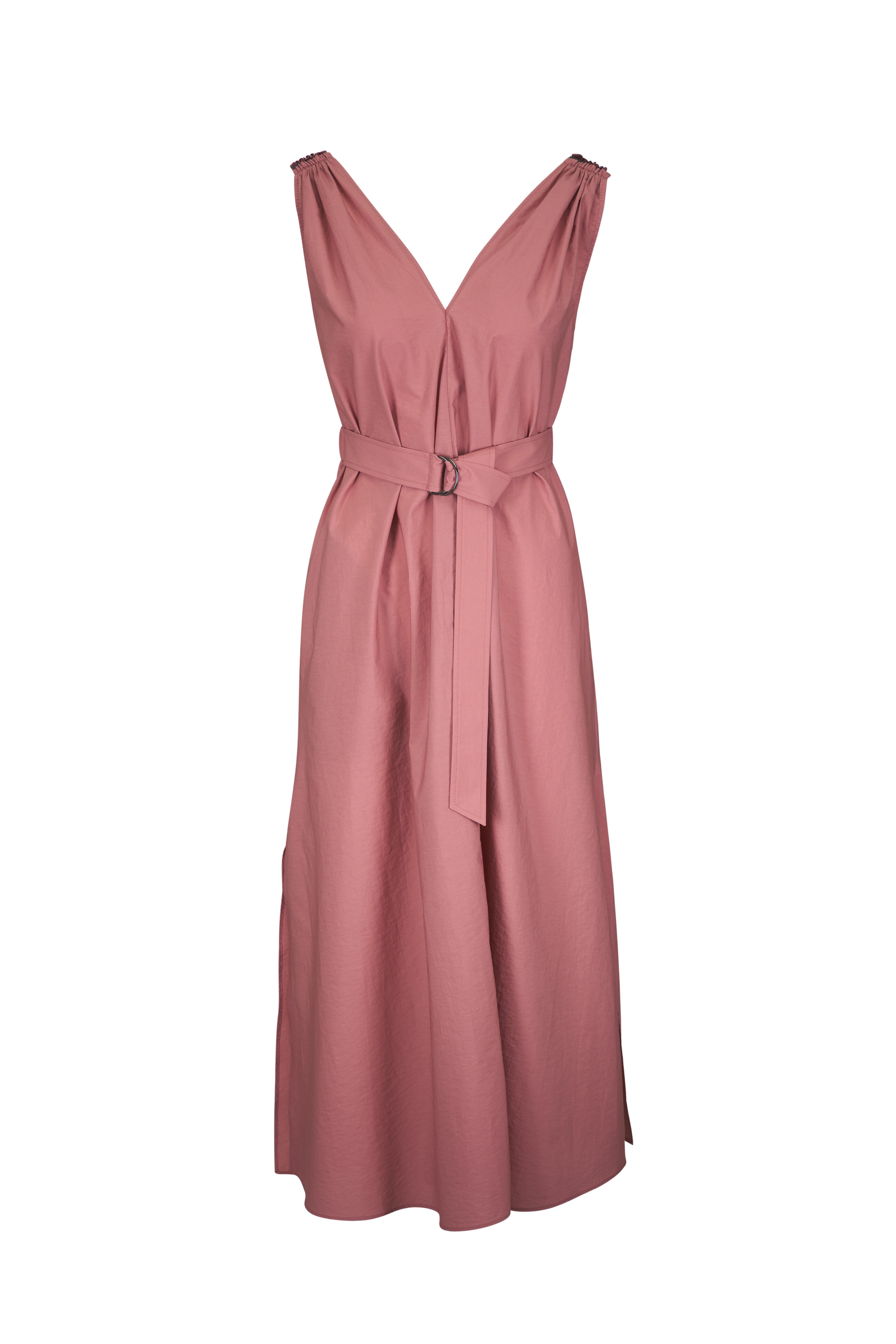V neck; v back. Pullover style. Attached D belt; elasticized back. Side slip pockets. sleeveless; monili detail on shoulders. Splits at hem. Made in Italy. Shoulder to hem 51" (size s). 75% cotton, 25% polyamide. Dry clean.