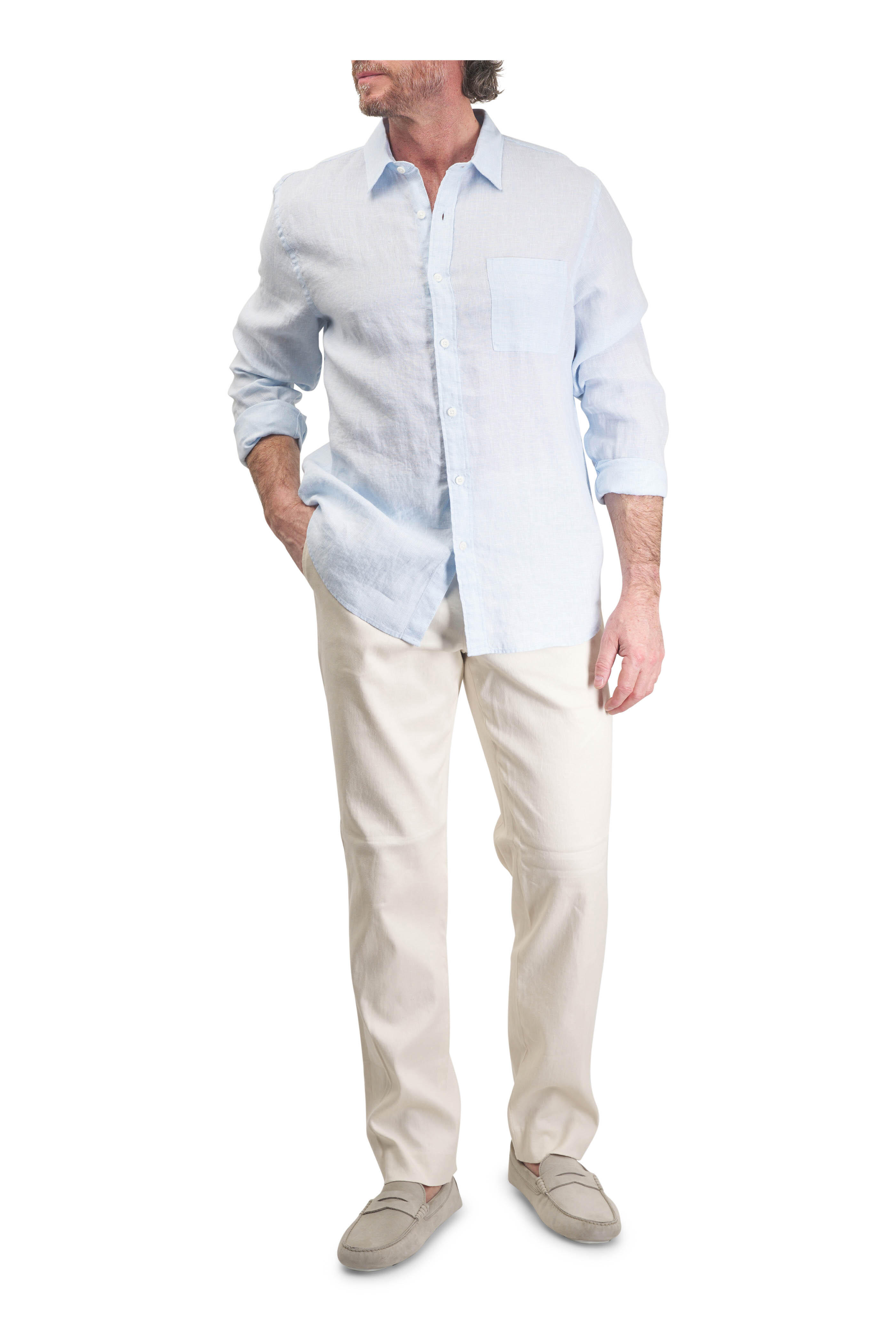 Spread collar. Front button placket. Chest patch pocket. Single-button barrel cuffs. Imported. 100% linen. Machine wash.
