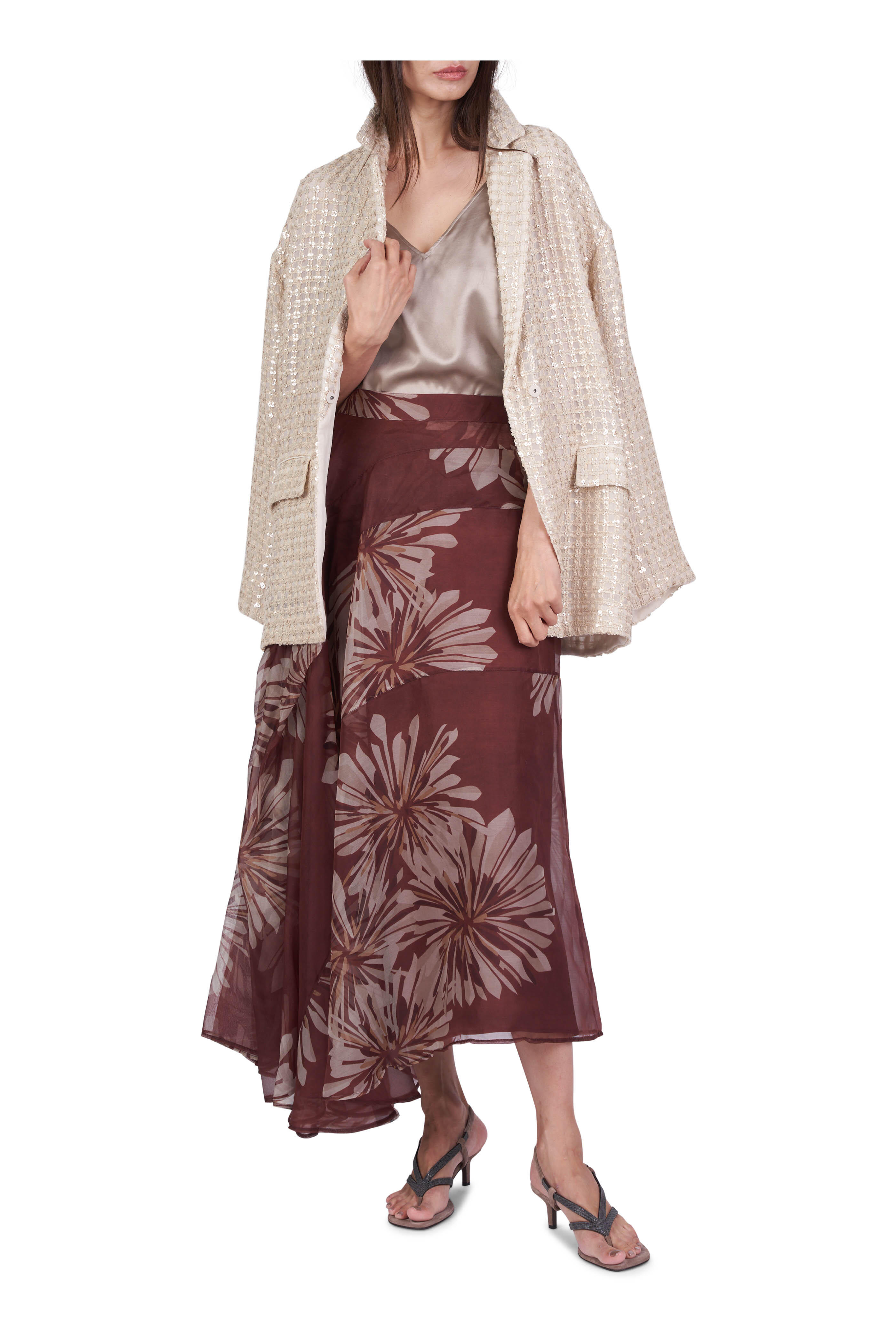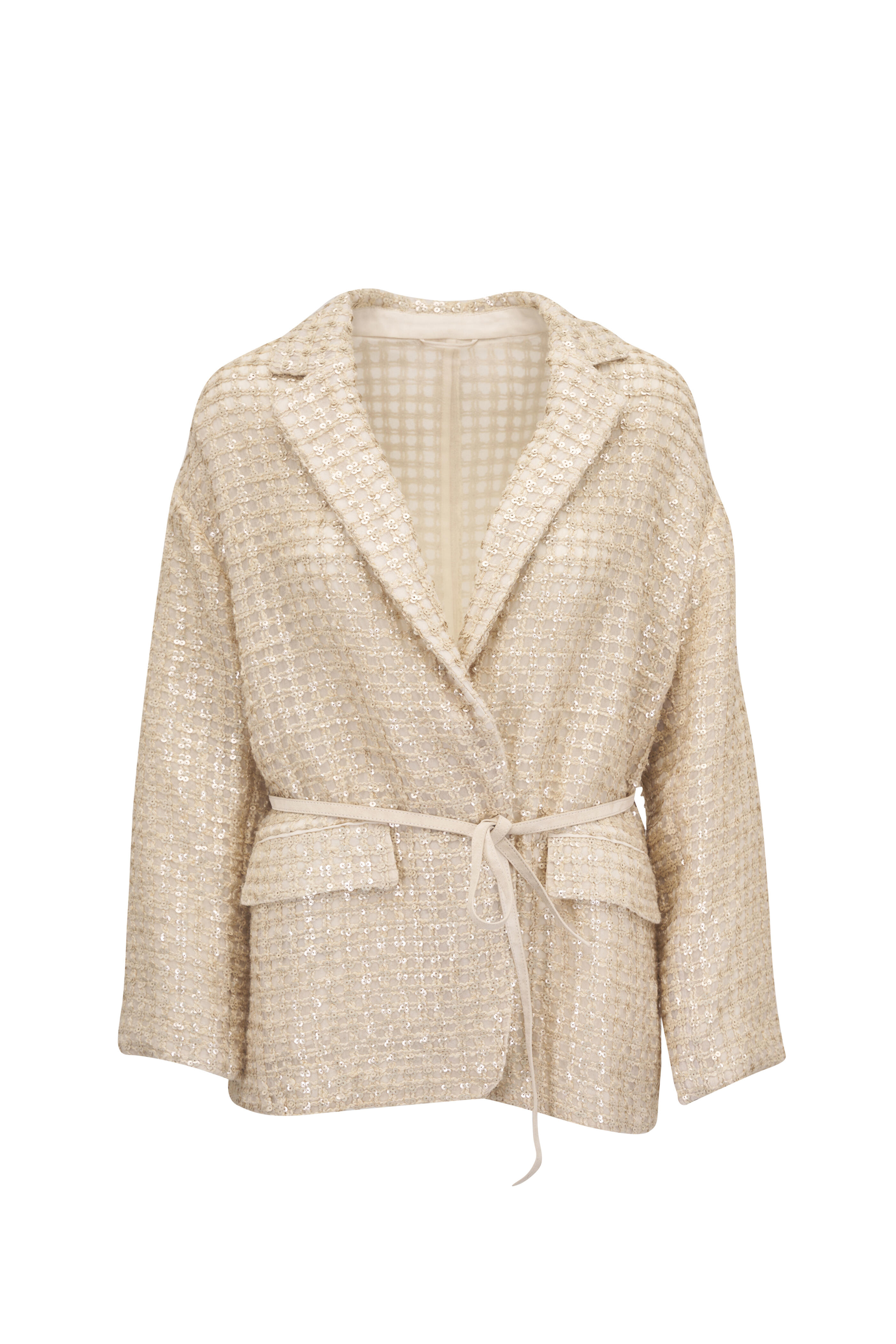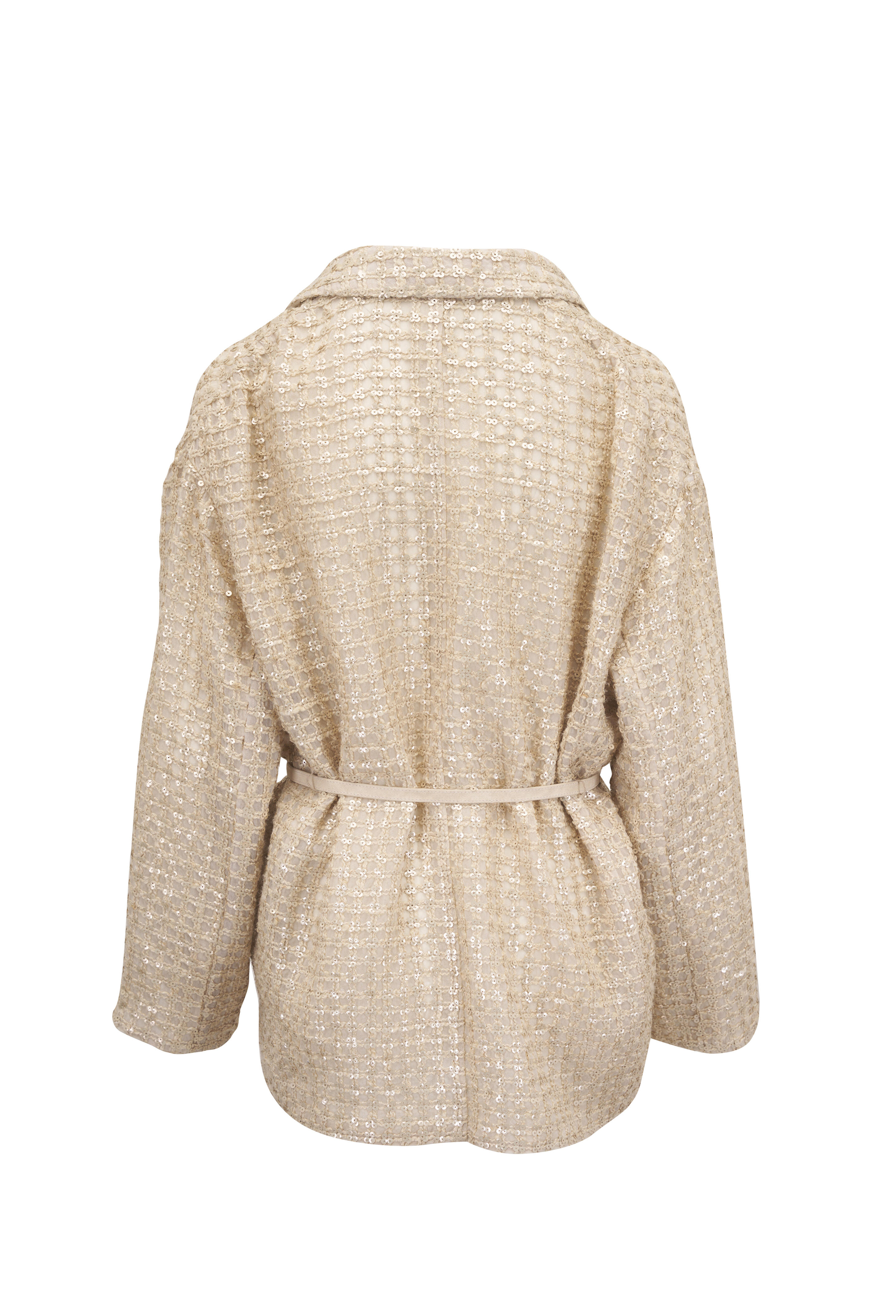 Horn button closure. Notched lapel. Hand pockets with flap. Detachable tie belt. Special workmanship. Made in Italy. 100% Silk. Dry clean.