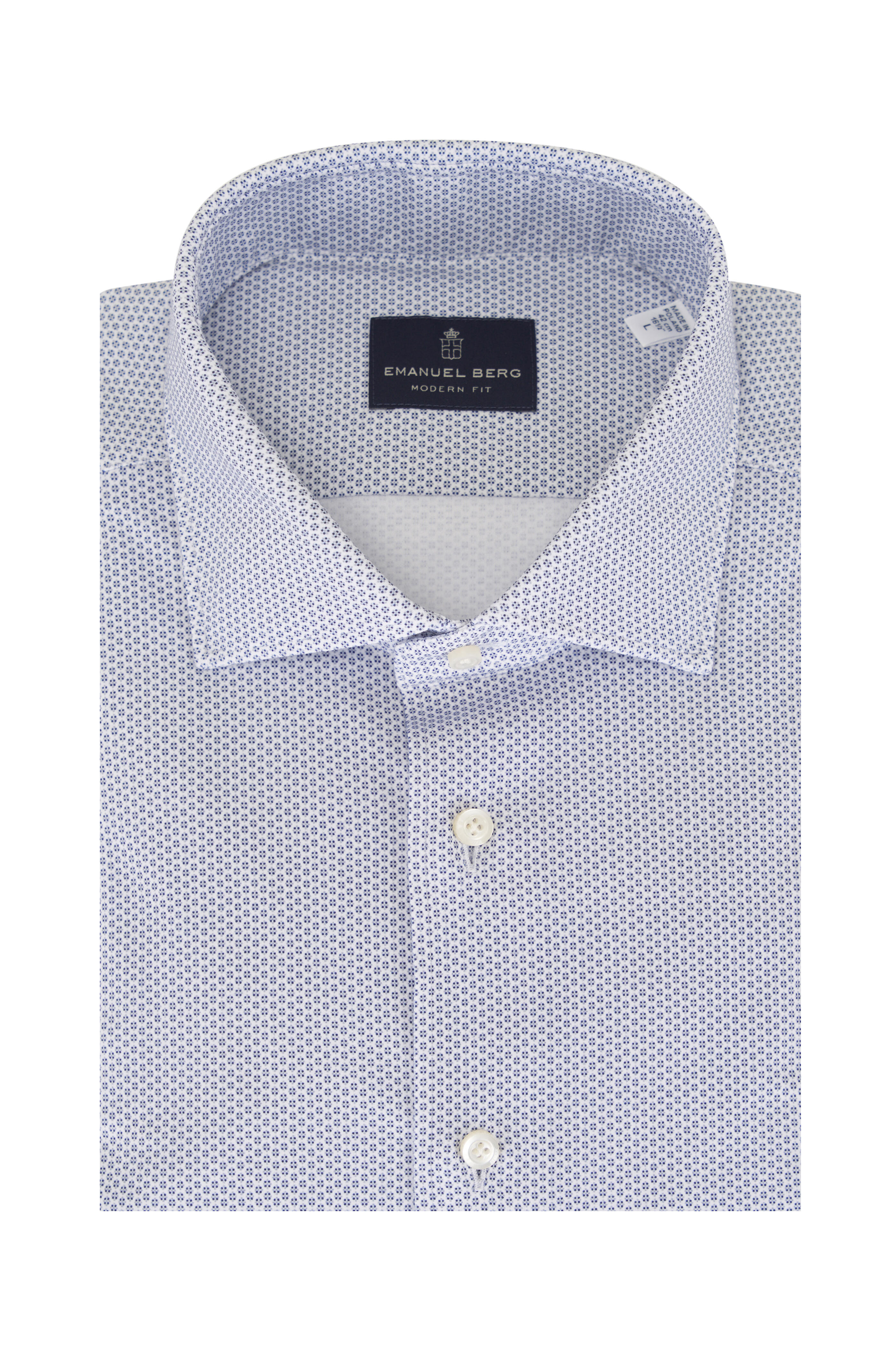 Spread collar. French front button placket. Adjustable single button mitered cuffs. Imported. Modern fit. 89% cotton, 11% elastane. Machine wash.