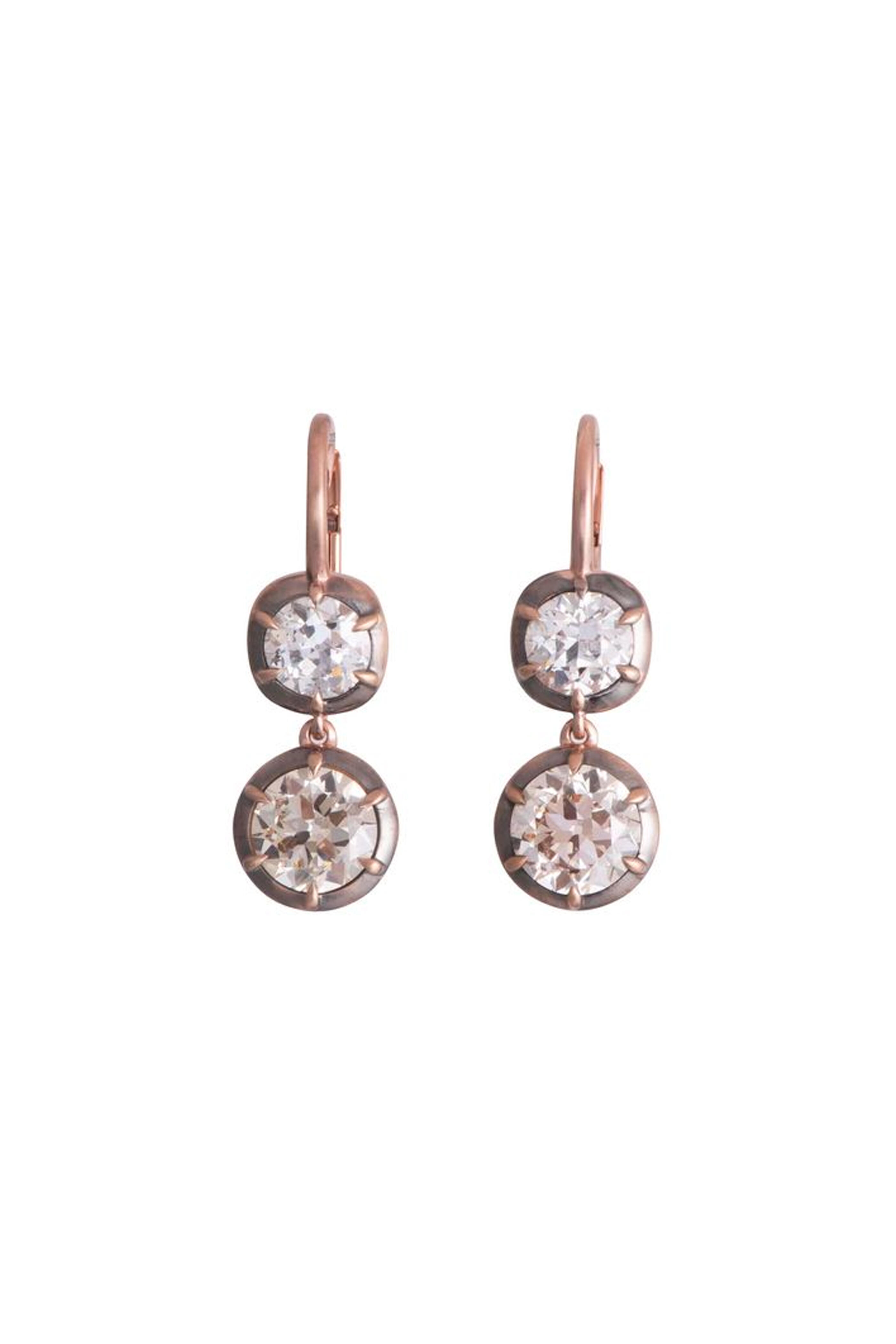 14k rose gold. Diamond. Old European cut diamond. Double drop design. White gold bezel. Drop style. Prong setting. Latch back. Made in the USA.