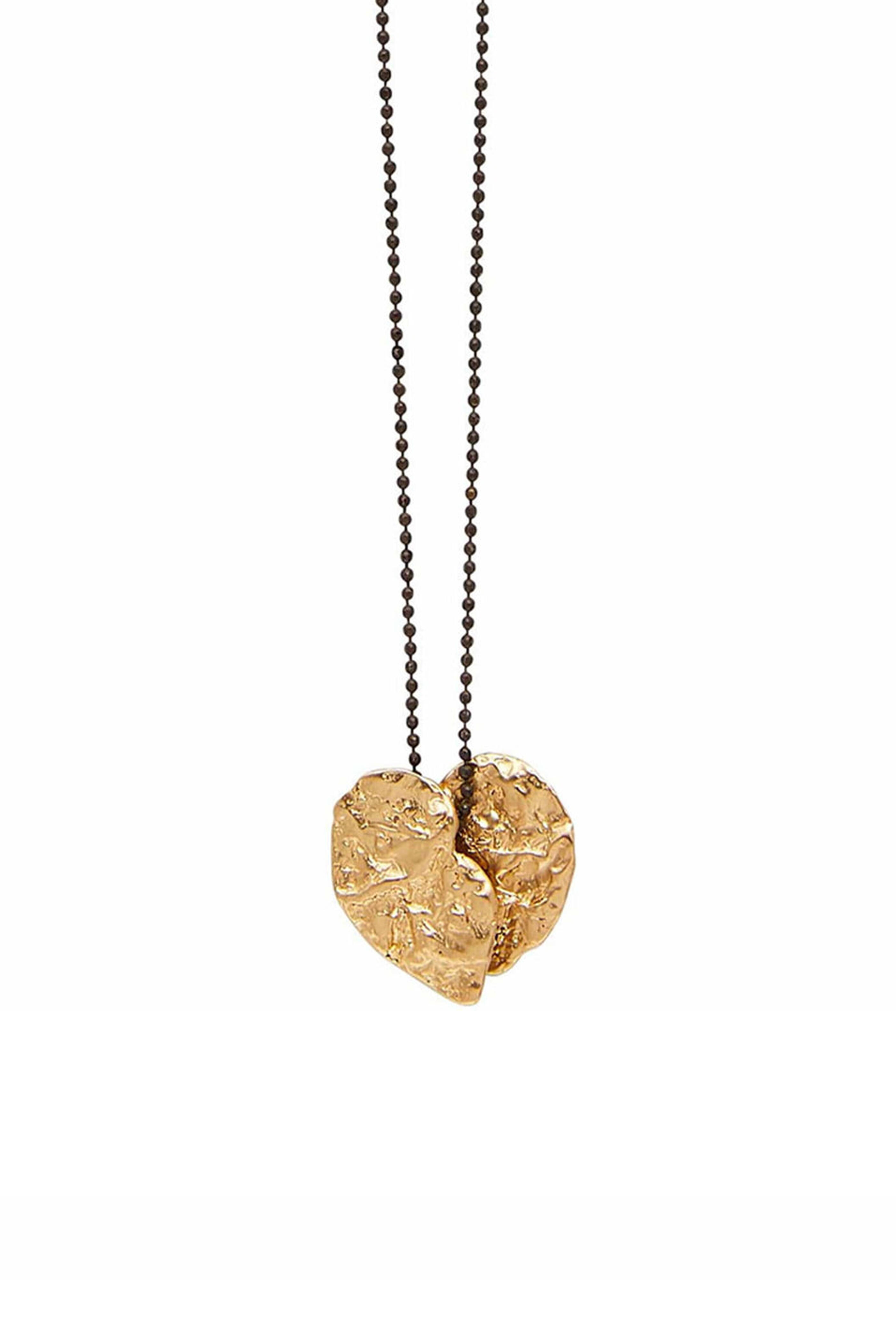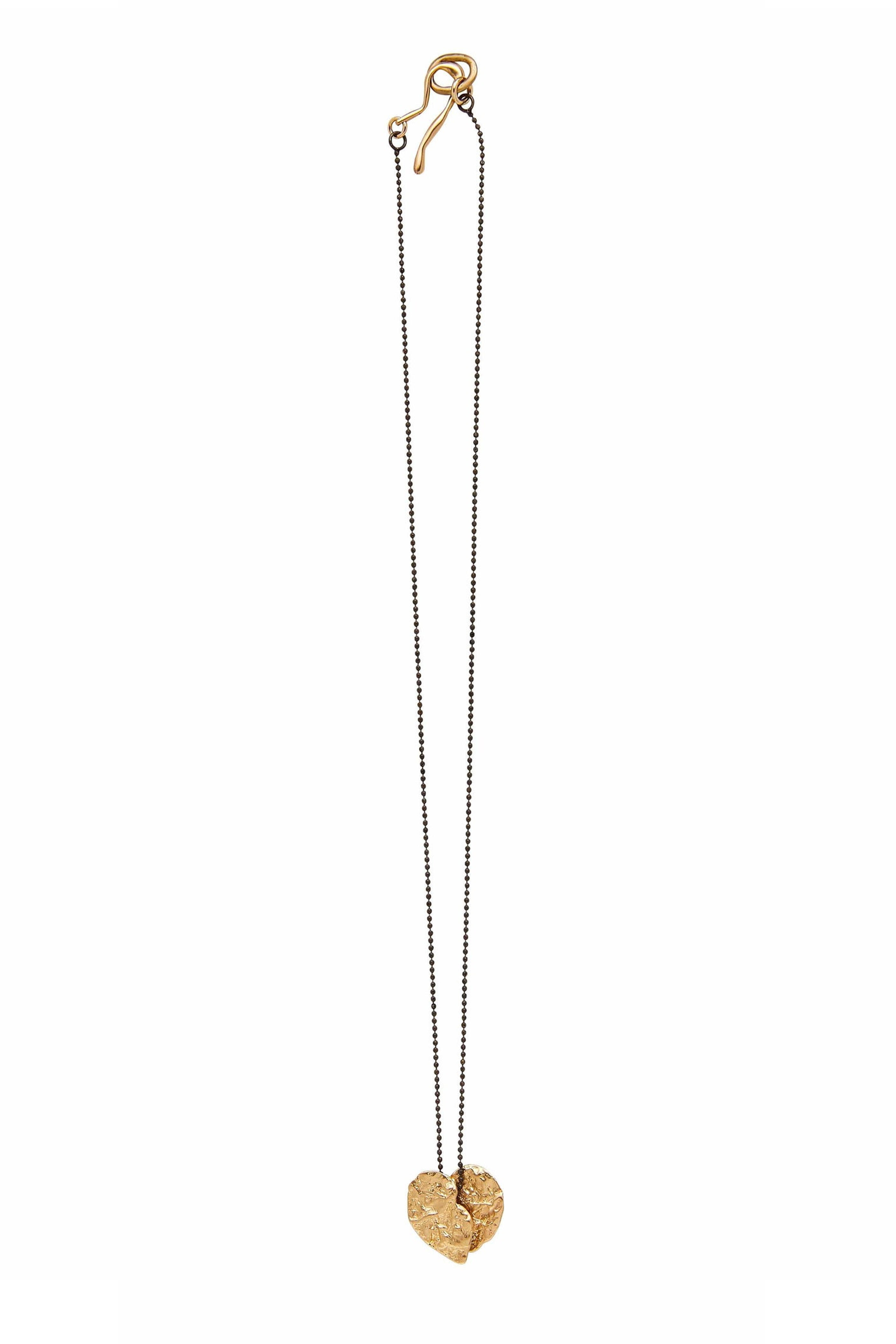 Bronze. Oxidized silver. Heart design. Engraved detailing. Parts of a heart overlay each other and create a primitive interpretation of a broken heart put back together.. Ball chain. Toggle hook clasps. Limited edition. Handcrafted in the USA. Pendant: 0.75”.