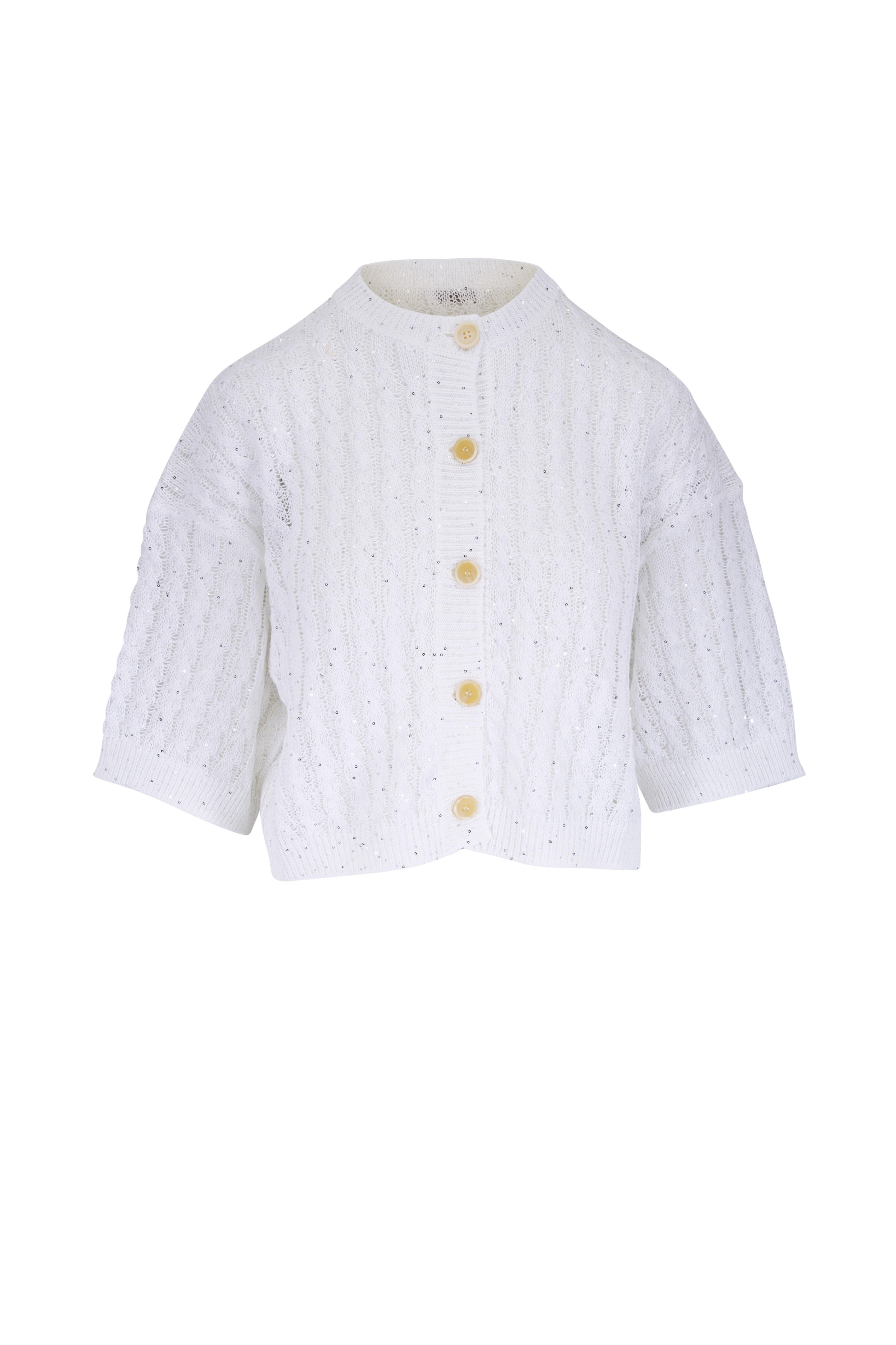 Crew neckline. Five-button closure. Cropped fit. Paillette detailing. Made in Italy. 94% linen, 6% nylon. Dry clean.
