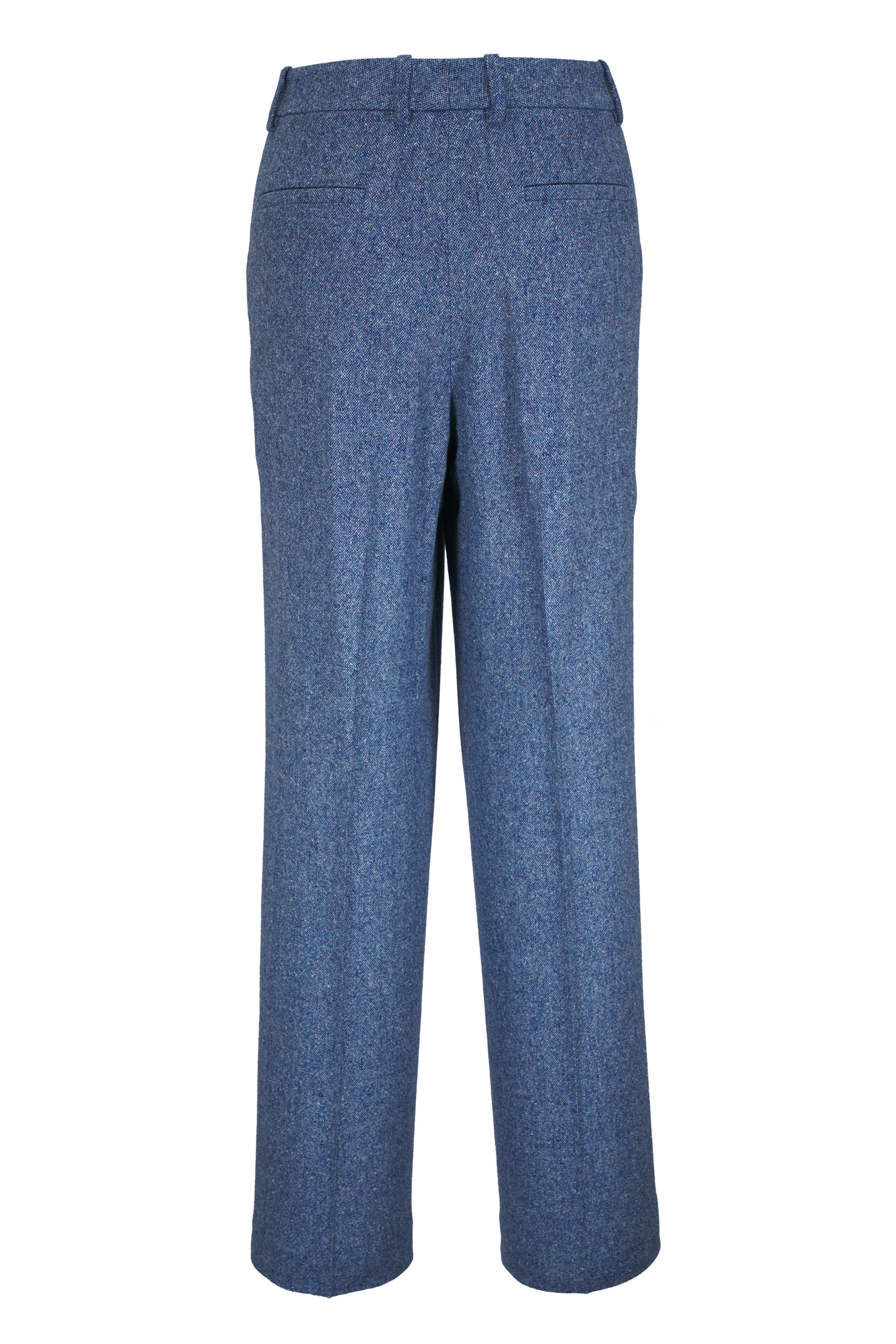 Zip fly; hook-and-bar closure. Banded waist; belt loops. Side slip pockets; back welt pockets. Back waist darts. Imported. Inseam: 32.5". Leg opening: 20.5". High rise. 29% wool, 29 polyester, 29% acrylic, 9% silk, 2% polyamide, 2% elastane. Dry clean.