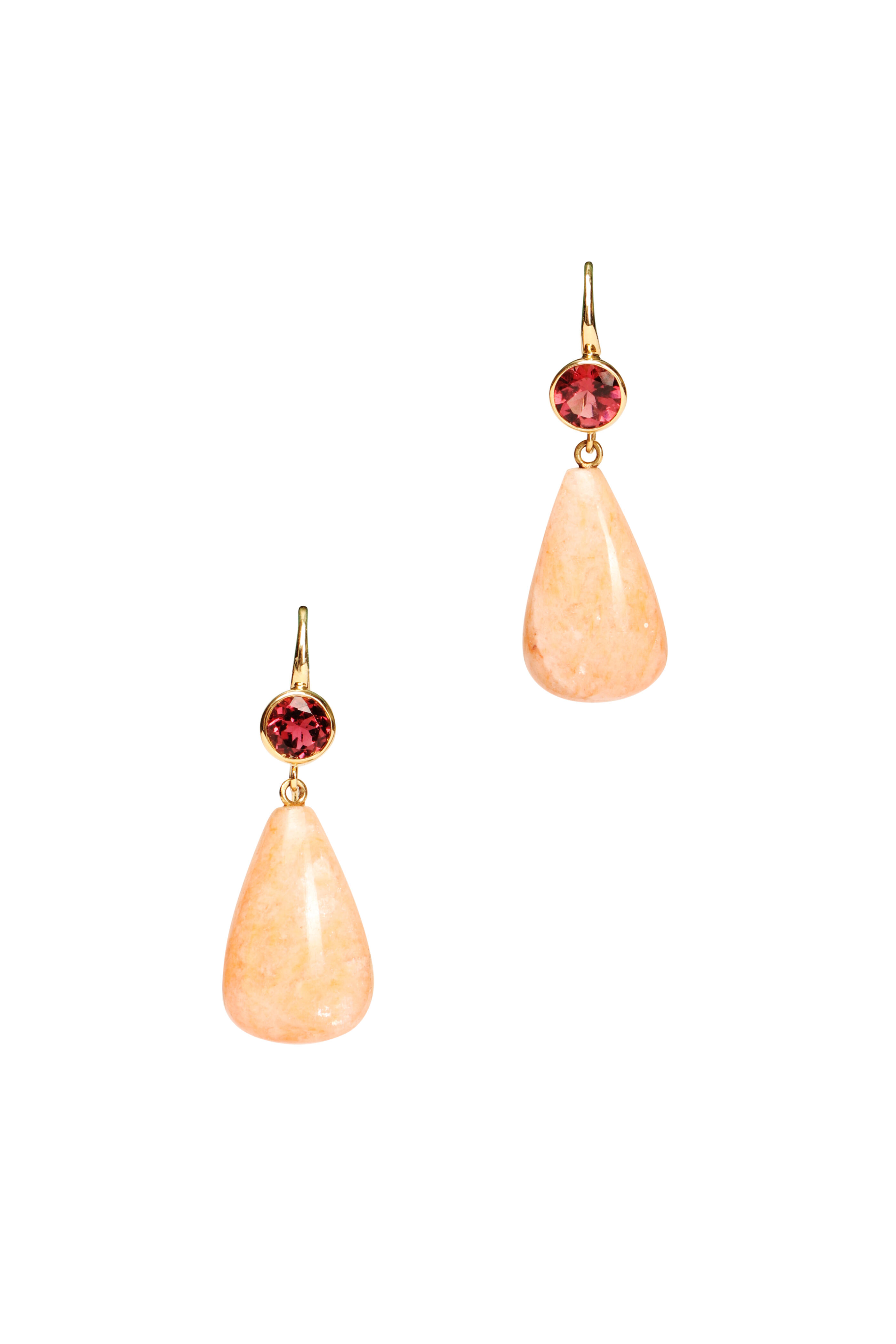 18k yellow gold. Pink tourmaline. Guava. Gold crownwork bezel setting. Drop style. Wire back. Handmade in New York.