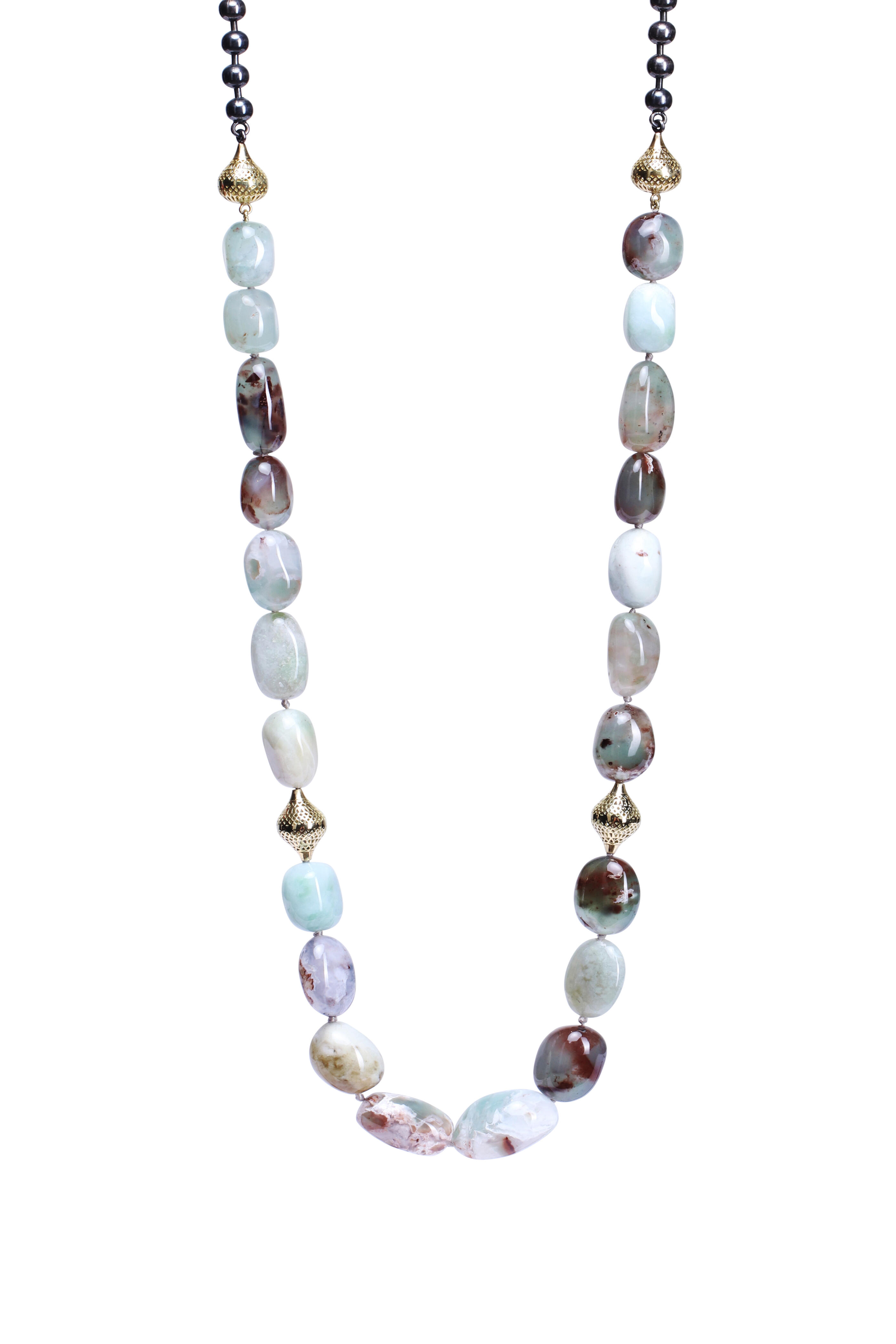 18k yellow gold. Aquaprase. Featuring gold crownwork rondelles. Oxidized silver chain. Beaded. Toggle clasps. Handmade in New York. Length: 29.5”.