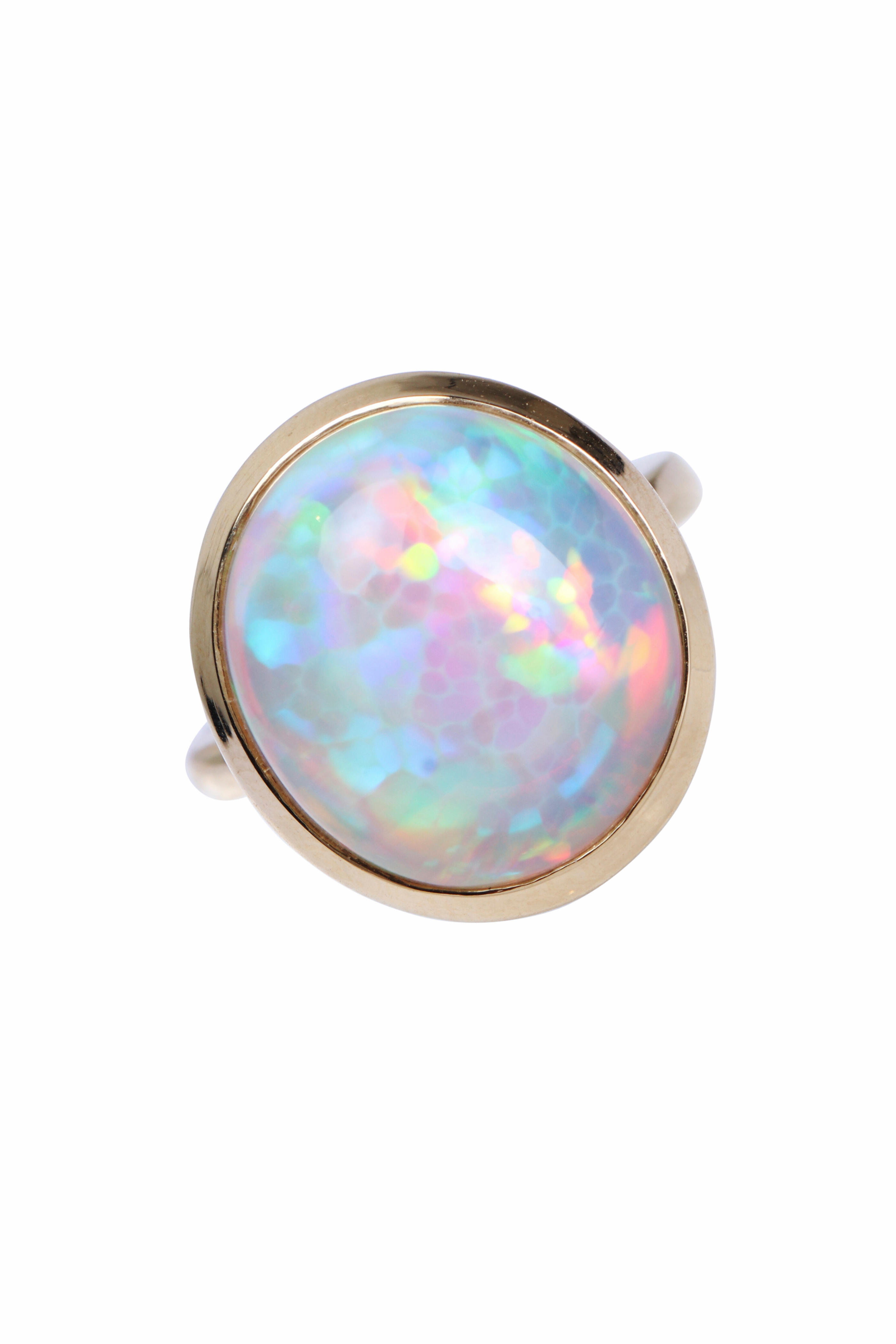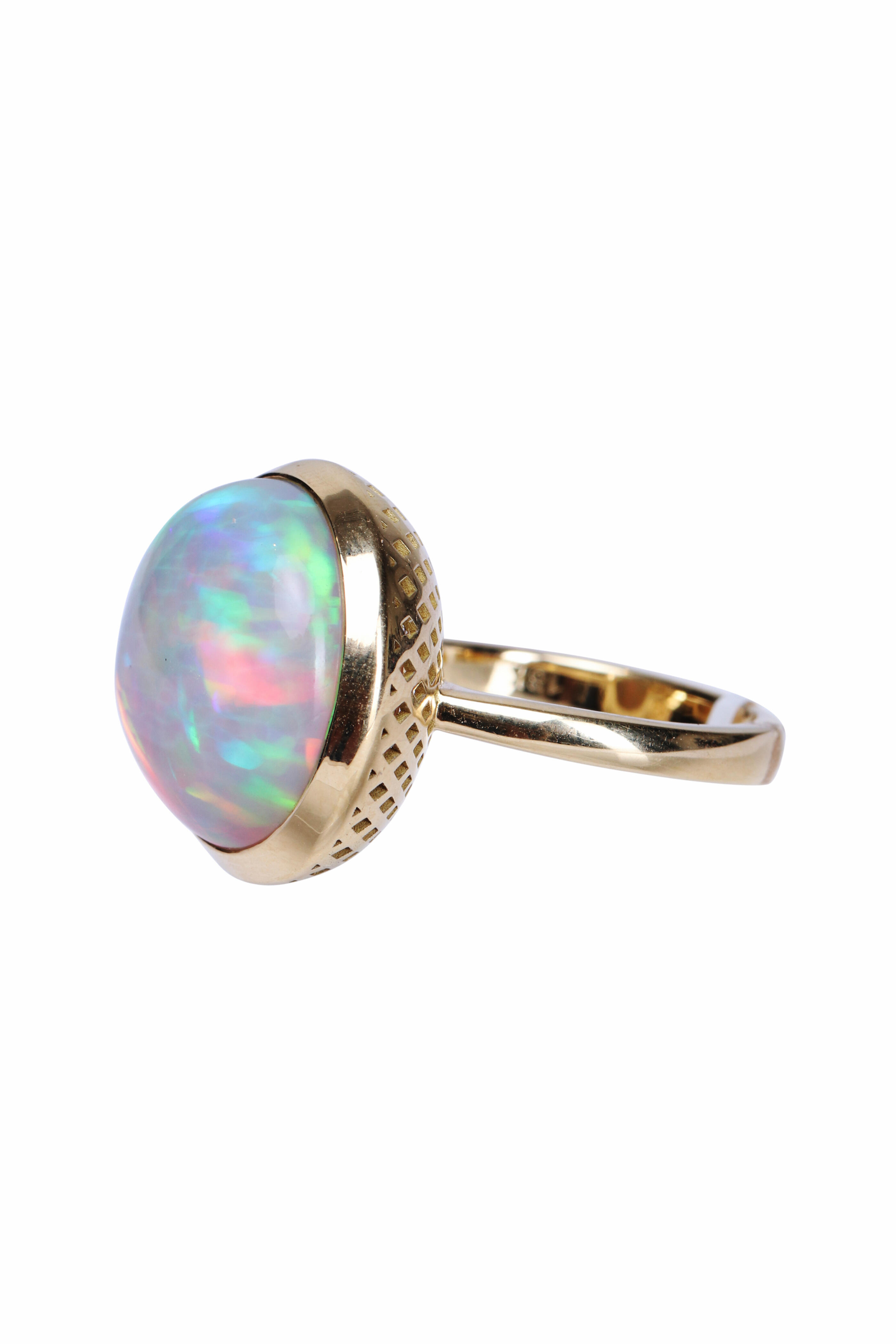 18k yellow gold. Opal 12.90 total carat weight. Round cut. Gold crownwork bezel setting. Handmade in New York. Ring size 6.75.