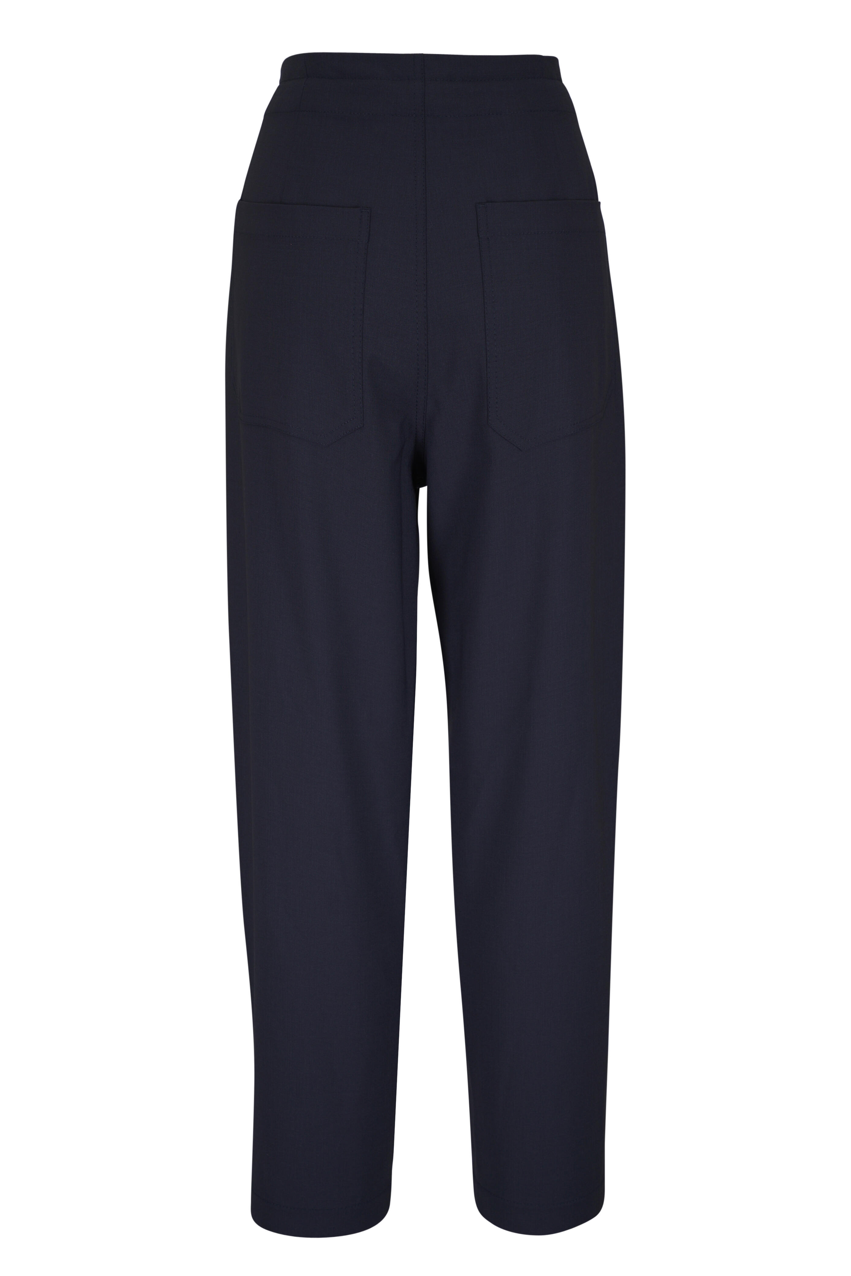 Drawstring; zip fly; button tab closure. Waist slip pockets; back patch pockets. Straight hem. Made in Italy. 28" Inseam (size 4). 75% Virgin wool, 23% polyamide, 2% elastane. Dry clean.
