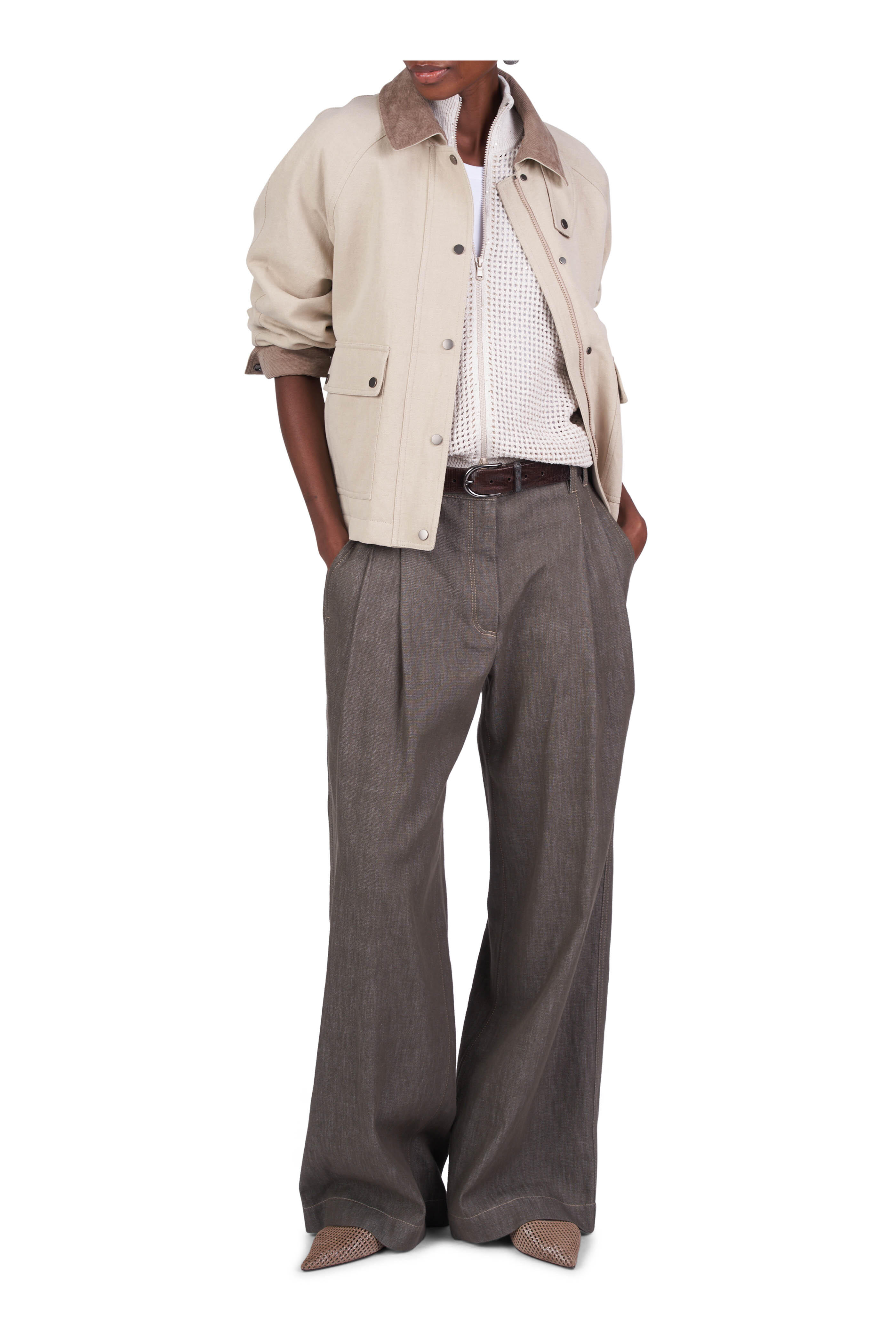 Zip fly; hook-and-eye closure. Banded waist; belt loops. Side slip pockets; back patch pockets. Double pleat. Monili detailing. Made in Italy. 100% cotton. Machine wash.
