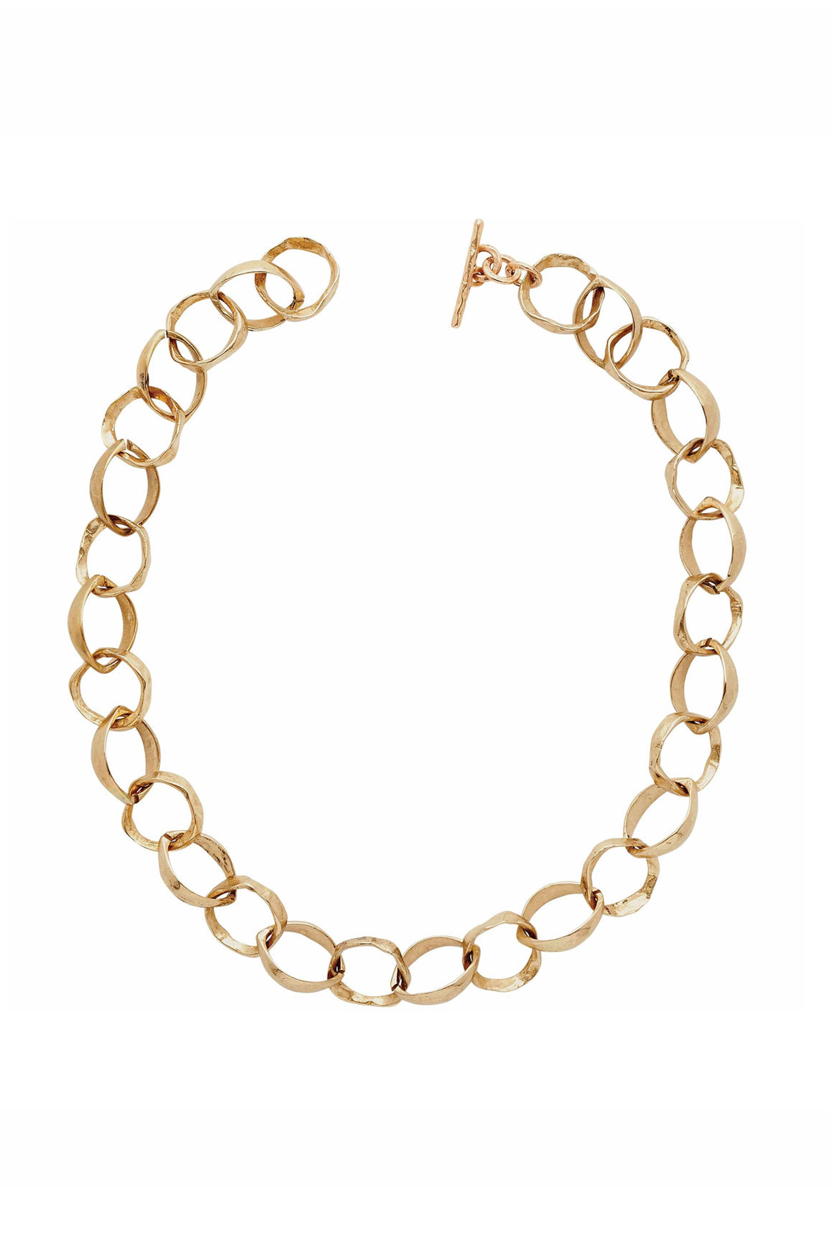 Bronze. Engraved detailing. Early primitive crafting techniques have influenced the imperfect form and texture of this design. Julie hand carved the waxes to create this hammered bronze link Roman chain necklace.. Links. Adjustable toggle clasps. Limited edition. Handcrafted in the USA. Length: 18”.